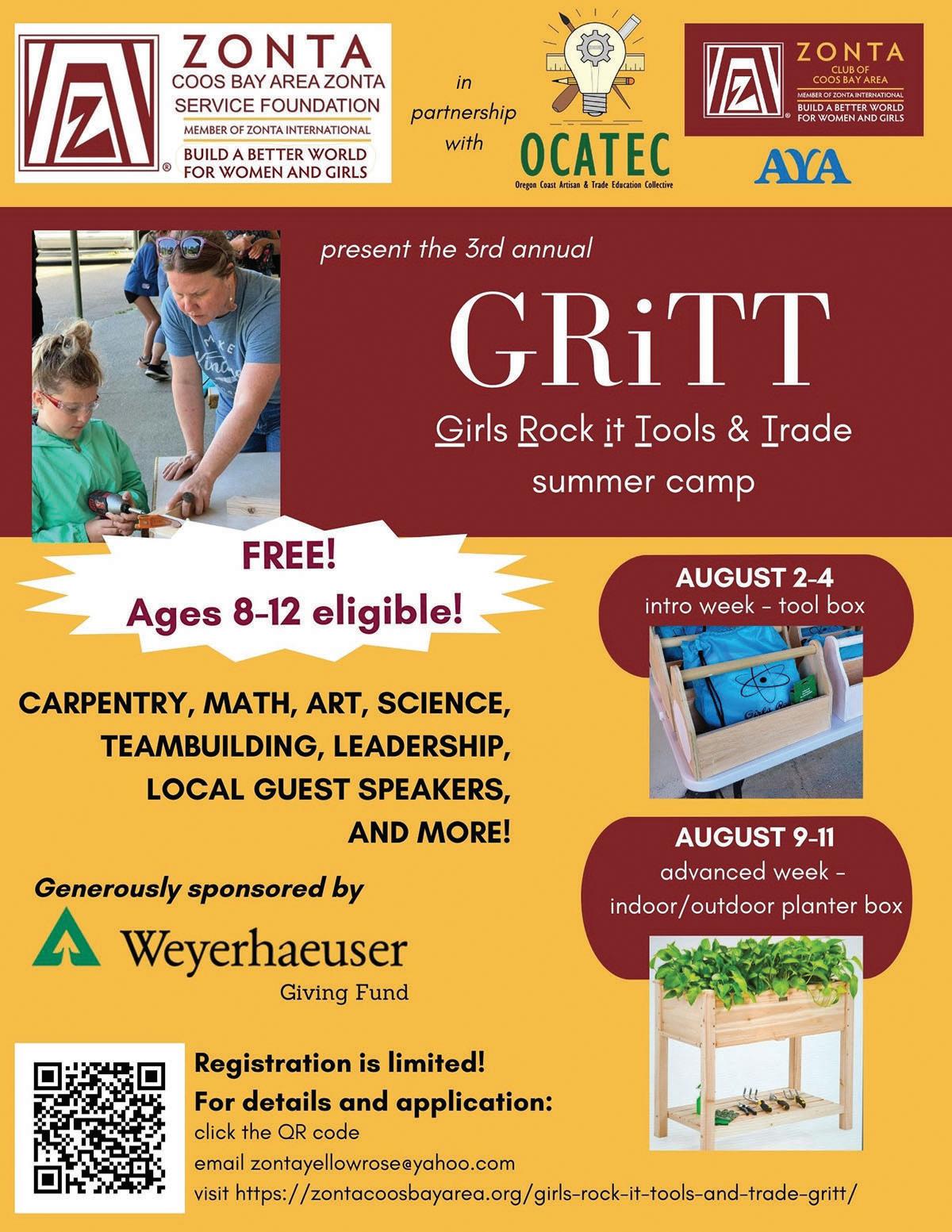 Bay Area and the Coos Bay Area Zonta Service Foundation are pleased to announce the third annual summer camp, Girls Rock it Tools & Trade (“GRiTT”).