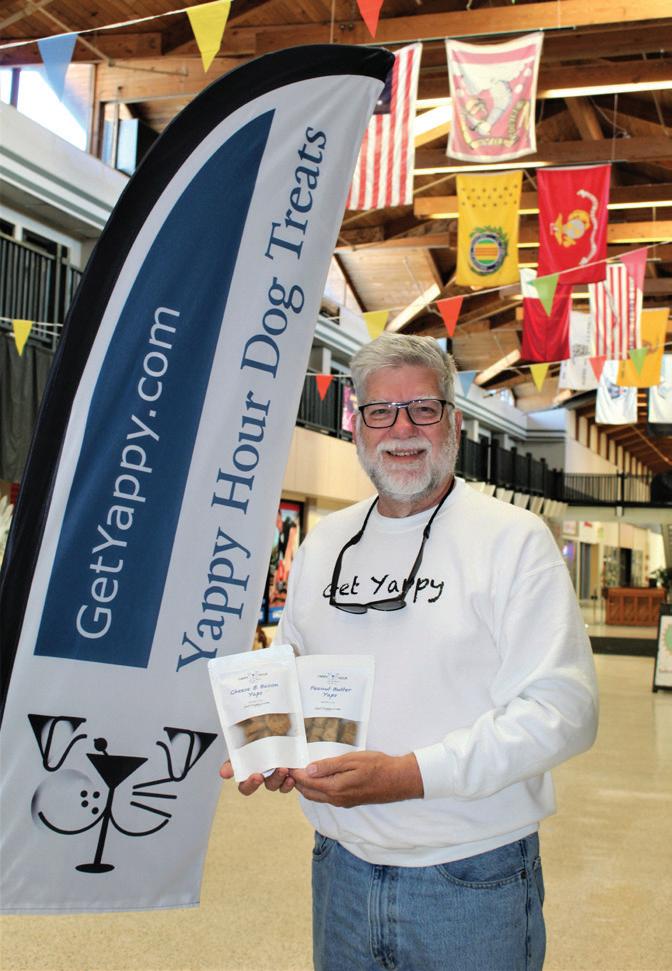 He now has six flavors of dog treats, five flavors of chews and two cat treats. His peanut butter treats are the top seller. He even offers a treats that you can shake over the top of food and a package of sampler treats he named the “BarYappy Hour continued on page 3