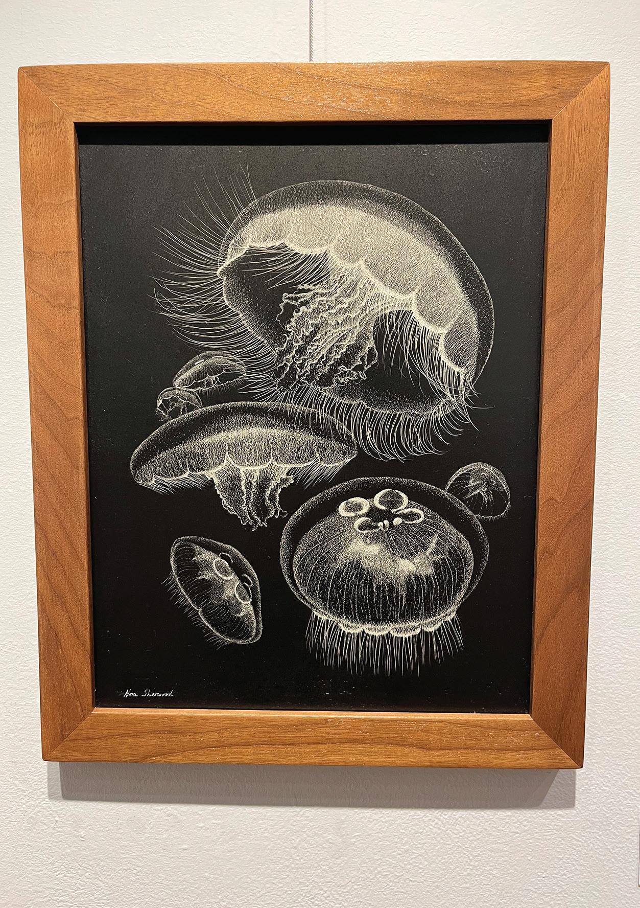 Scratchboard art done by Nora Sherwood’s of “Moon Jellies.”