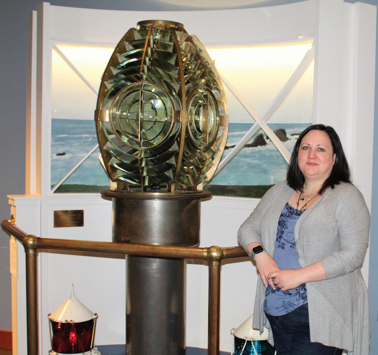 Coos History Museum executive director Heather Christenbury stands next to a Fresnel lighthouse lens on display at the museum. Christenbury was a curator at the museum and interim director prior to accepting her new position as executive director in June.