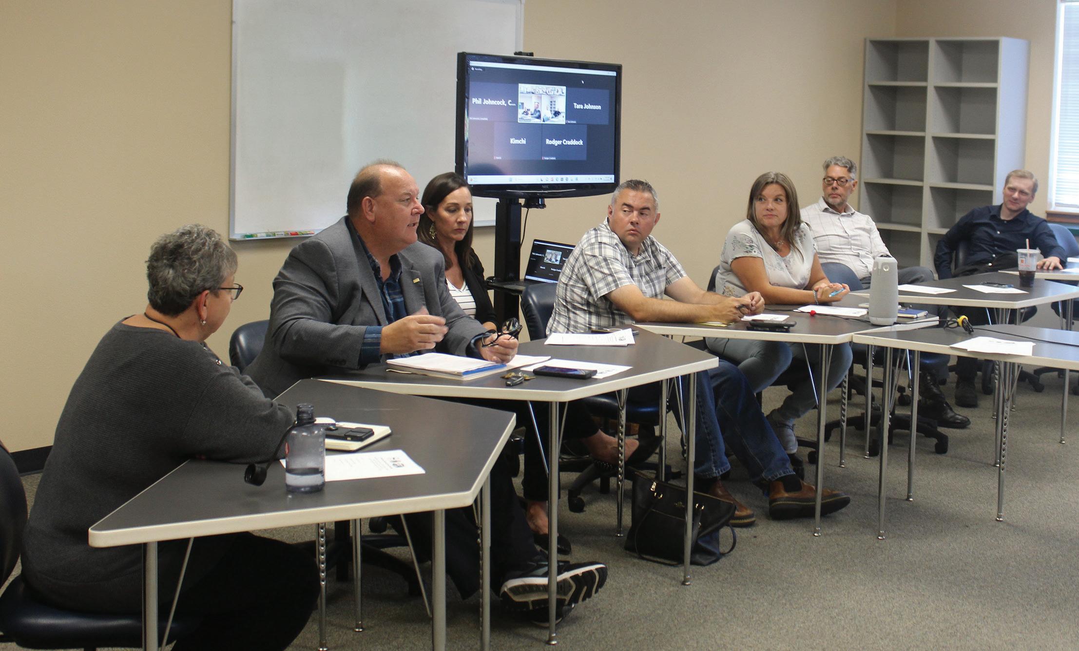 Andrew Brainard, center, the executive director of the Coordinated Office of Houselessness, discusses ongoing projects with the board members, from left, David Milliron, Jessica Engelke, Nichole Rutherford and David Geels.