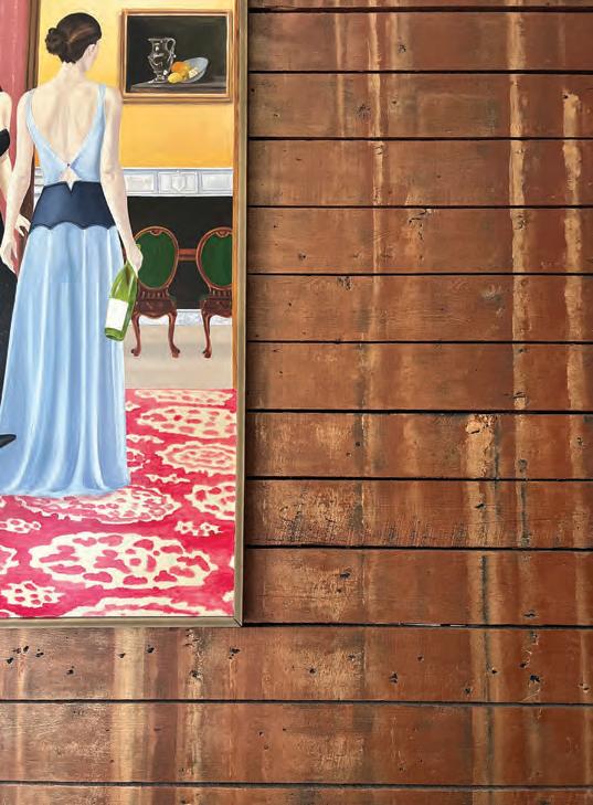 Catercorner to Sloan’s soft dreamscapes, above a gold velvet loveseat, is the arresting work by Uruguayan/ Chilean artist Pablo Santibaez Servat, titled “Circus III.” The piece is confrontational, a shock to the senses with loud color, brash nudity, caricatural illustrations, and a dead lion. It’s an unexpected move, placing these two drastically different styles of art so close to each other. But somehow, it works.