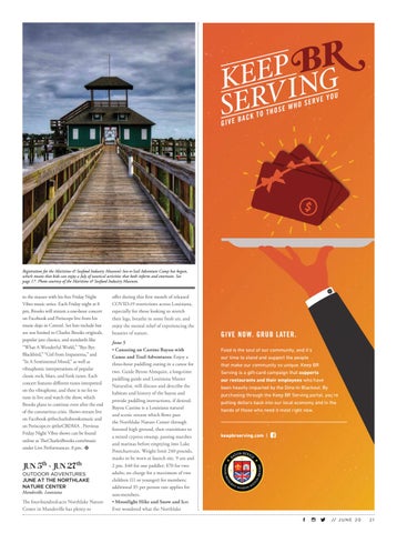 offer during this first month of released COVID-19 restrictions across Louisiana, especially for those looking to stretch their legs, breathe in some fresh air, and enjoy the mental relief of experiencing the beauties of nature. June 5 • Canoeing on Castine Bayou with Canoe and Trail Adventures: Enjoy a three-hour paddling outing in a canoe for two. Guide Byron Almquist, a long-time paddling guide and Louisiana Master Naturalist, will discuss and describe the habitats and history of the bayou and provide paddling instructions, if desired. Bayou Castine is a Louisiana natural and scenic stream which flows past the Northlake Nature Center through forested high ground, then transitions to a mixed cypress swamp, passing marshes and marinas before emptying into Lake Pontchartrain. Weight limit 240 pounds, masks to be worn at launch site. 9 am and 2 pm. $40 for one paddler; $70 for two adults; no charge for a maximum of two children (11 or younger) for members; additional $5 per person rate applies for non-members. • Moonlight Hike and Snow and Ice: Ever wondered what the Northlake