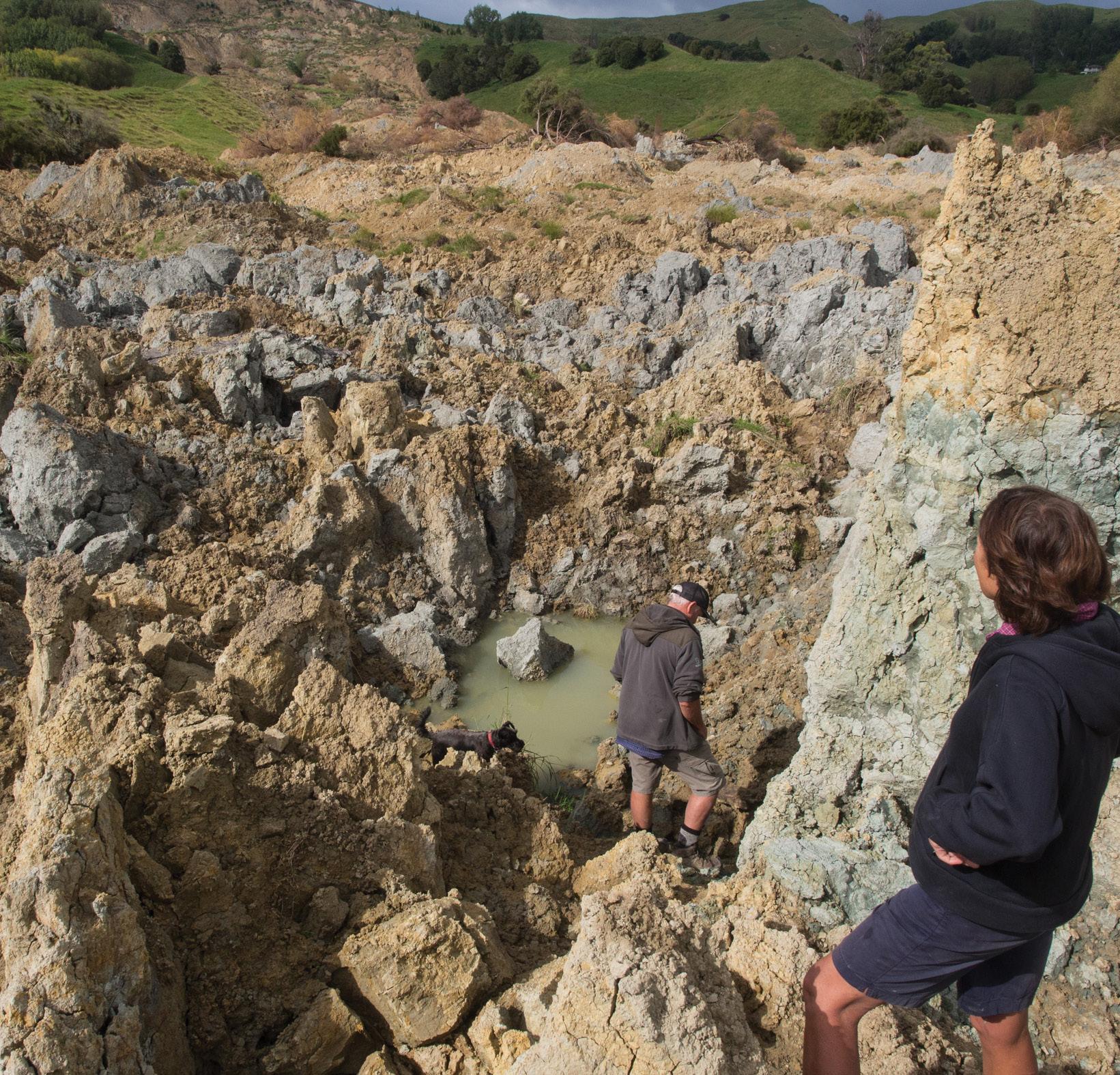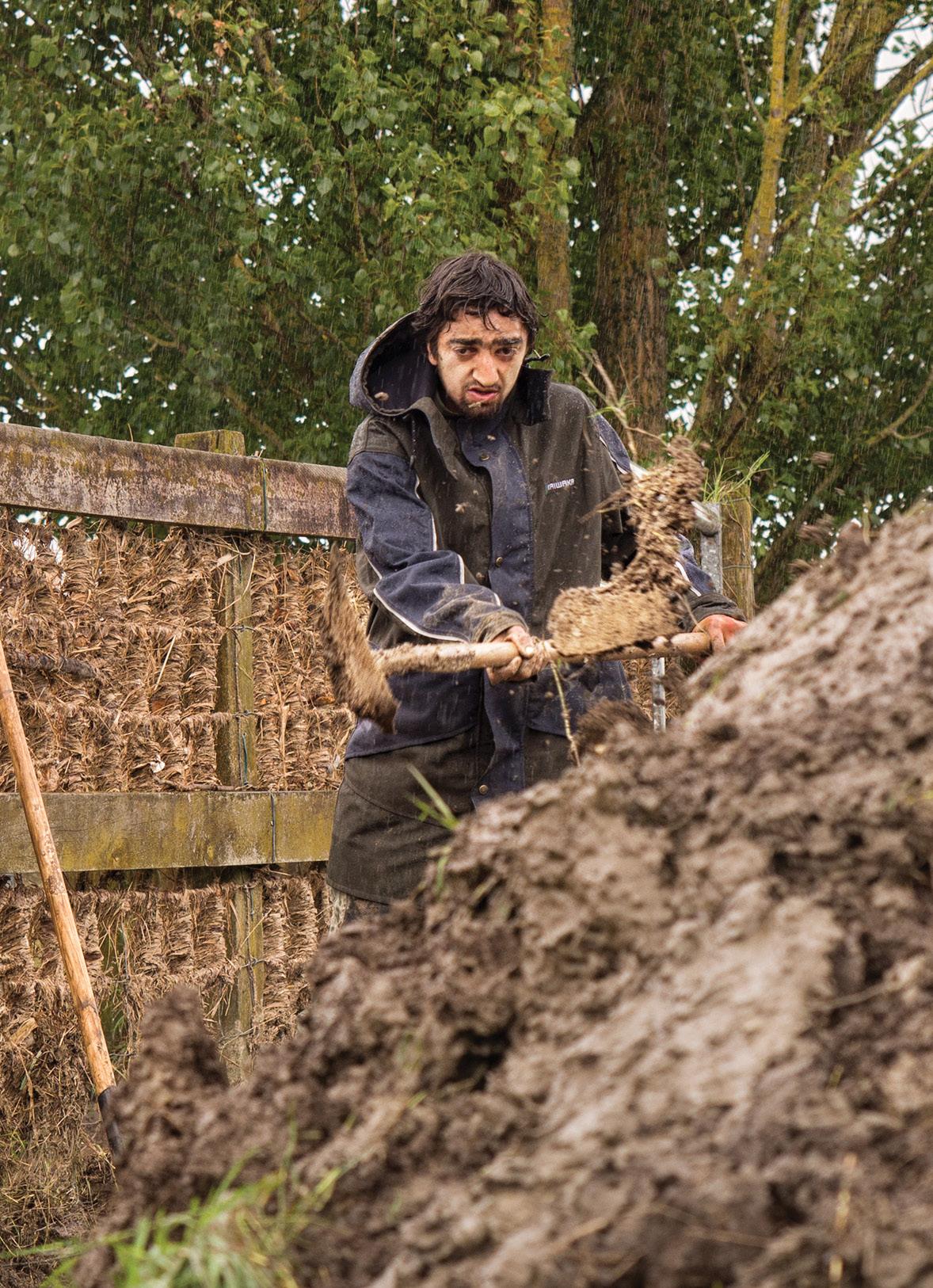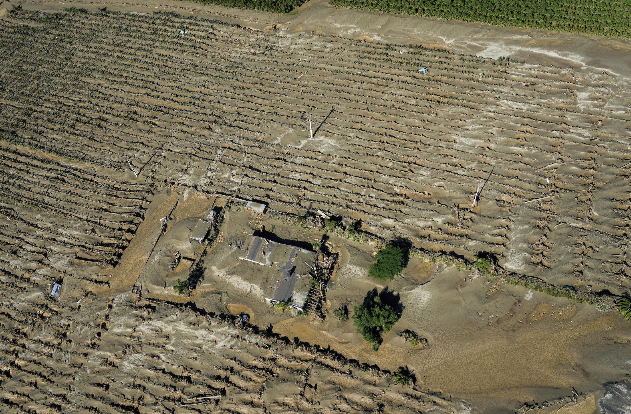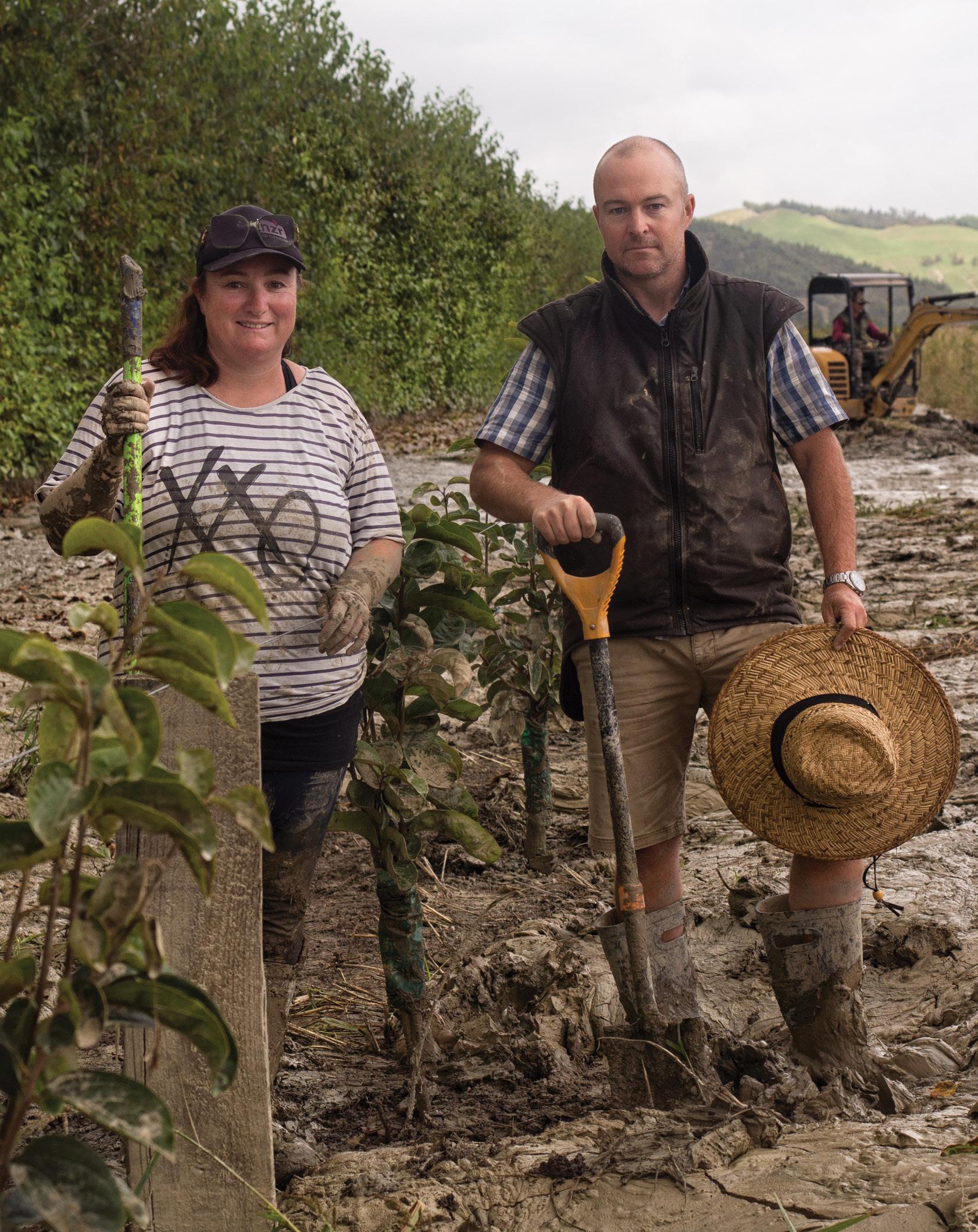 Top left: Crispin and Chick Bridge scramble over the glacier-like landscape of the 13ha landslide on their Manutuke property. Top right: Cameron Pihama, first year Growing Future Farmers cadet at the Jex-Blake’s Mangapoike Station, shovelling silt out of the yards at the Manutuke block. Above: Ahmed Supkan from Indonesia, an RSE worker works to clear onions from apple trees in Hawke’s Bay.