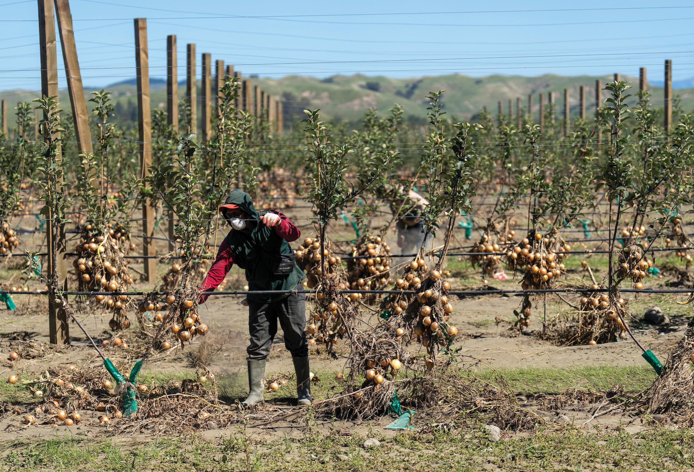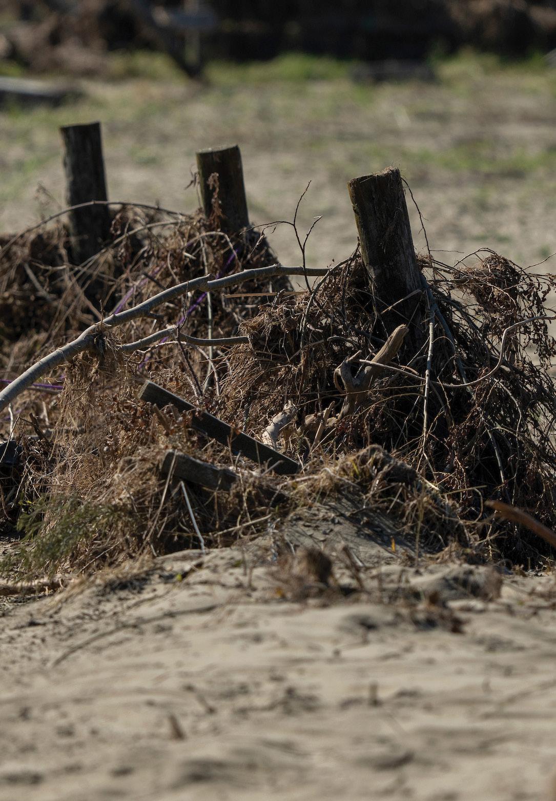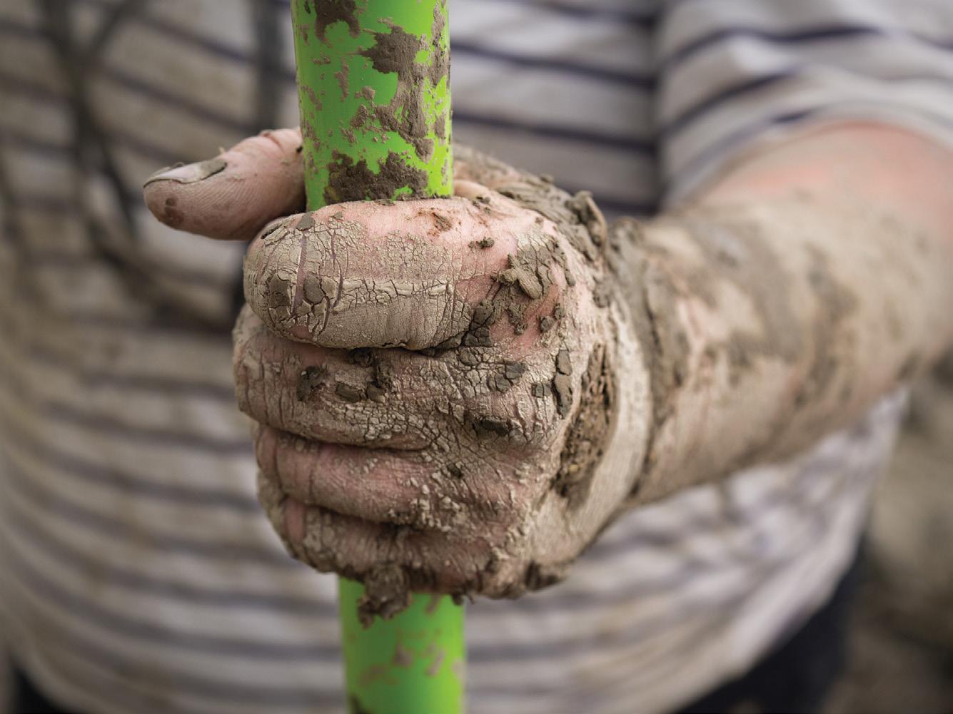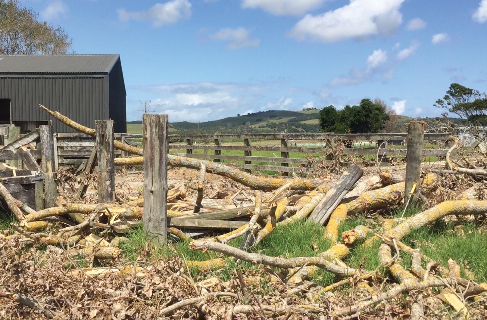 Top left: Crispin and Chick Bridge scramble over the glacier-like landscape of the 13ha landslide on their Manutuke property. Top right: Cameron Pihama, first year Growing Future Farmers cadet at the Jex-Blake’s Mangapoike Station, shovelling silt out of the yards at the Manutuke block. Above: Ahmed Supkan from Indonesia, an RSE worker works to clear onions from apple trees in Hawke’s Bay.