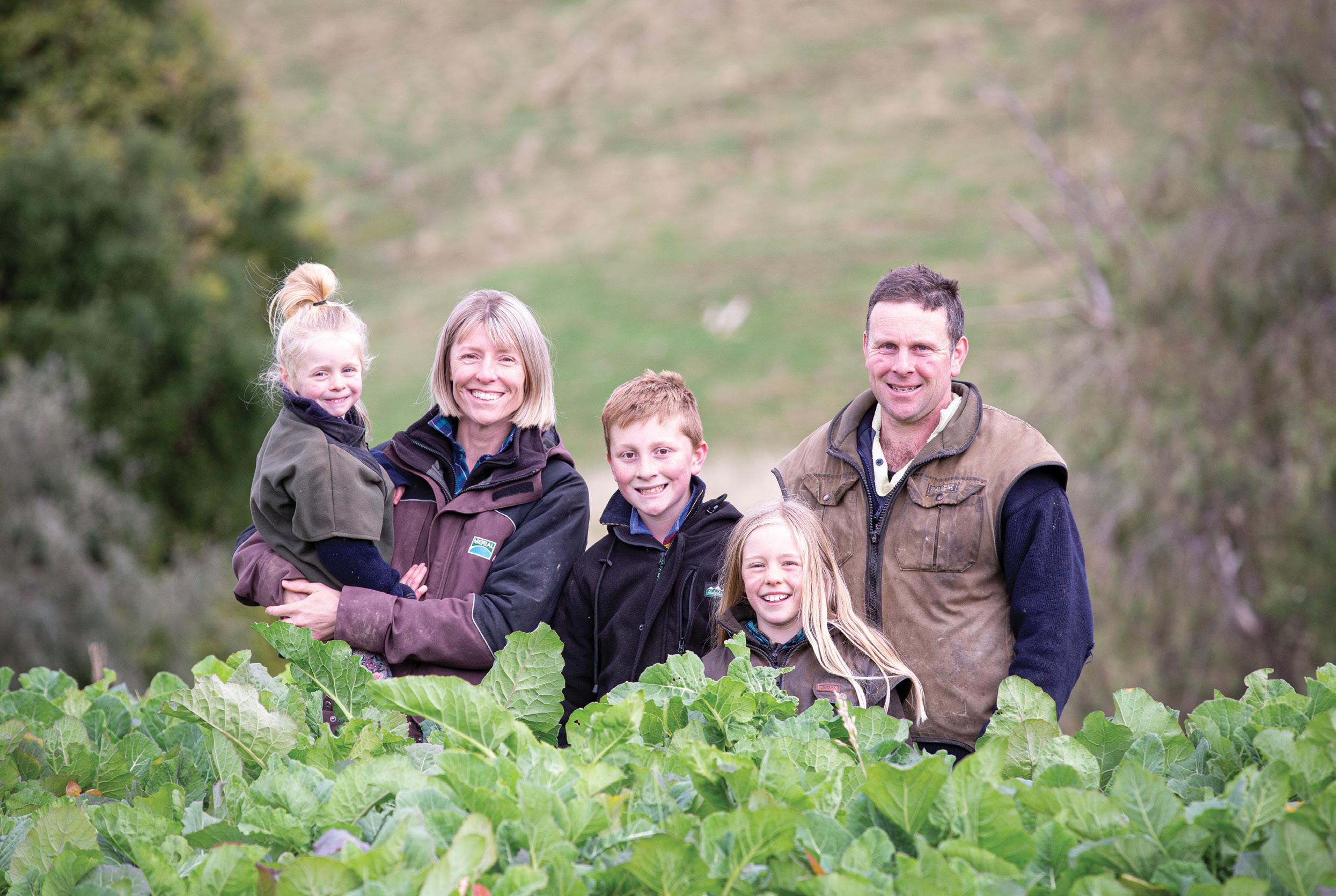 Top left: Derek and Leanne White’s youngest daughter Jess (4) on their Waiouru sheep farm. Top right: A dog’s life. Middle right: Kate (9) with her horse. Bottom: Derek, James, Kate, Jess and Leanne White among toe toe and sedges in riparian planting on their farm which won Wairere Central Districts Red Meat Farm Business of the Year 2023.