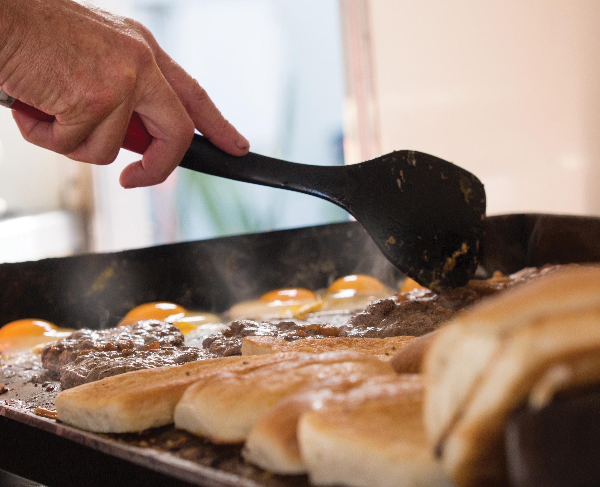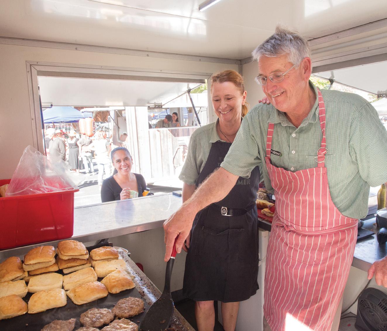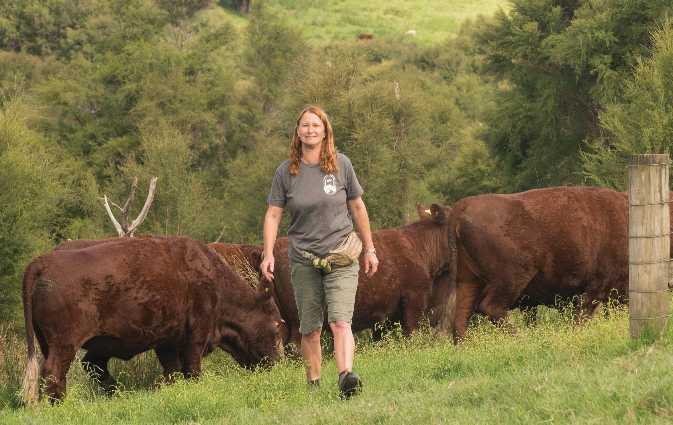 Top left: Gisborne farmer Lee Askew with partner Simon at the Gisborne Farmers’ Market, selling her finished product from the Shemshi Beef food trailer. Top right: For Lee, success is measured by how fast the ciabatta buns sell out. Centre: Lee’s main crossing on her Gisborne farm blew out. Above: All yearling heifers are mated to low birthweight Angus bulls on the Hirschberg’s farm in Apiti, Manawatu.