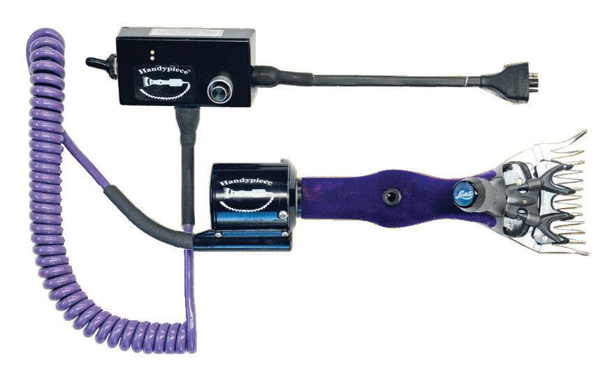 handypiece n Ideal for trimming cows tails, shearing sheep, alpacas and goats n Variable speed from 2600-3500 rpm n Latest brushless motor technology means minimal heat build up n 1400gms means 100-200gms lighter than standard handpiece n At 2800 rpm the 12-volt lithium battery will trim up to 400-500 cows tails or crutch 300-400 sheep n Auto reset fuse for overload or lock up View in action go to www.handypiece.co.nz Email: dave@handypiece.co.nz Free call 0800 474 327 powerfulWorldsmost variable speedclipperishere • FASTER • LIGHTER • VARIABLE SPEED