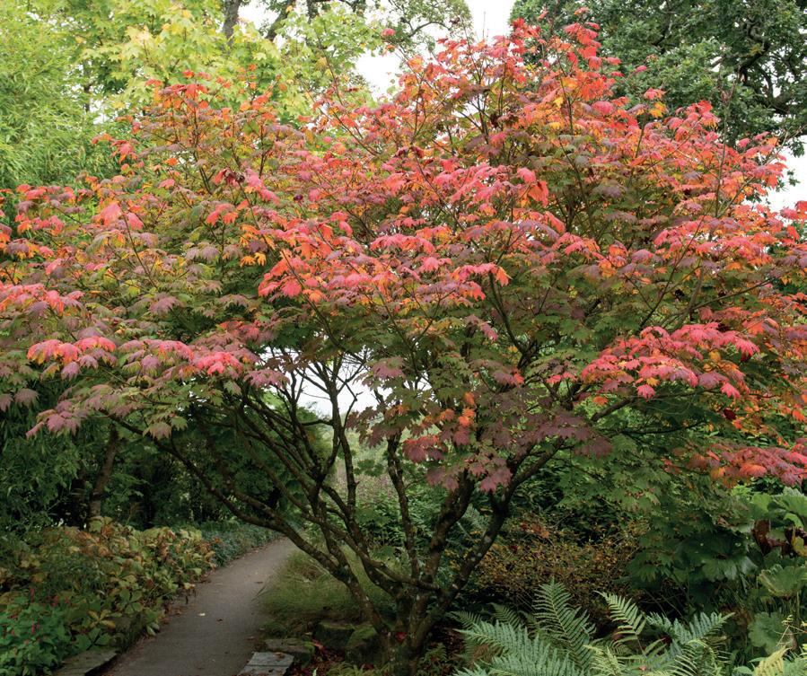February and like moist, freedraining, soil. Bushy varieties thrive in pots so long as they don't dry out. There are hundreds of Japanese maples to choose from but favourites include Acer japonicum 'Vitifolium' - a large shrub or small tree with deeply lobed green leaves that turn crimson, purple, orange and gold (Height x Spread 8m x 10m); Acer palmatum 'Inaba-shidare' - a mound-forming maple with finely dissected purple spring foliage, turning green then crimson (2m x 2m); and Acer palmatum 'Sango-kaku' which is an upright tree with coral-red bark and foliage that matures to canary yellow (6m x 3m).