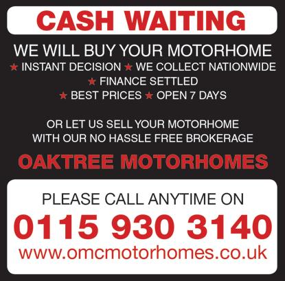 66 MOTOR CARAVANNER December 2022 HOYLES DENHOLME MOTORHOMES, CAMPERS & 4X4S TOP PRICES PAID We can come to you Cash, Bankers Draft or Bank Transfer Contac t Tim Hoyle Anytime 01274 832836 •07786 7355 44 Contact Tim Hoyle Anytime 01274 832836 07786 735544 MOTORHOMES, CAMPERS & 4X4S TOP PRICES PAID We can come to you Cash, Bankers Draft or Bank Transfer MERIDIAN MOTORHOMES Quality Motorhomes & Freedom Caravans Bought and Sold Newly appointed Adria Action (lightweight caravans) and Freedom Caravans Dealer for Southern England MOTORHOME HIRE www.meridianhire.com 01243 572672 Unit 7 Church Farm, Old Park Lane, Bosham, Chichester, PO18 8EX info@meridianmotorhomes.com www.meridianmotorhomes.com SELLING YOUR MOTORHOME? You could be £1,000s better o . For details and advice about our highly successful brokerage service. Call us, it will be worth it! WILKINS MOTORCARAVANS Established in the Cotswolds (Glos.) since 1970. 01285 821216 See us at: www.wilkinsmotorcaravans.co.uk Email: sales@wilkinsmotorcaravans.co.uk WANTED Classifieds Accident Repair Specialists 170 Stafford Road, Cannock, Staffs, WS11 4AH Tel: 01543 572686 www.motorhomerepairs.co.uk Insurance approved specialist motorhome repairers and re finishers since 1987 All makes & models catered for ACCIDENTAL DAMAGE REPAIRS INSURANCE CLAIMS HABITATION SERVICING Tel: 01543 572686 www.motorhomerepairs.co.uk alists WS11 4AH repairs.co.uk motorhome ce 1987 d for PAIRS G TYRESAVE .co.uk Tel: 07831 365 412 www.tyresave.co.uk We are based in Deeside, North Wales, close to Chester, Cheshire and the Wirral. Enhance and smarten your Motorhome with Alloy Wheels. 15” and 16” heavy duty wheels to fit most vans from £440 for 4. We can supply by Mail Order or fit in our tyre depot near Chester. See our website for more choice. REPAIRS & SERVICING SELLING YOUR MOTORHOME OR CARAVAN? Tel: 02380 405122 Top prices paid • Professional, family-run dealership “We BUY motorhomes & caravans that are up to 15 years old” www.viscountleisure.co.uk • Southampton SO31 8BN Est. since1977 WANTED