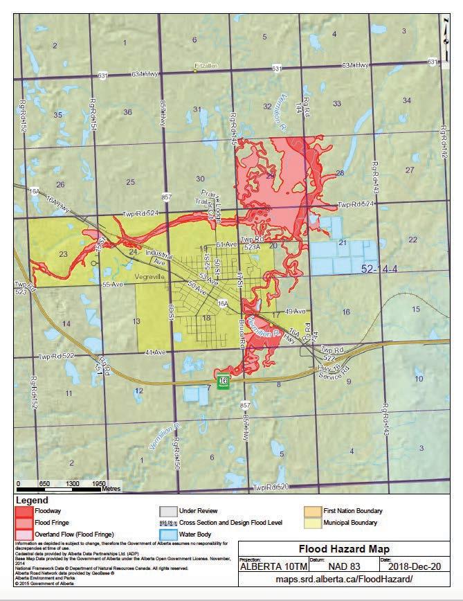 AfloodhazardmappingstudywasundertakenfortheVermilionRiverto identifytheextentsofthe1:100yearfloodplain.Thefloodplainconsists oftwoareasofflowidentifiedasthefloodwayandthefloodfringe. Floodwayrepresentstheareawherethefloodwatersaredeepest, fastest,andmostdestructive.Floodfringeareareasoutsideofthe floodwaywherefloodwatersaregenerallyshallowerandflowslower. AccordingtoAlbertaEnvironmentandParks’floodhazardmapping,the unnamedtributarylocatedwithintheNE¼Section17-52-14-W4Mis locatedwithintheVermilionRiver’s1:100-yearfloodfringe.