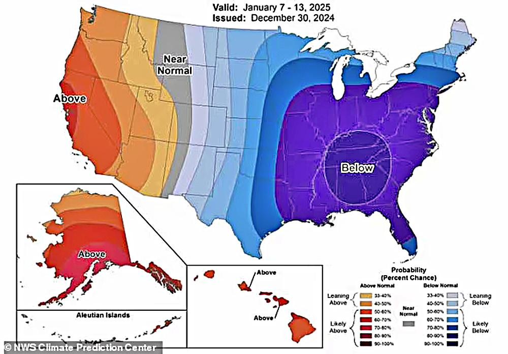 "A significant pattern change is expected across much of the country as an Arctic Outbreak is forecast to spread from the Northern Plains to the south and east, leading to exceptionally high probabilities of below-normal temperatures expected across much of the East," the NWS said.