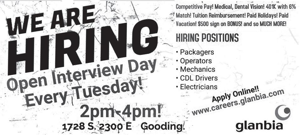 ► Shoshone School District is now hiring a maintenance employee. Position is fulltime with benefits including health insurance, PERSI retirement and leave time. Please visit the district web site at www.shoshonesd.org for a complete job announcement and applica tion. For questions please call John Larsen at 208-886-2381.