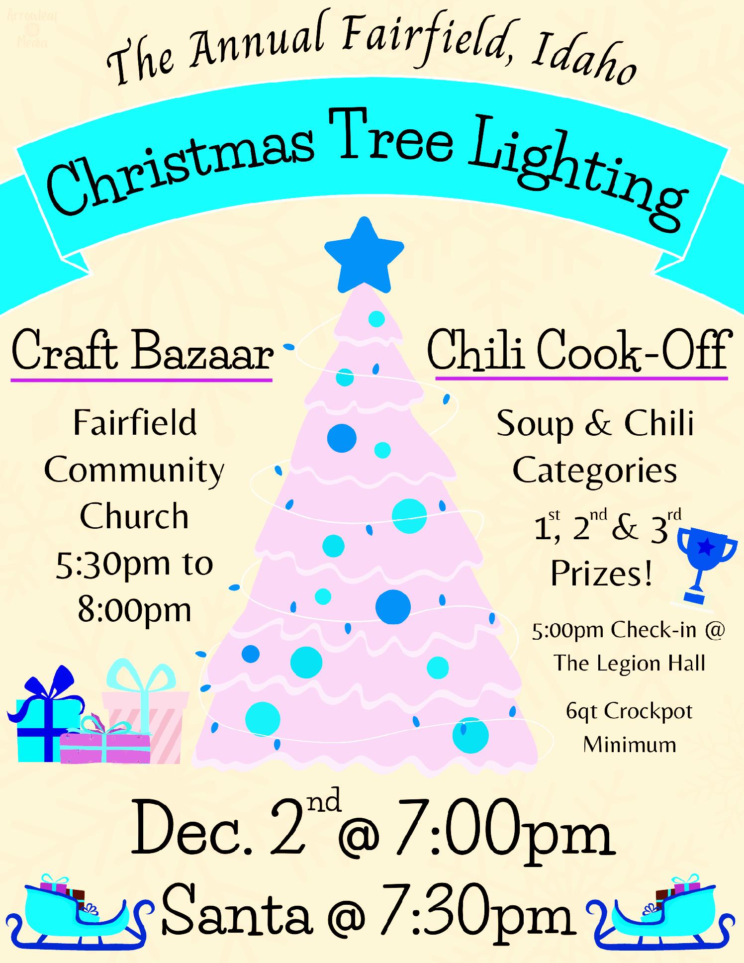 7:30-9:30 a.m. Breakfast at the Senior Center - 308 Senior Ave. $5 includes pancakes, biscuits & gravy, eggs, sausage 9 a.m.-4 p.m. Gooding Holiday Craft Show at North Valley Academy - 906 Main Street Admission: 1 canned food item or coat donation to Helping Hearts & Hands 2 p.m. Santa Arrives via Helicopter at Gooding HS football field - 1050 7th Ave West 2:30 p.m. Santa travels by Gooding Fire truck to Buzz Thru Daily - 2299 Main Street 3-5 p.m. Visits and photos with Santa at Buzz Thru Daily - 2299 Main Street 1st Annual Gooding Co. Dutch Oven Crossroads Cookoff - Buzz Thru Daily 5:30-6:30 p.m. Visit with Santa at Gooding Co. Courthouse - 624 Main Street 6 p.m. Community Tree Lighting at Gooding Co. Courthouse - 624 Main Street Sponsored by Gooding Chamber of Commerce & Glanbia 6:30 p.m. Holiday Light Parade—Main Street