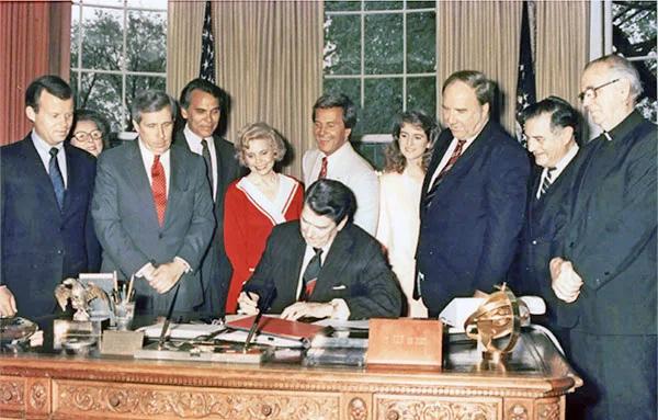 Over the next 36 years, various individuals work to pass a law designating a specific day of each year as a National Day of Prayer. In 1988, a true bipartisan group of legislators passed Public Law 100-307 in both the Senate and the House of Representatives, and on May 5, 1988, President Ronald Reagan sign the law designating the first Thursday in May as the annual observance for the National Day of Prayer.