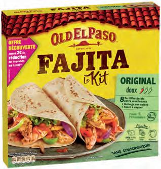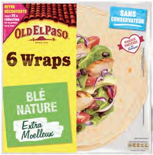 -30 % WRAPS “OLD EL PASO” Blé nature. 350 g. Le kg : 6,51 €. Par 3 (1,05 kg) : 4,56 € au lieu de 6,84 €. Le kg : Également4,34 €.disponible en variétés Tortilla blé nature 326 g (le kg à l'unité : 6,99 €).