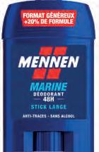 DÉODORANT STICK “MENNEN” Au choix : Tonique, Musk ou Marine. 60 ml. Le L : 54,50 €. Par 2 (120 ml) : 4,58 € au lieu de 6,54 €. Le L : 38,17 €. LE