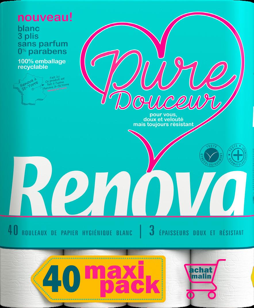 PAPIER HYGIÉNIQUE "PURE DOUCEUR RENOVA" 40 rouleaux. Le rouleau : 0,37 €.
