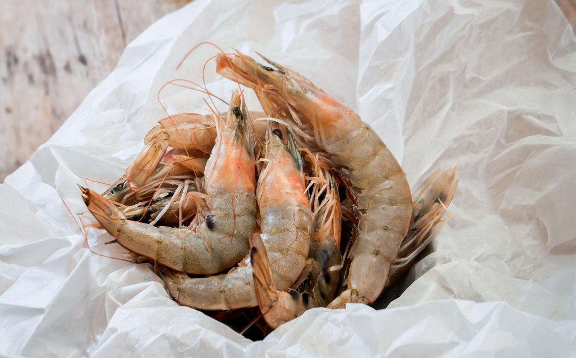 FILET DE MERLAN Pêché en eau de mer. Origine : Atlantique Nord-Est. GAMBAS CRUES Calibre 20/30. Elevées en Equateur ou Amérique du Sud.