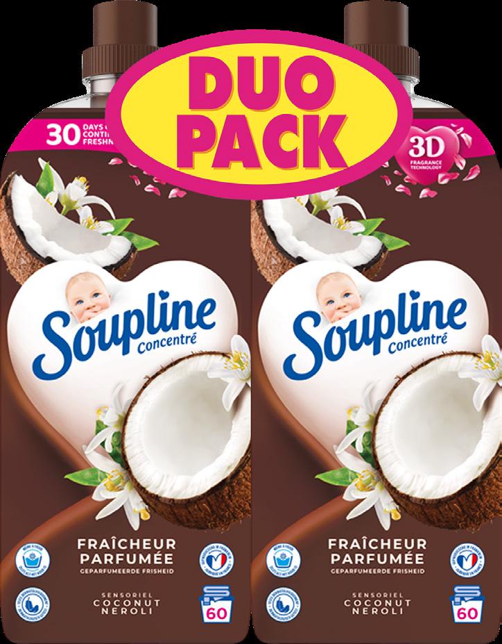 Au choix: Coco, Vanille ou Grand Air. 2 x 60 lavages (2,56 L). Le L : 2,79 €. Egalement disponible en format 2 x 1,35L (2,70L). Le L : 2,64. Hypoallergénique ou Lavande.