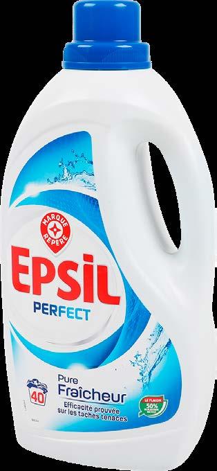 LESSIVE LIQUIDE(1)(2) “EPSIL” 40 lavages. 2L. Le L : 2,16 €. Par 2 (4 L) : 6,48 € au lieu de 8,64 €. Le L : 1,62 €. Au choix: Pure fraicheur, Instant printanier, Sensitive ou Anti-transfert.
