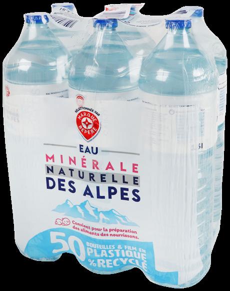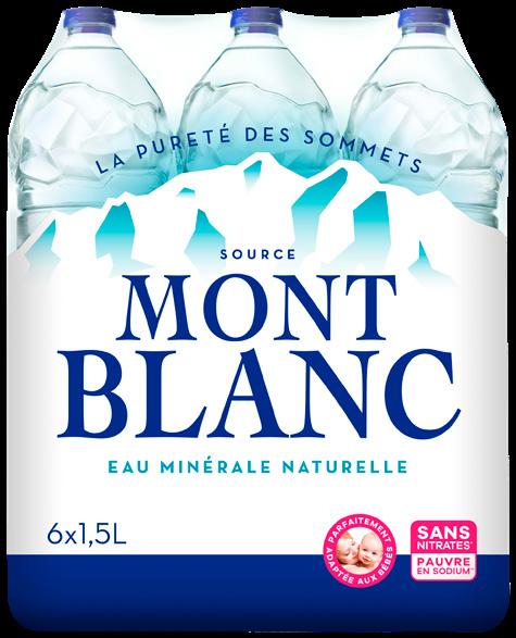 EAU MINÉRALE NATURELLE “MONT BLANC” 6 x 1,50 L (9 L). Le L : 0,30 €. Par 2 (18 L) : 3,62 € au lieu de 5,48 €. Le L : 0,20 €.