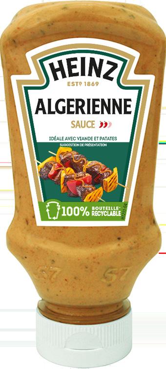 SAUCE “HEINZ” Algérienne, Pita ou Poivre. 220 g. Le kg : 8,36 €. Existe aussi en American burger, 230 g ou Curry mango, 225 g. (Voir prix au kg en magasin).