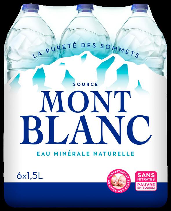 EAU MINÉRALE NATURELLE “MONT BLANC” 6 x 1,50 L (9 L). Le L : 0,29 €. Par 2 (18 L) : 3,50 € au lieu de 5,30 €.