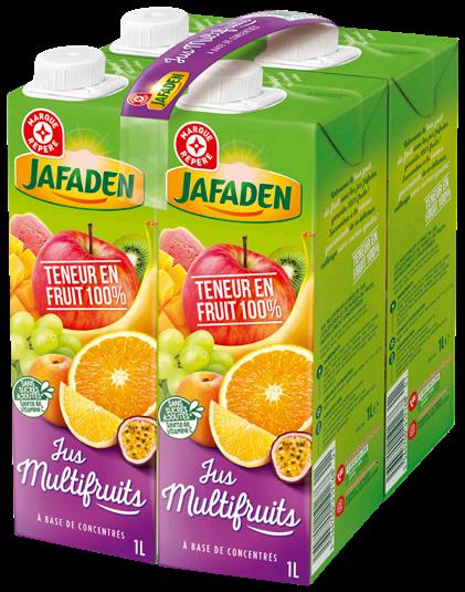 JUS MULTIFRUITS “JAFADEN” À base de concentré. 4 x 1 L (4 L). Le L : 1,30 €.