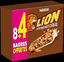 BARRES “NESTLÉ” Lion ou Nesquik. 200 g + 100 g offerts (300 g). Le kg : 8,33 €.