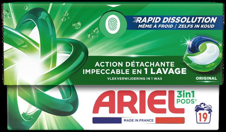 LESSIVE CAPSULES(2)(3) “ARIEL PODS” Au choix : Original ou Alpine. 19 capsules. 345,80 g. Le kg : 25,62 €. Par 2 (691,6 g) : 11,52 € au lieu de 17,72 €. Le kg : 16,66 €.