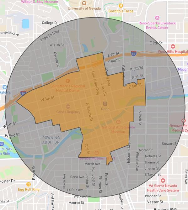 Arch District Brewery District University of Nevada, Reno Space Whale the discovery museum downtown Library Midtown Nevada Museum of Art The Pioneer Center Old Reno Arch National Automobile Museum National Bowling Stadium The Row Greater Nevada Field Neon Line District