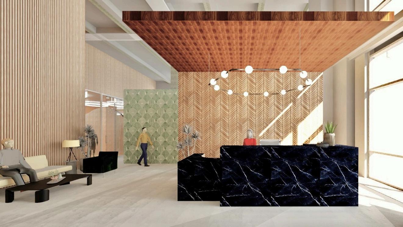 COMBINESLIGHT,WARM-COLOREDWOOD,EXPOSED CONCRETECOLUMNS,ANDDECORATIVEWALLPAPER