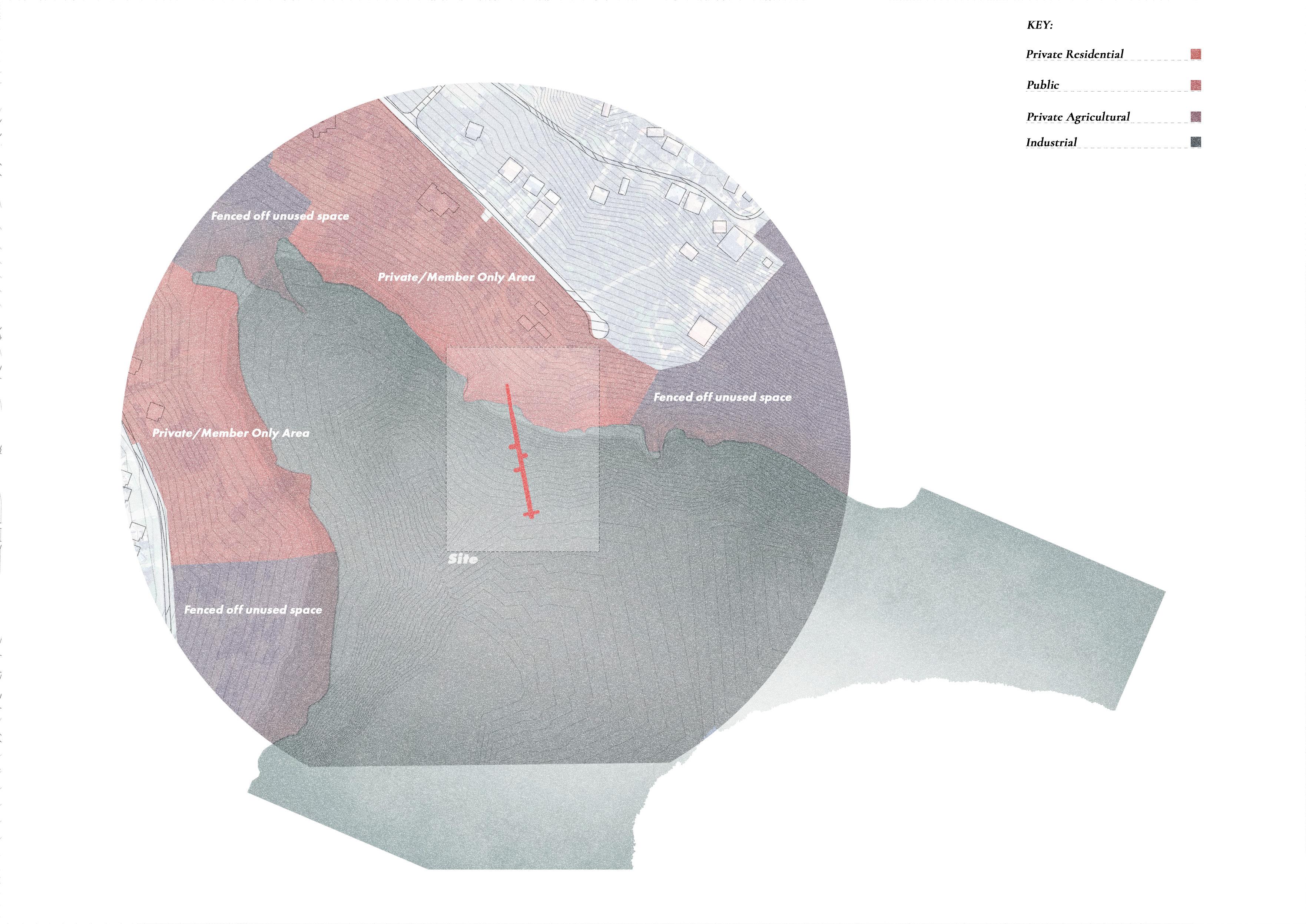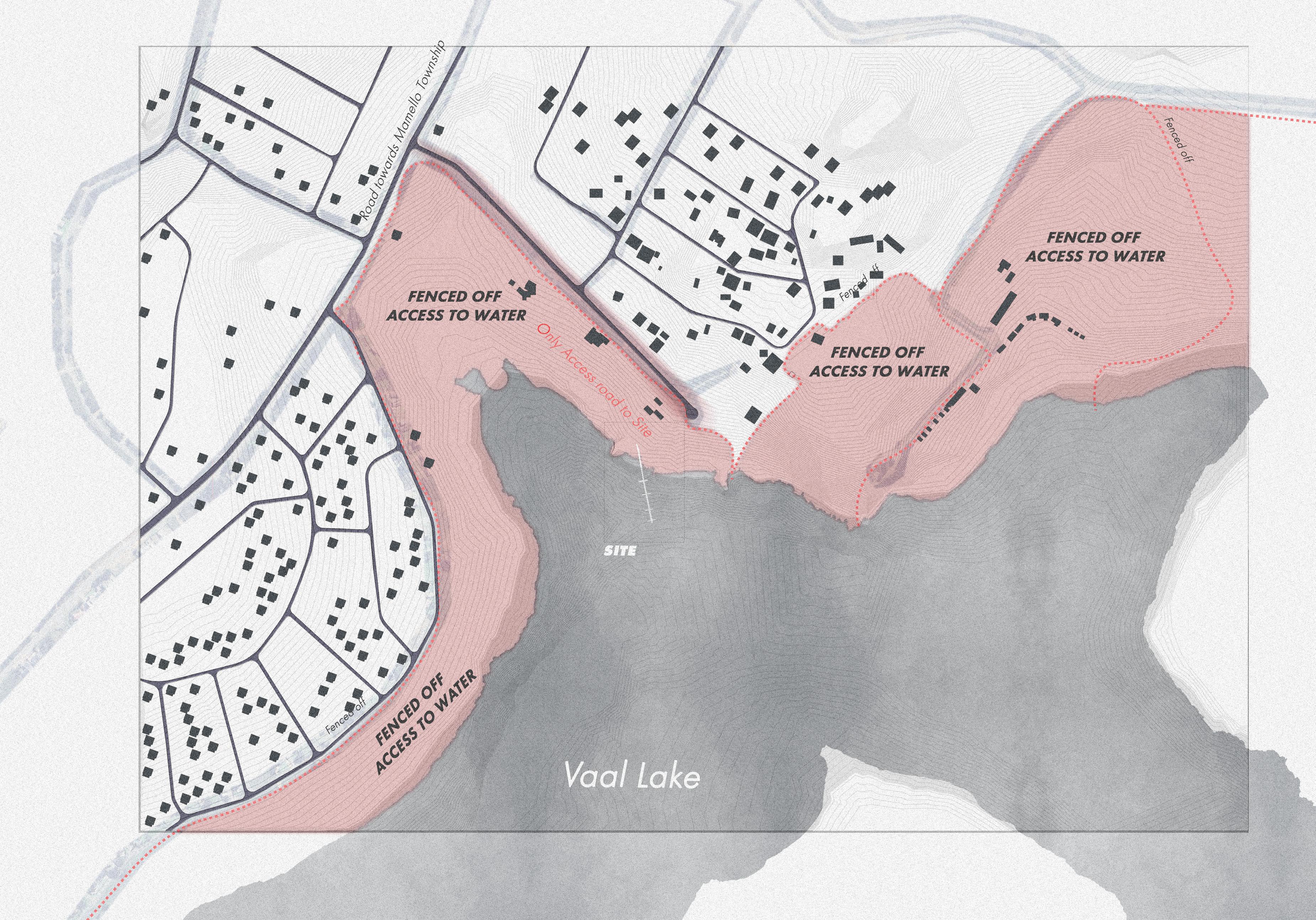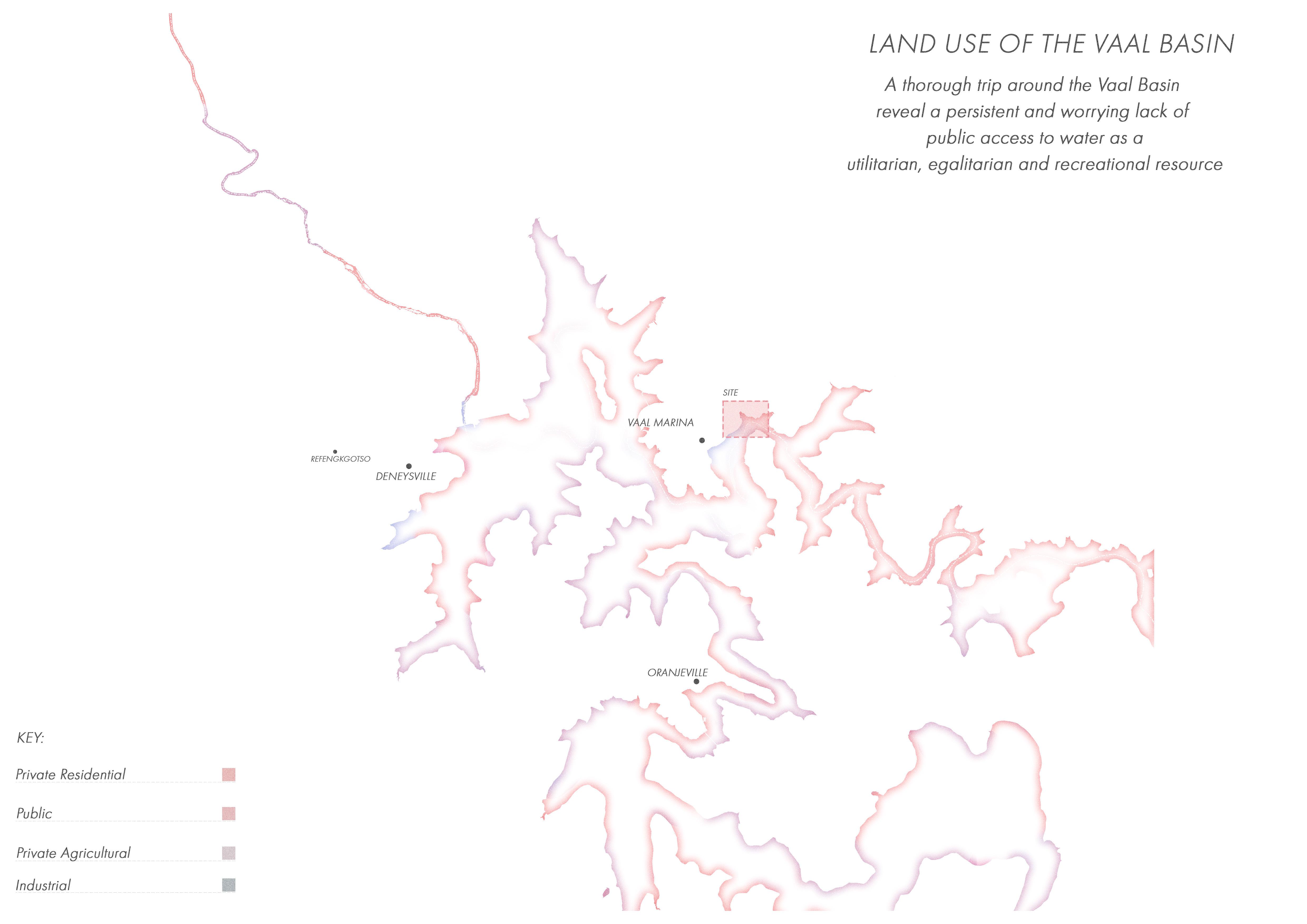 Examination of the Vaal basin and its current land use reveals a resounding amount of private and industrial spaces consuming the majority of the banks of the lake, with minimal spots that act as public available areas to access the water.