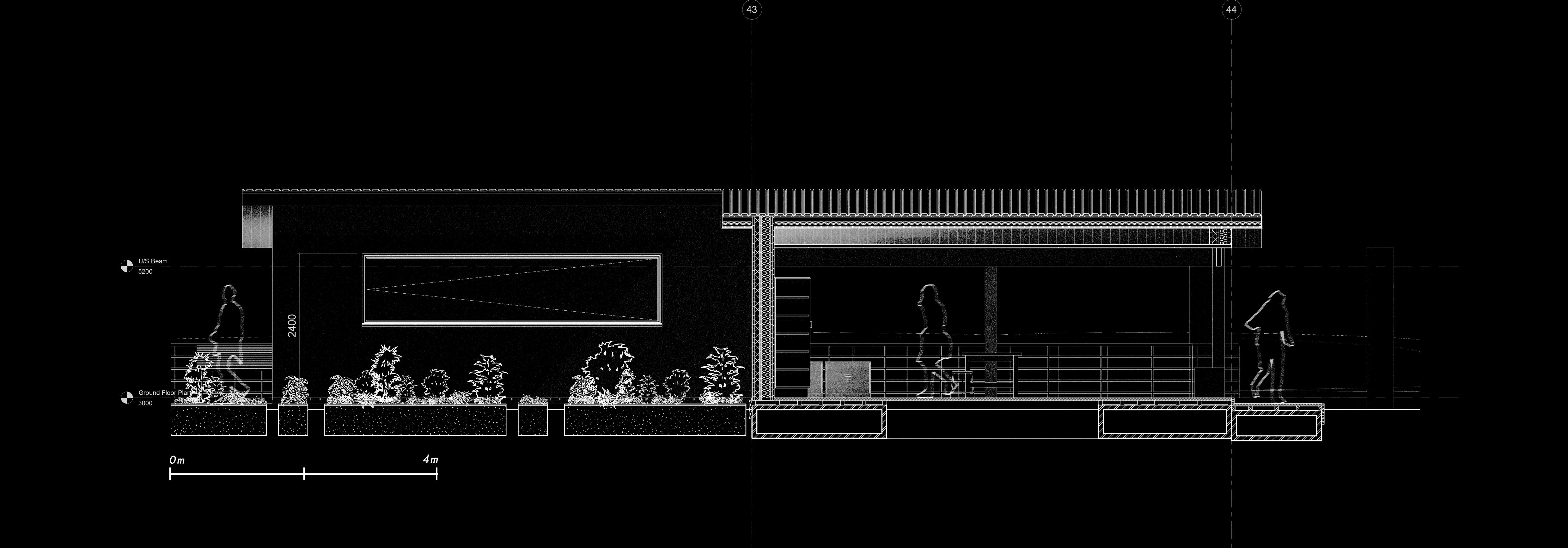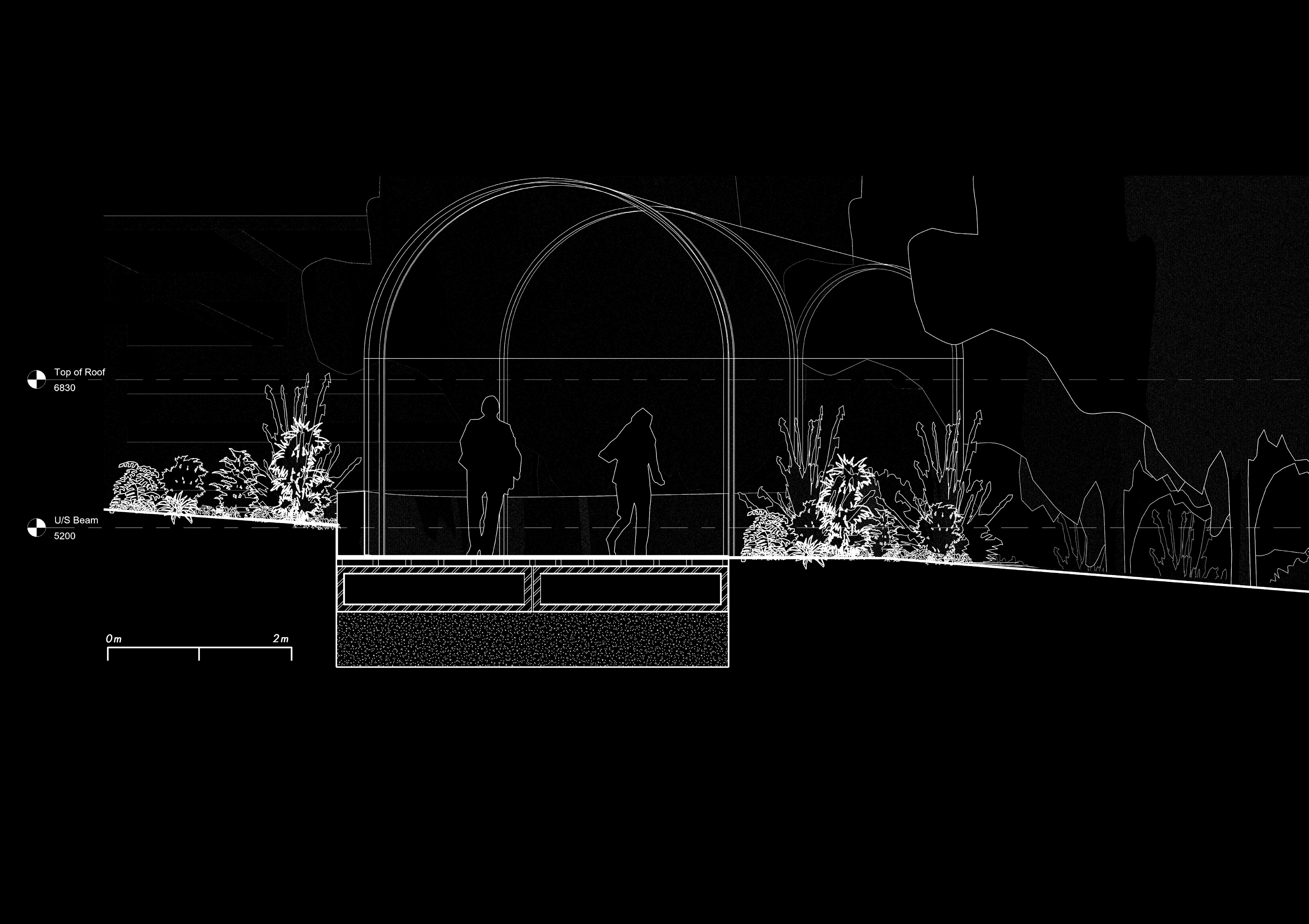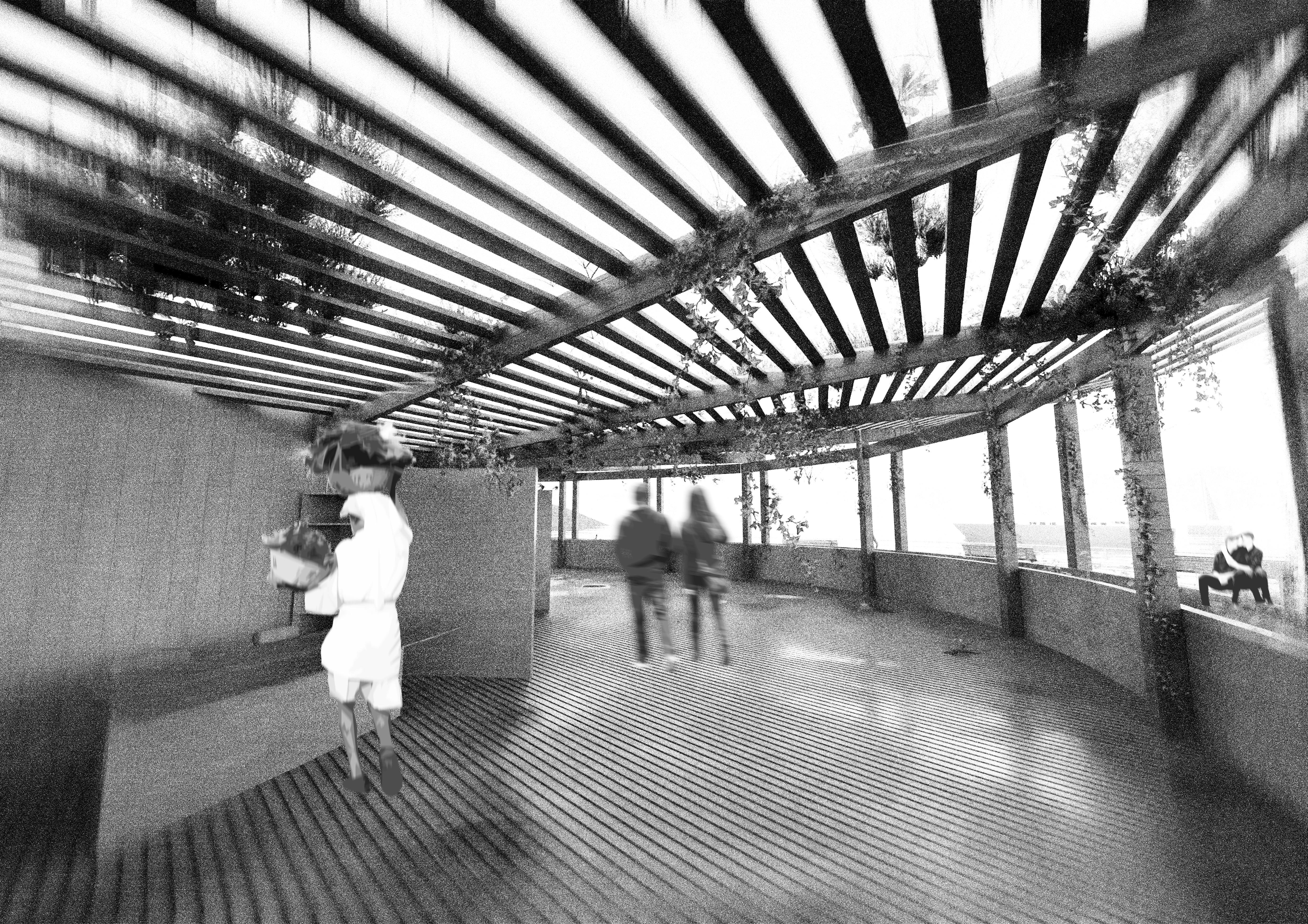 On the pathway to the pier are designed moments of motion and plant life seamlessly integrated into the experience of the public space. With timber pergolas and wire mesh tunnels that function as the basis for plant life to grow and react to the structure. With various deciduous plants growing across the designs and providing solar shading in the summer.