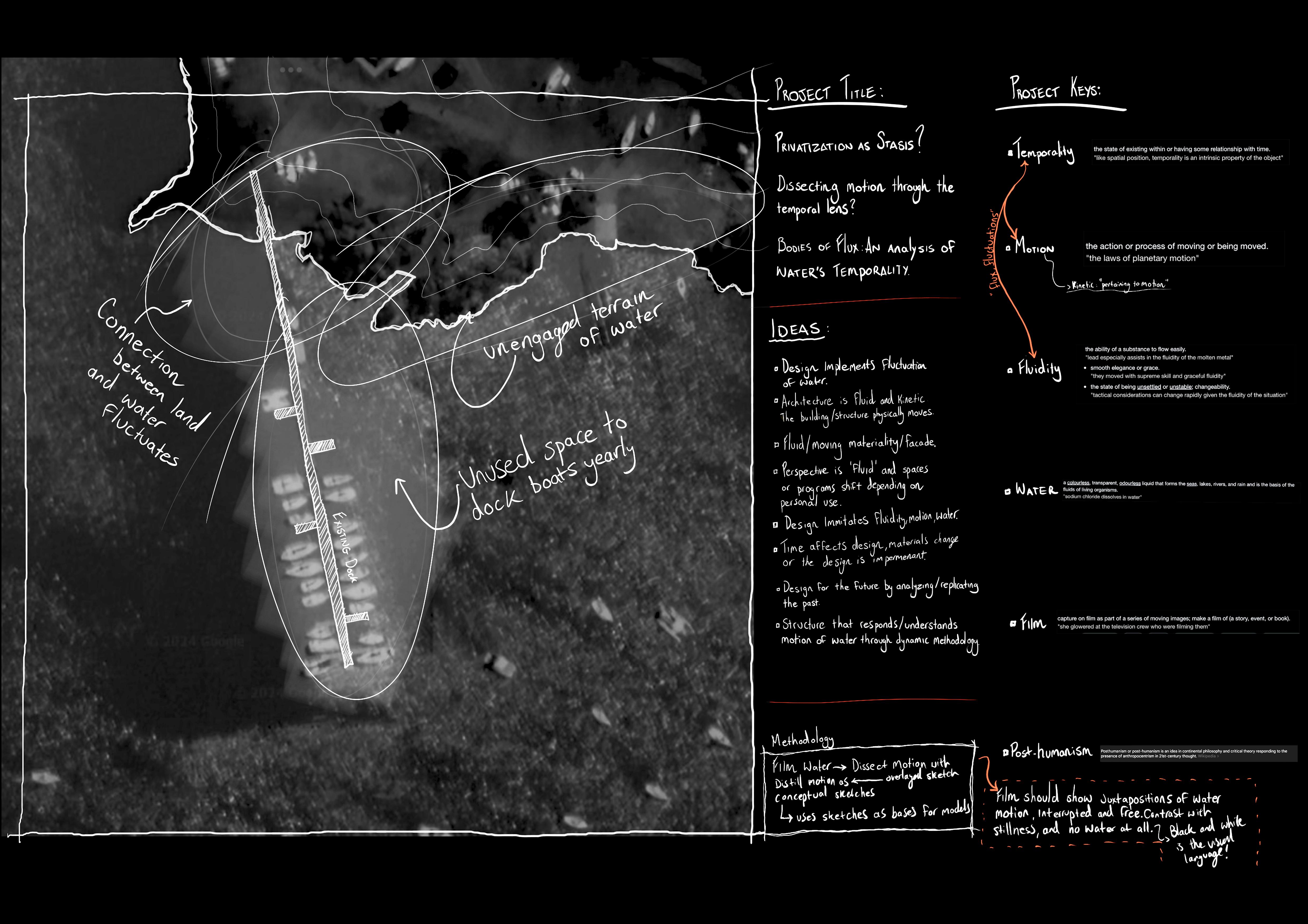 Although conceptually the intersection of concepts of Water and Architecture have been explored to a certain extent by previous Architectural scholars, the greater intersection between water and time is something I believe provides a gap within academic study and is something I find will be interesting to explore. Furthermore, through my own investigations I found that the Methodology of Film within the Architectural landscape is something I believe has room to be further explored, represented and refracted in new and interesting ways that may provide context and basis for my interests holistically.