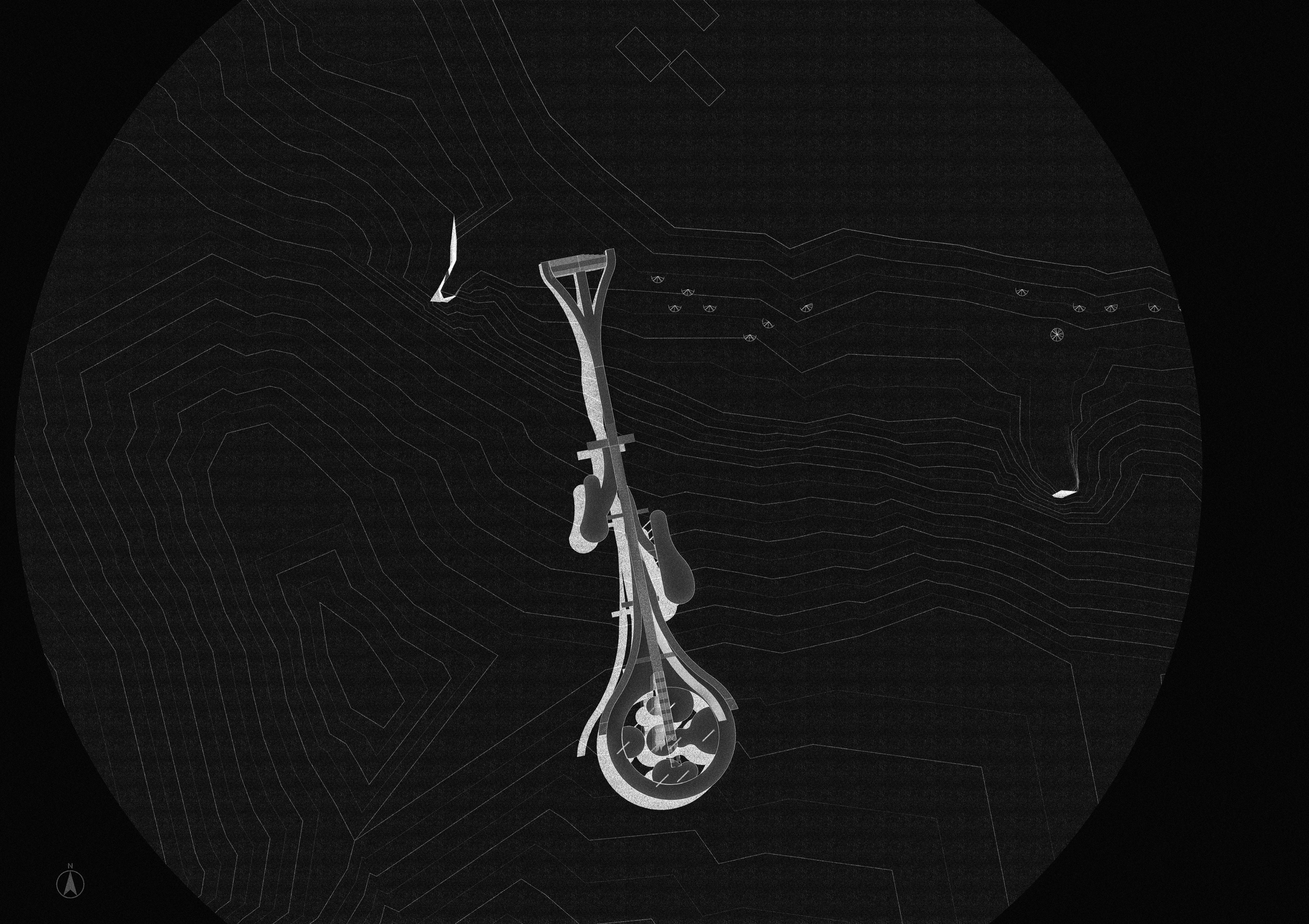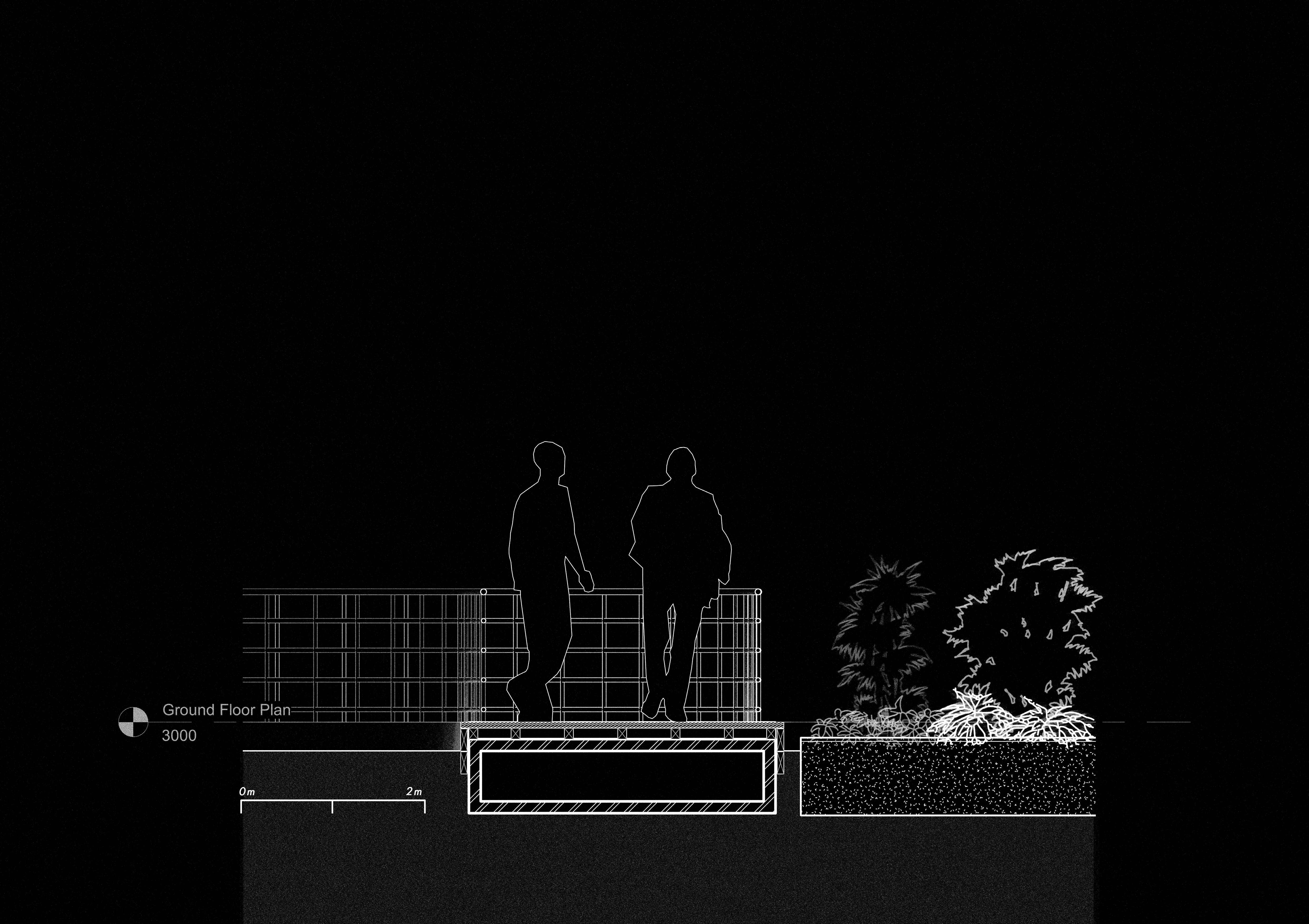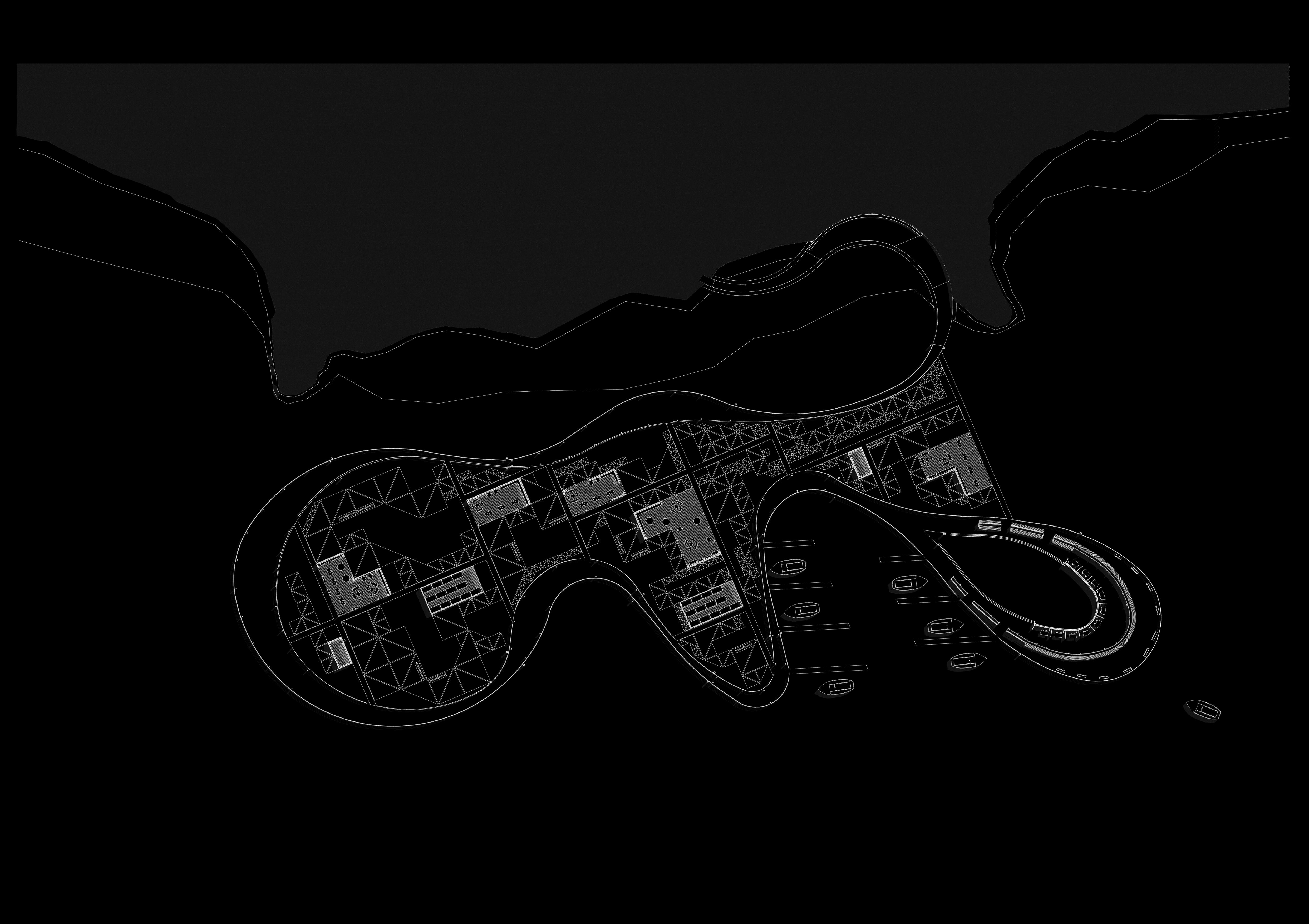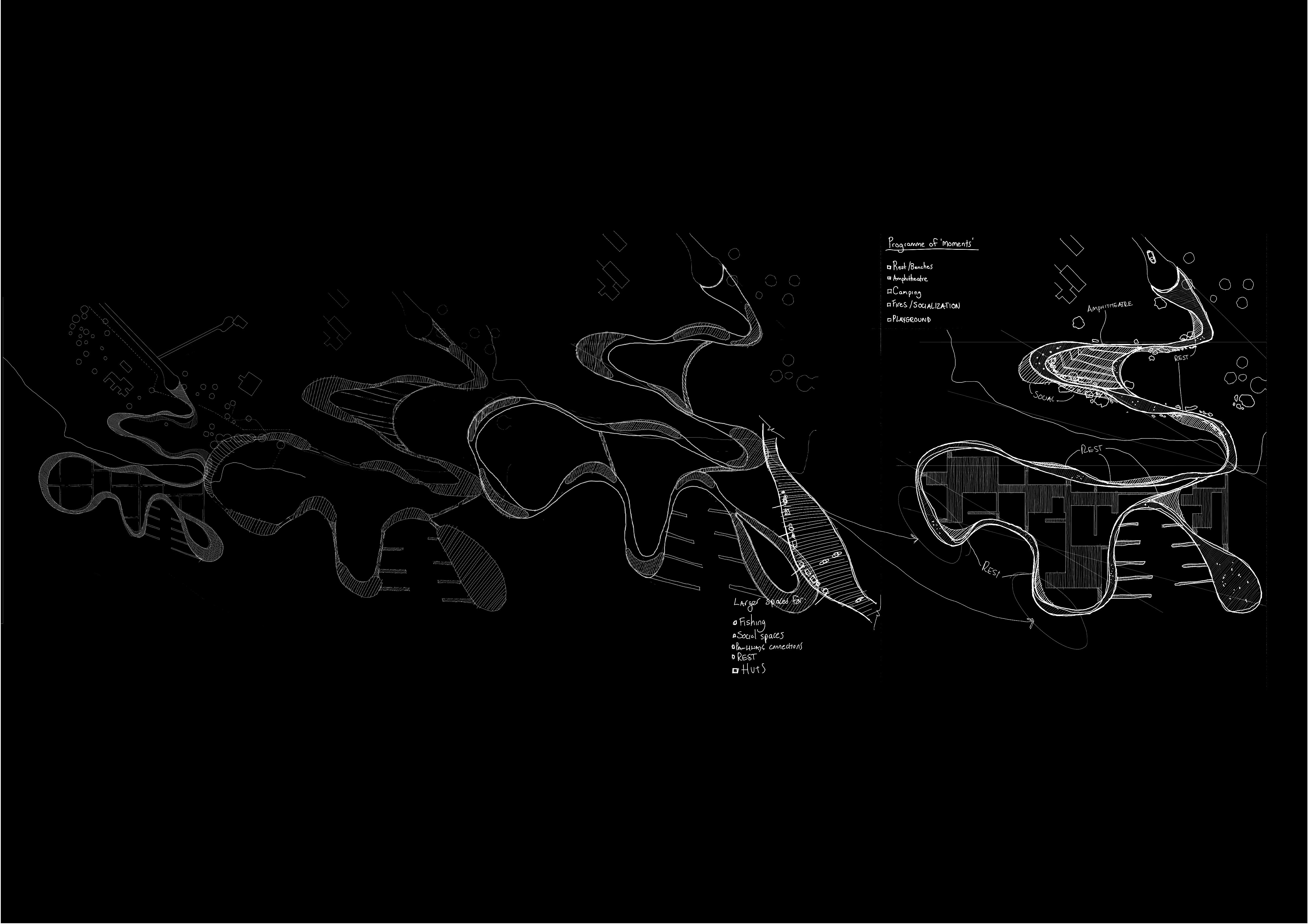 Taking the form of a careful meander, the design begins as a pathway to the waterfront. Due to the large slope of the site, the pathway makes sure to sit at a comfortable angle for the users. Following the passage into the lake, the walkway becomes a floating component of the design, acting as the central circulation unit that forms a loop. The walkway forms ‘moments of larger spaces at multiple points which act as areas for people to rest, fish and socialise with the community.