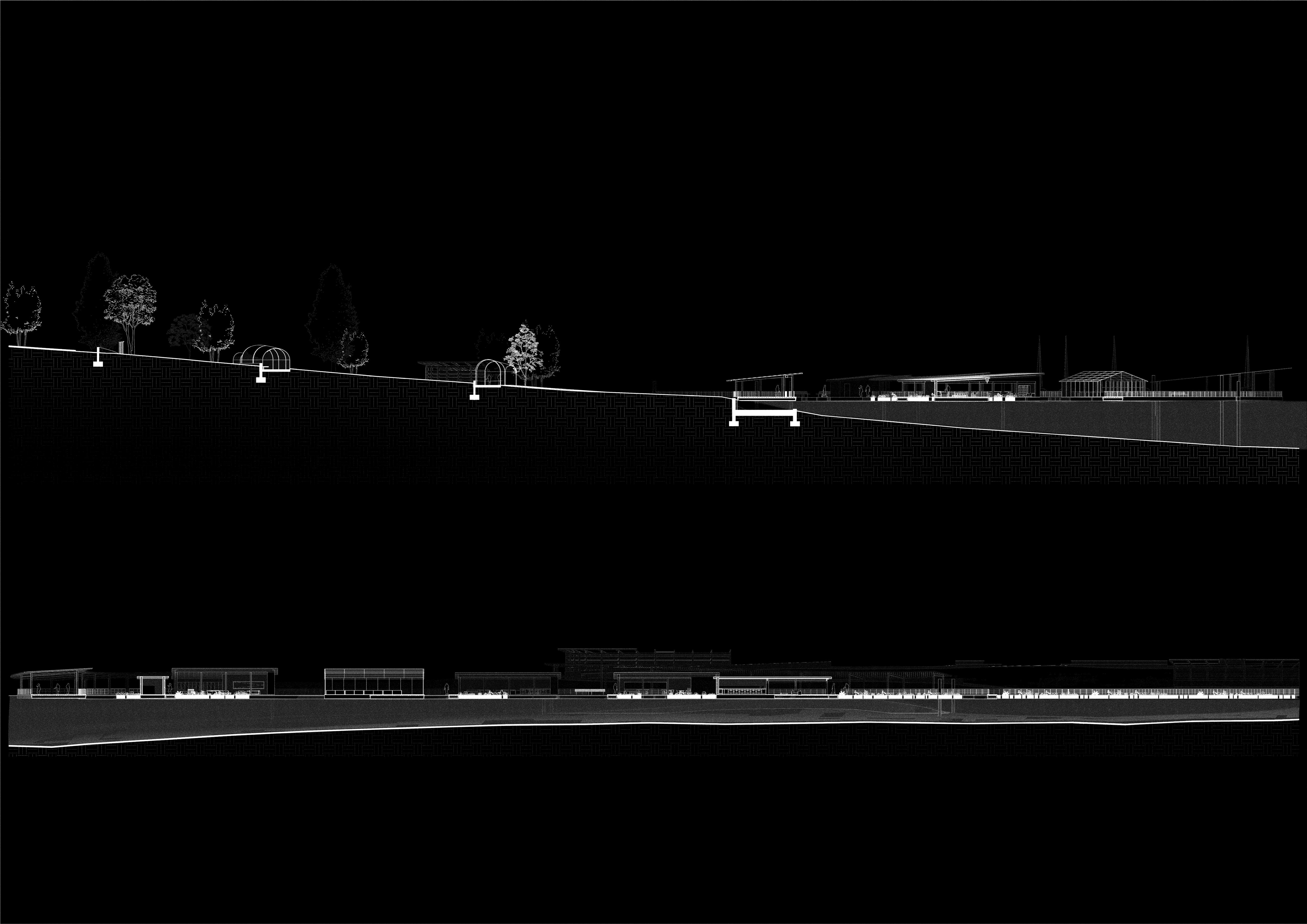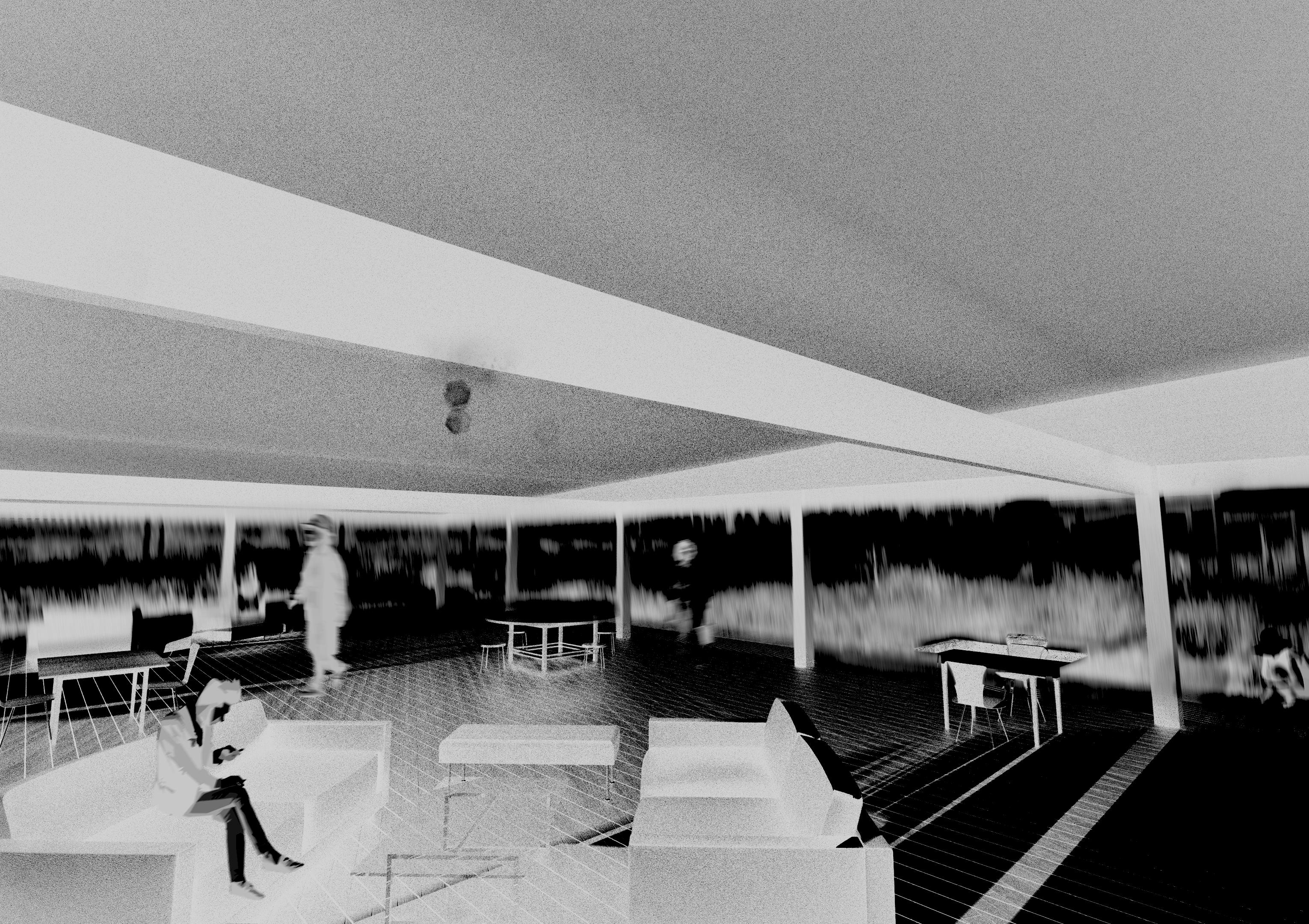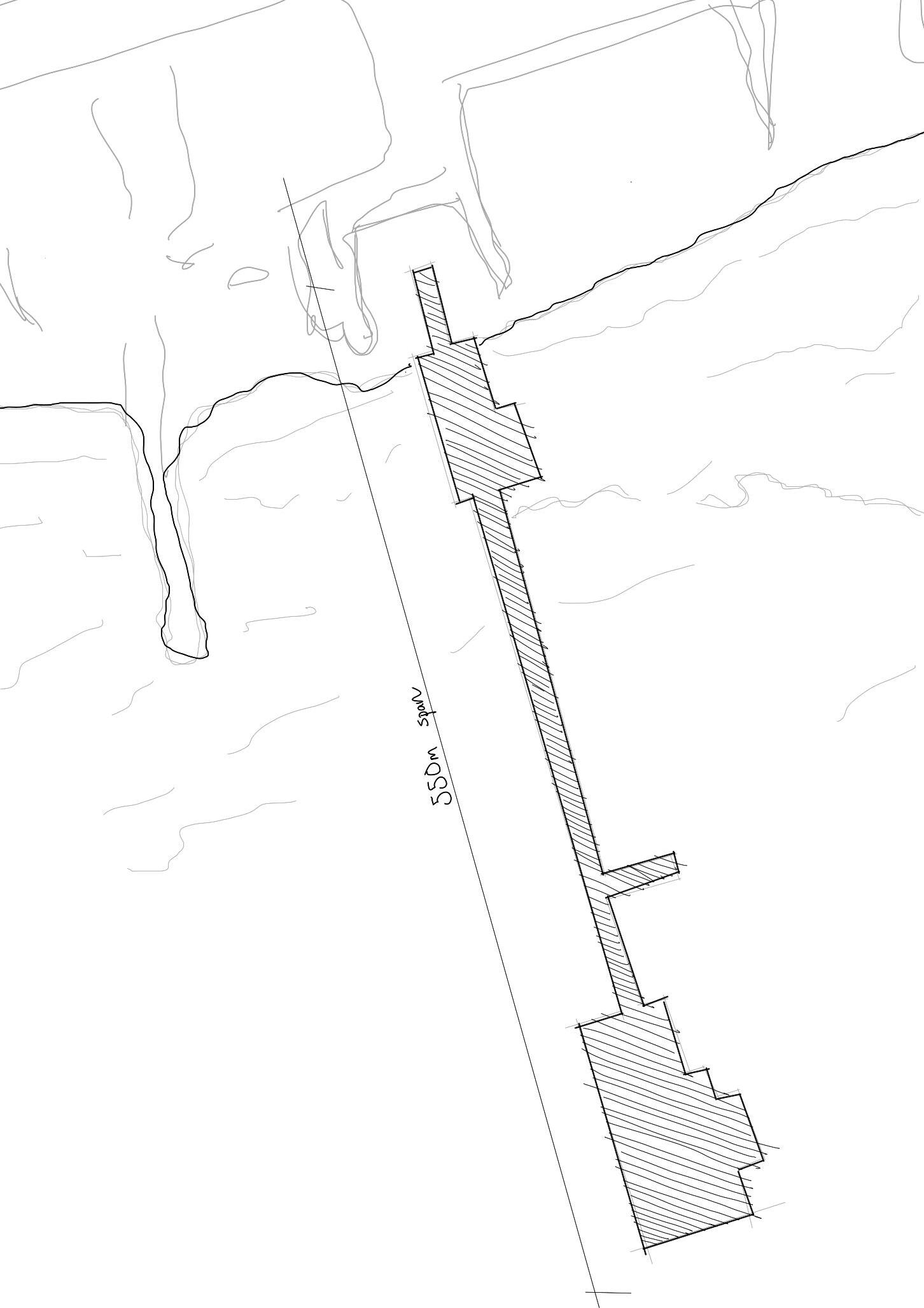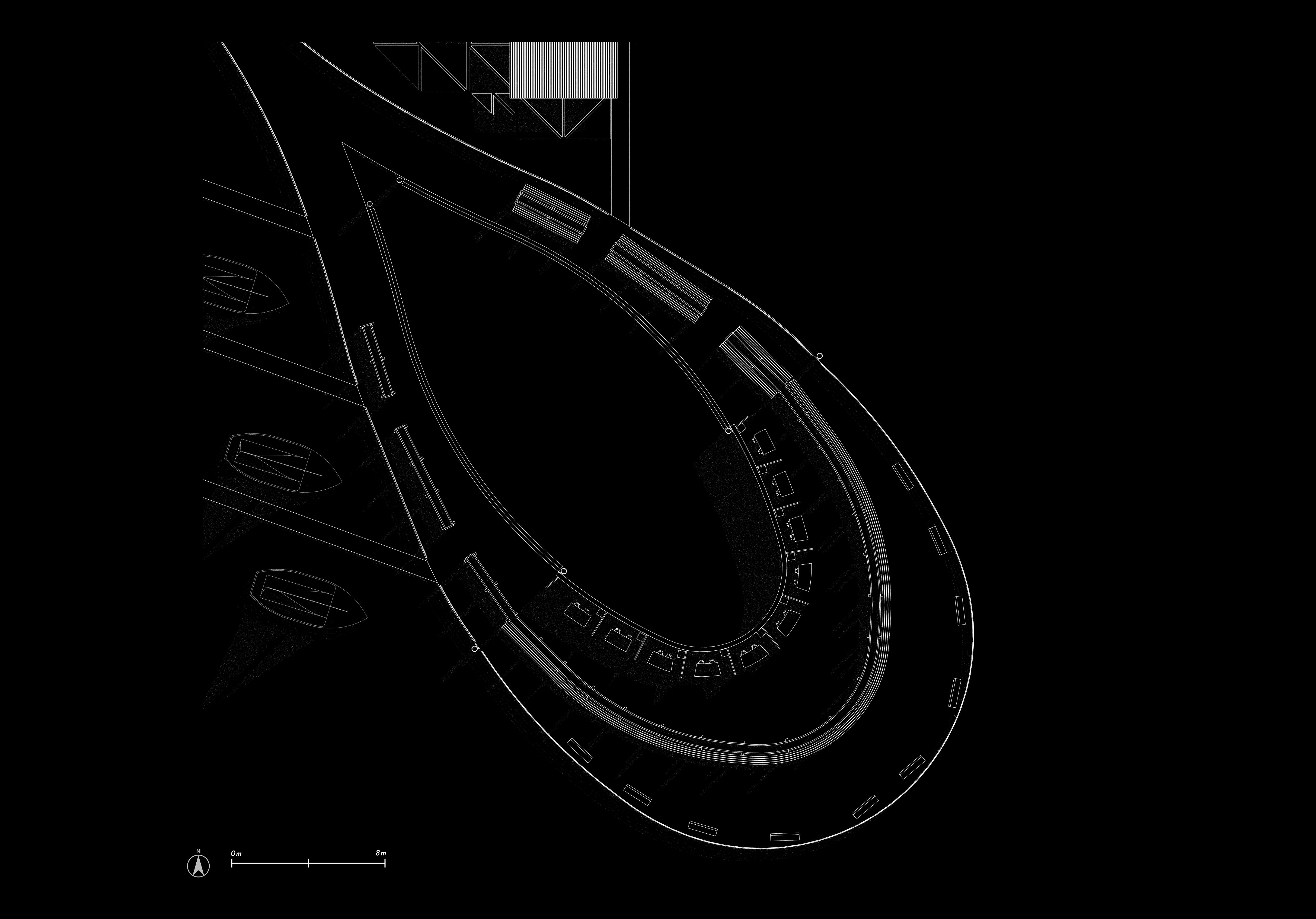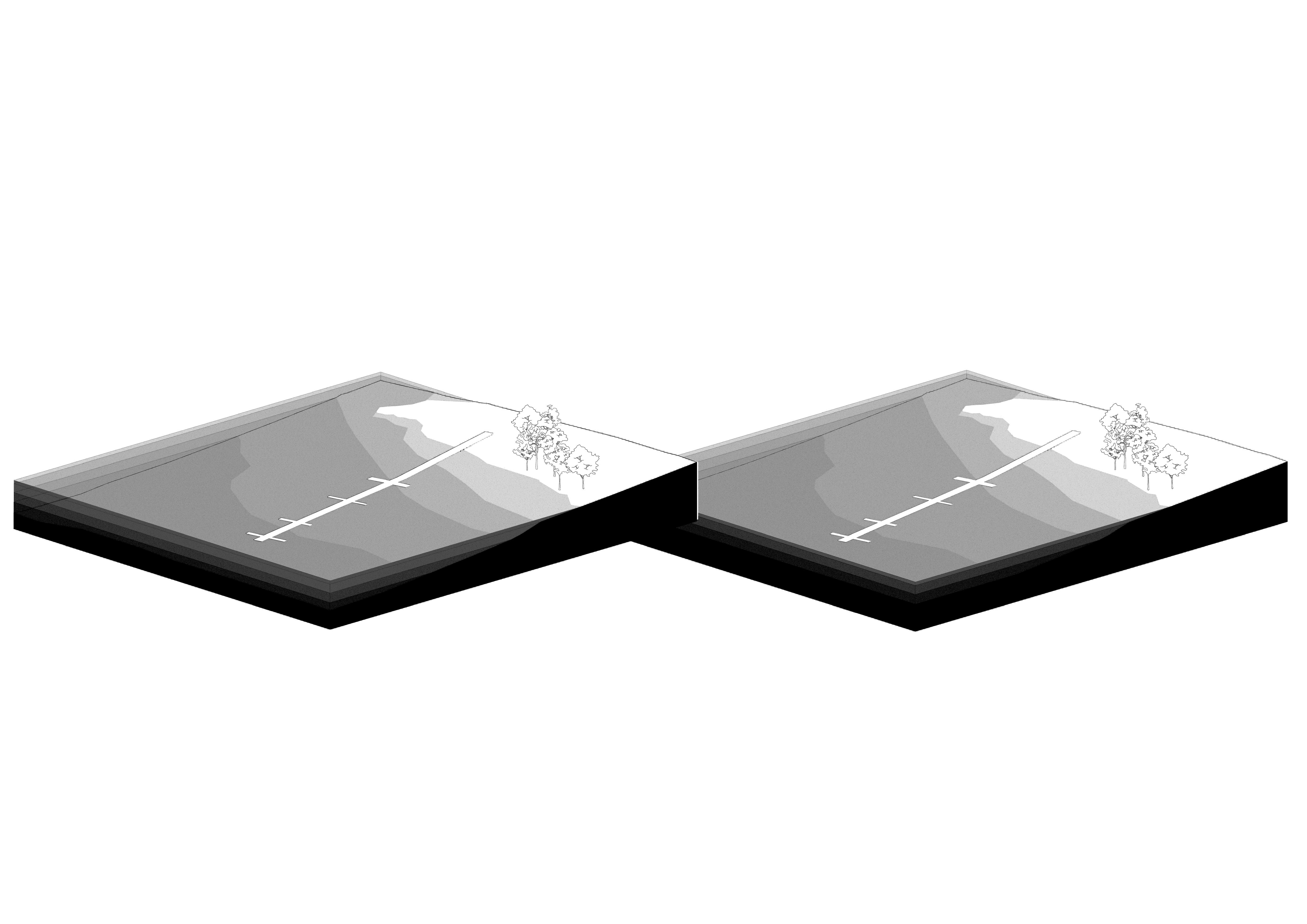 Taking the form of a careful meander, the design begins as a pathway to the waterfront. Due to the large slope of the site, the pathway makes sure to sit at a comfortable angle for the users. Following the passage into the lake, the walkway becomes a floating component of the design, acting as the central circulation unit that forms a loop. The walkway forms ‘moments of larger spaces at multiple points which act as areas for people to rest, fish and socialise with the community.