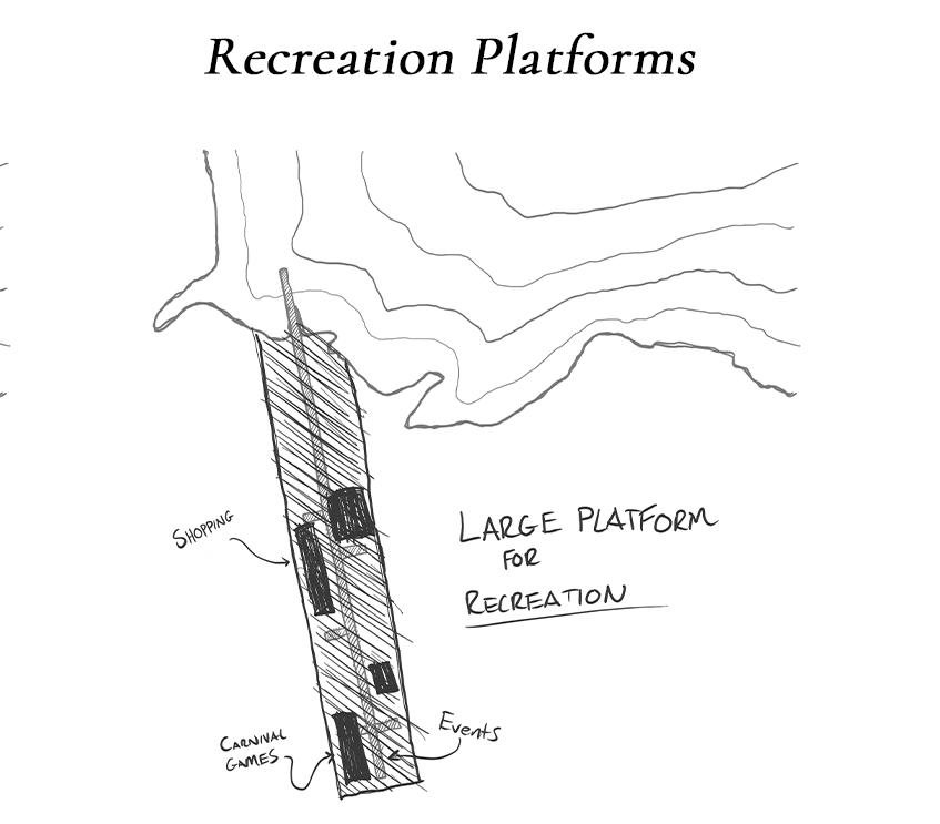 To begin speculation on unconventional and existing uses of a pier structure that are not yet widely used or conceptualized, I began thinking of contradictory and abstracted programs that may provide an exciting challenge from the program of a pier. Furthermore, I wanted to design a space that functions as a multi-cultural and classless public system that works to the needs of the community.