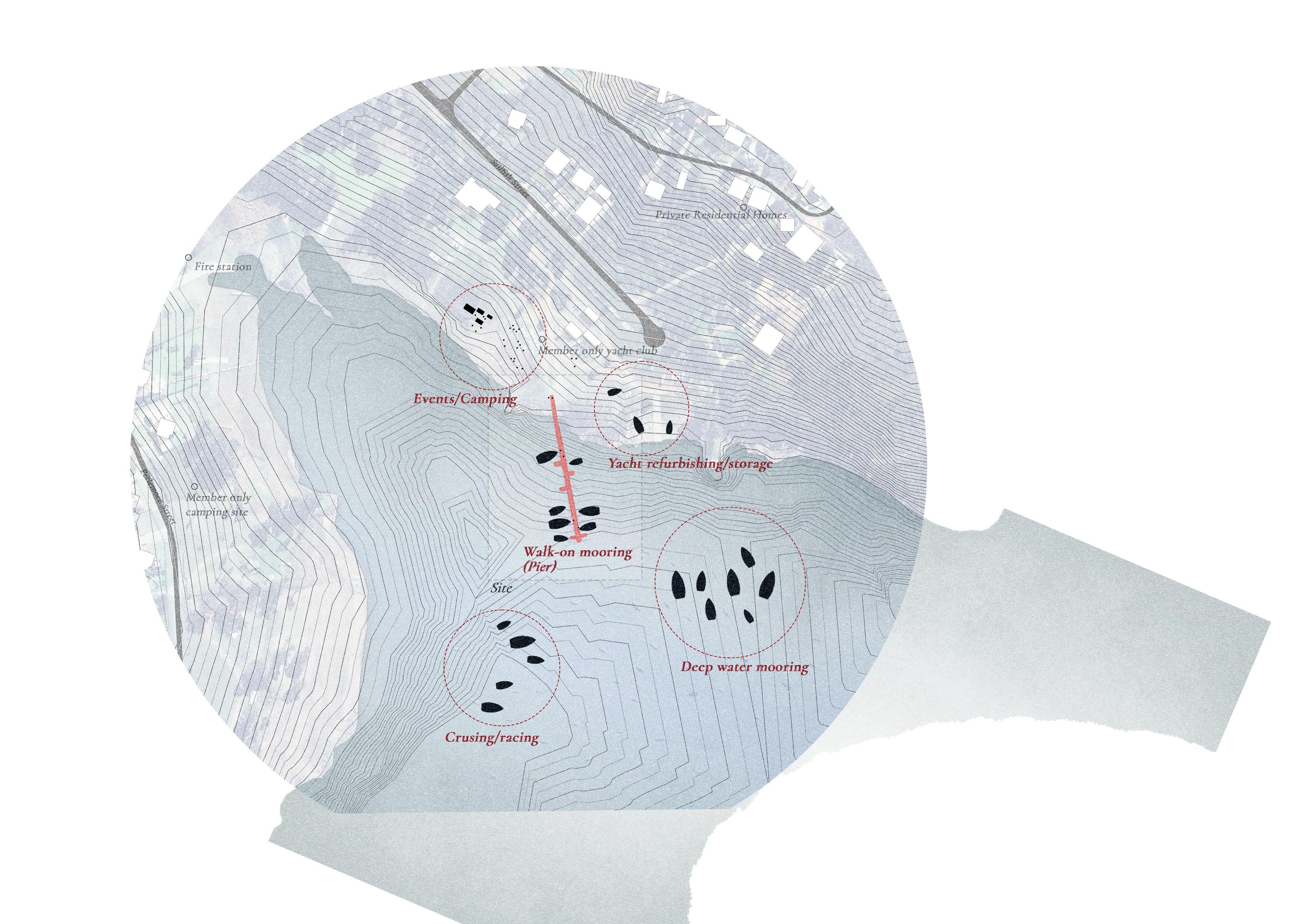 Initial considerations and potential design challenges arose from the concept of removing the current programs existing on my chosen site. As the existing Yacht club provides current members with storage for their boats, spaces for events and camping, sailboat racing and other family activities, I had to consider either completely removing the current uses of the site for my intervention, or adapting the existing programs and combining them within the design of the new pier. Ultimately designing a space that is multi-use, and adjusts to the needs of the entire community.