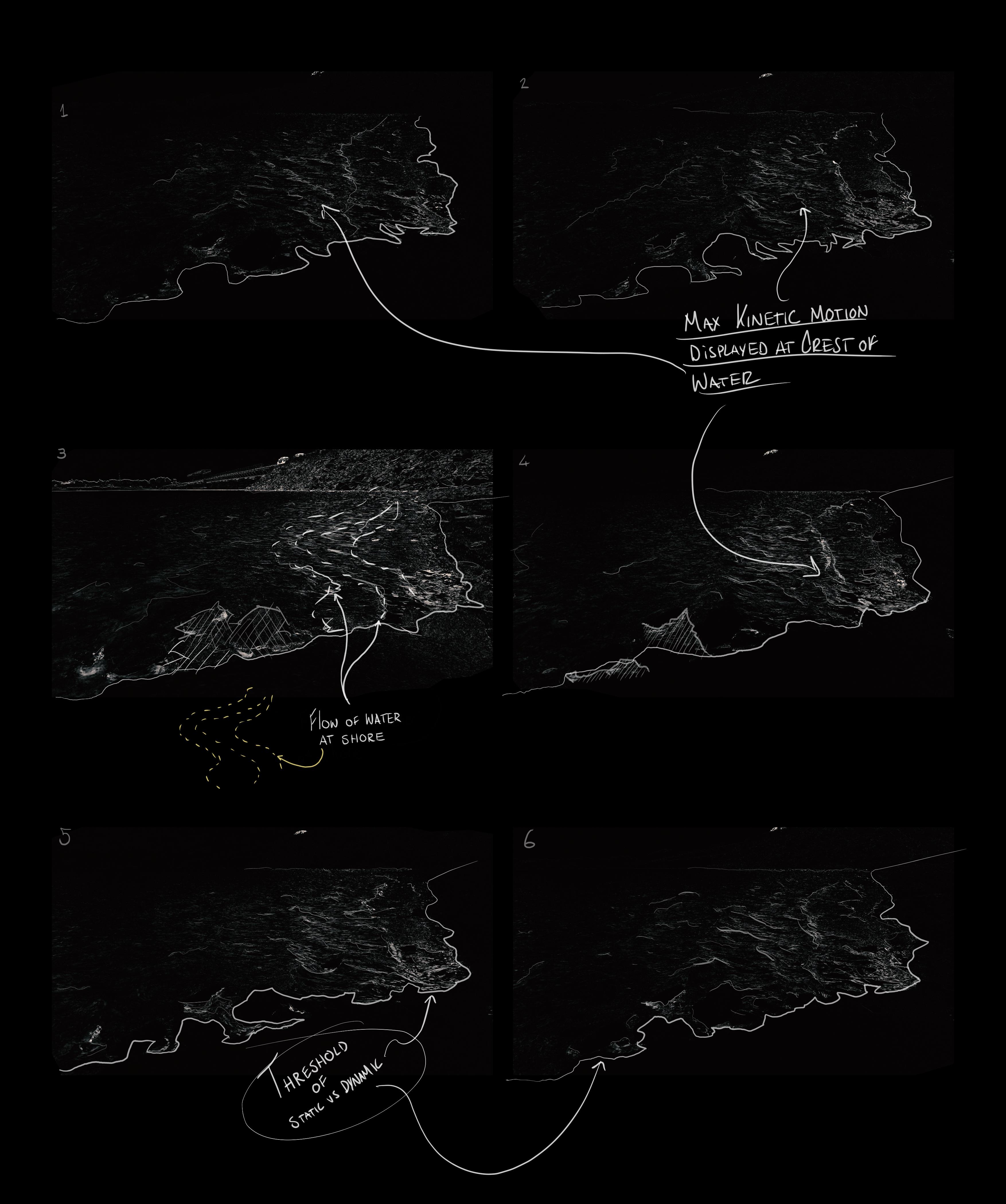 Thus, my own research process will be understanding various bodies/terrains of water through the use of the Methodology of Film, animation and stop-motion to Map, Trace, Analyze and Explore the dynamic nature of water and its innate “Flux”. Due to the way water behaves and acts in various terrains, my focus on film allows opportunities to examine, compare and juxtapose the nature of water over Time. Furthermore, understanding time as an intrinsically woven part of the being of water enables further examination into the understanding/perception of time and how the myths of past, present and future may affect design around bodies of water.