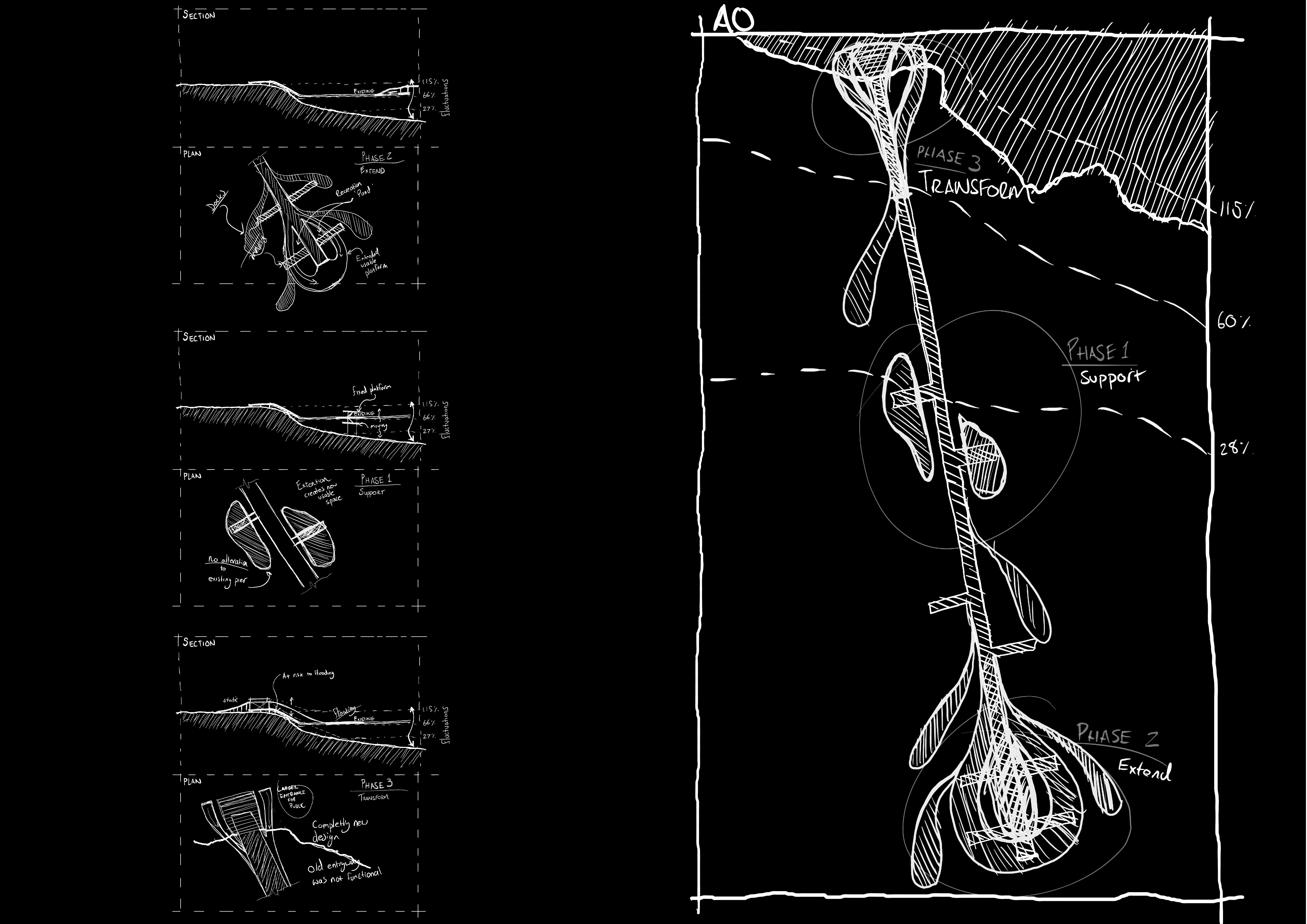 The intial concept for the pier began as a experimentation on phasing and adapting the existing pier on site. Each phase would be at a difference stage of redesign. Support, Extend and Transform, with each phase undergoing a larger change in structure and aesthetic.