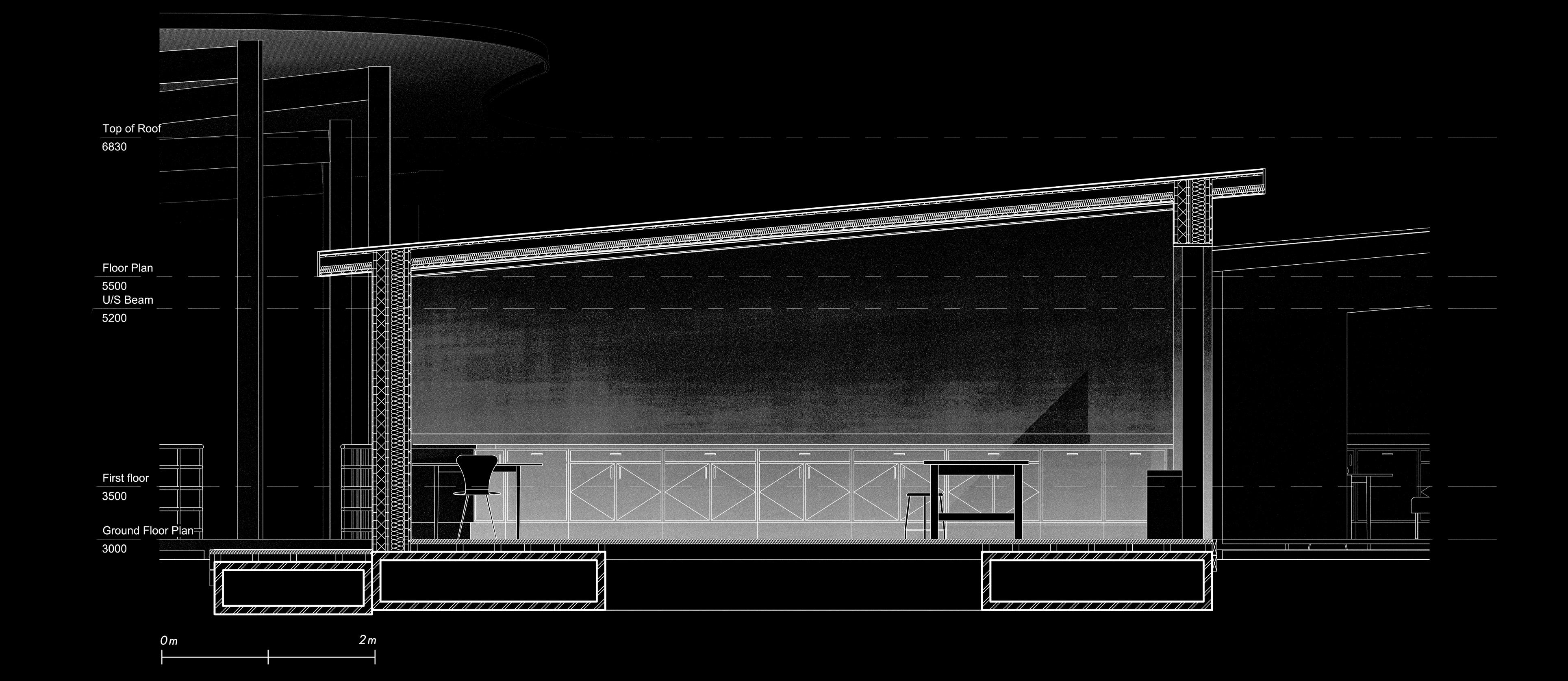 Designing with the inherent flux of the Vaal Lake in mind, the entire design functions as a floating system that reacts to the water levels. Large, buoyant steel sections act as foundational flooring for the pathways and covered spaces, and large steel columns are fixed to multiple points of the design that function as anchoring points for the design to allow vertical movement but prevent rotational and lateral movement.