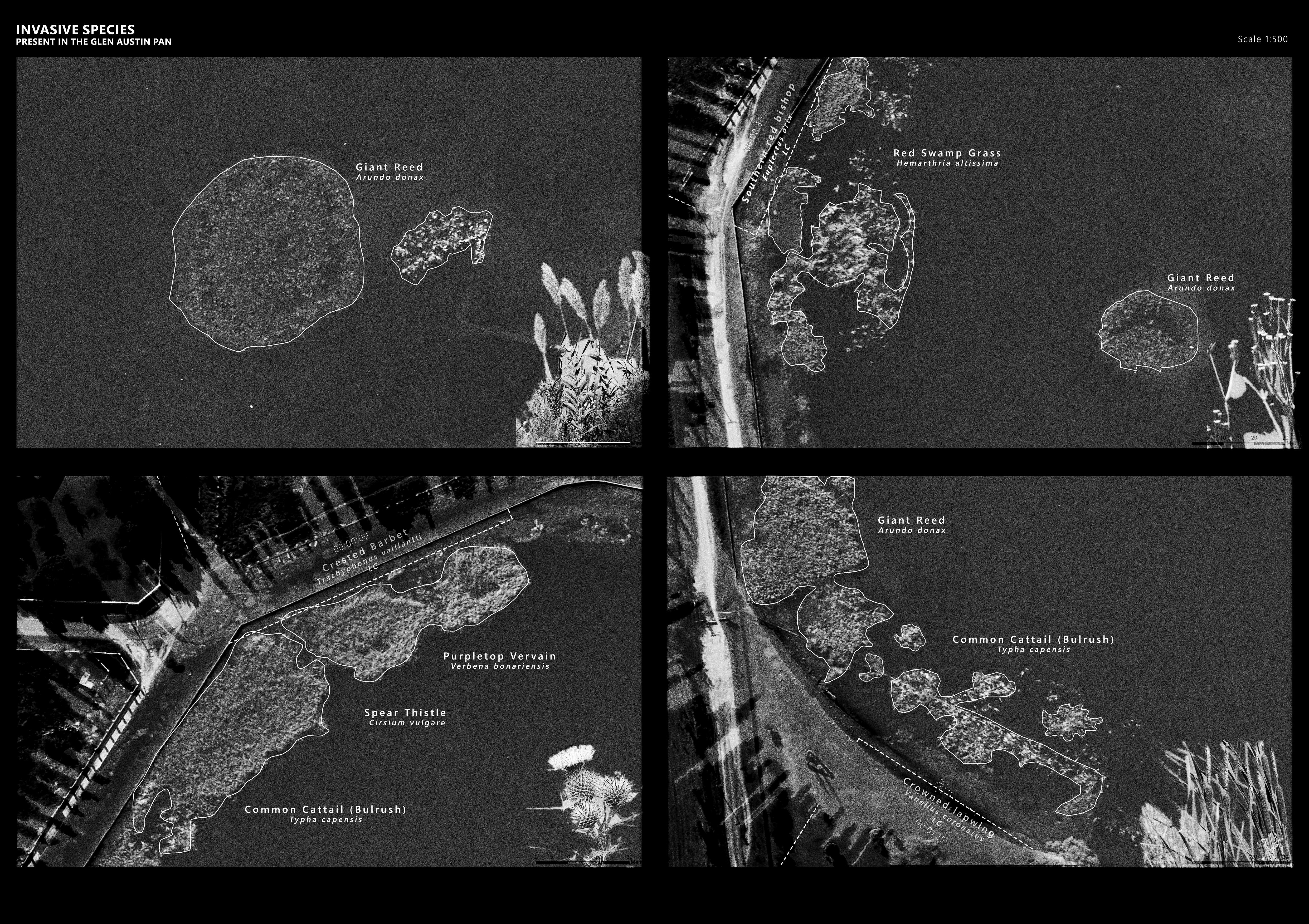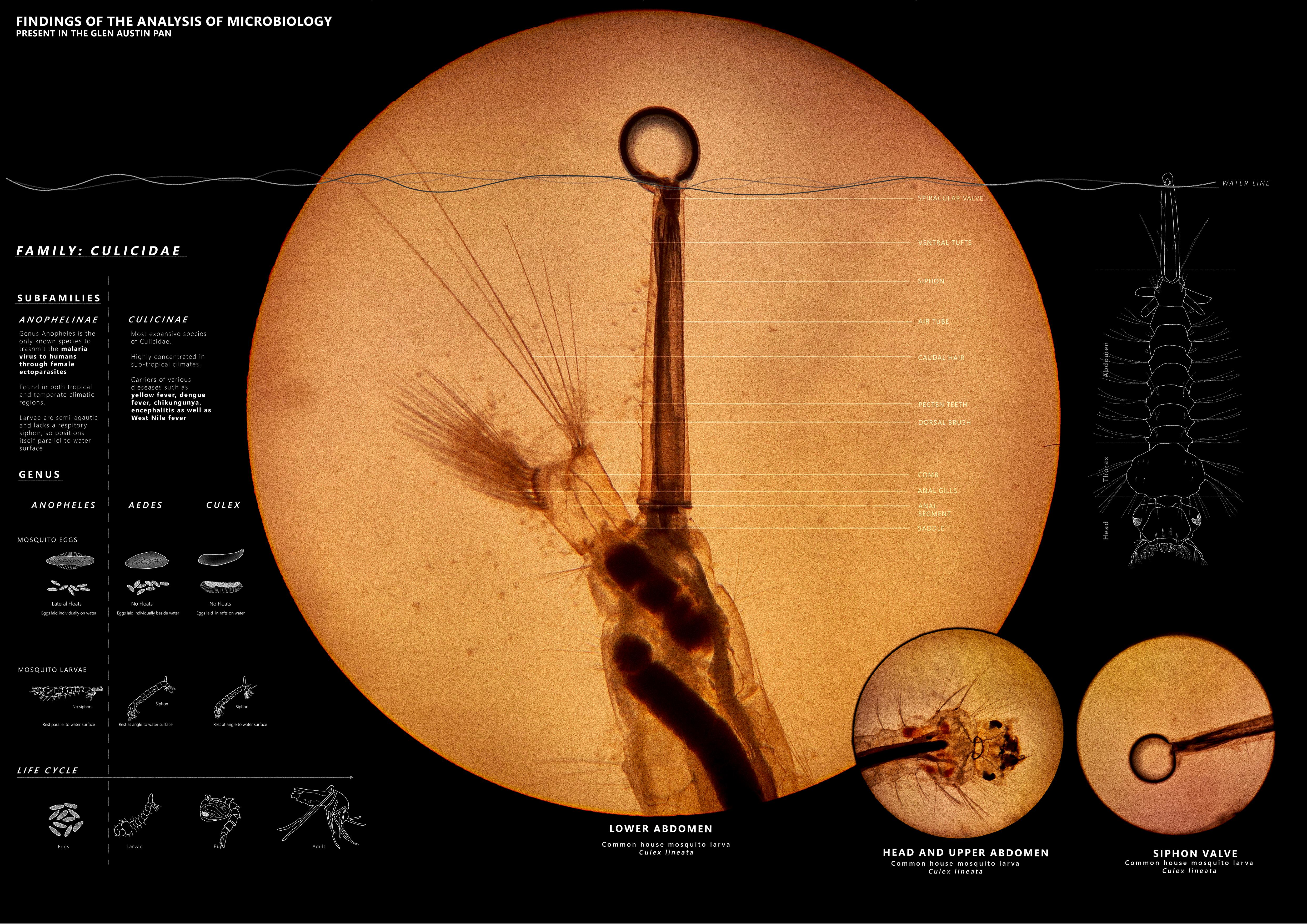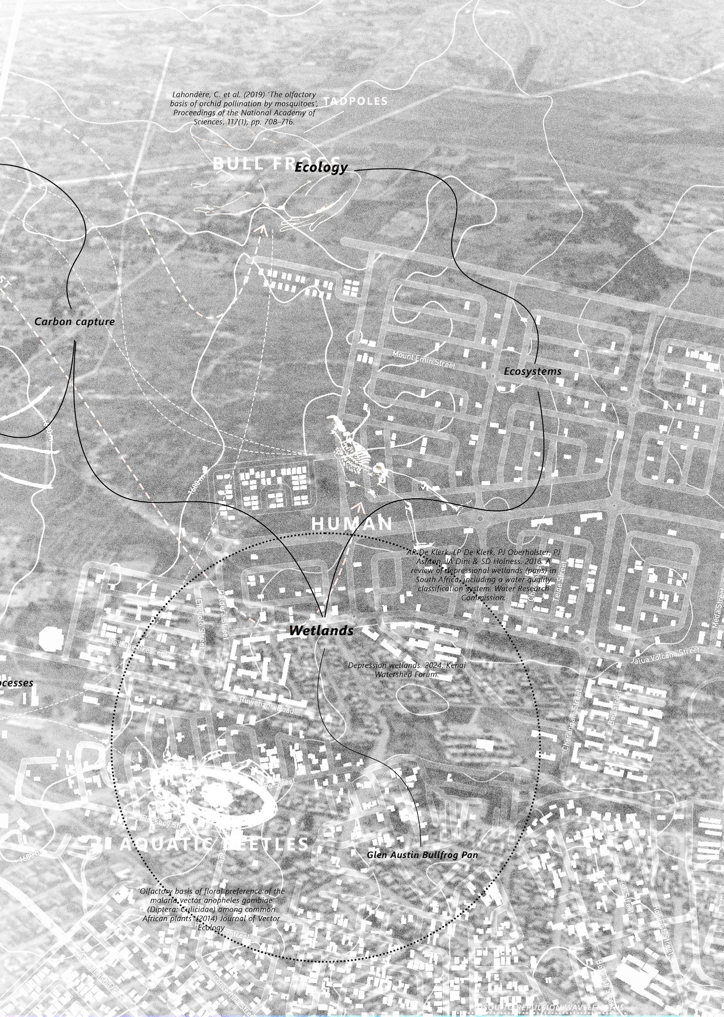 This master’s dissertation is focused on the increasing risk of dissemination of mosquito-borne illness as a direct correlation to climate change. Using the Graduate School of Architecture (GSA) Unit 5’s guidelines, workshops and briefs, this proposal’s intention is to use the speculative potential of architecture to create an adaptive, sustainable and disease preventative proposition. Initial academic and material prompts of my study introduce the exploration of the Glen Austin Bullfrog pan, extensively tracking, exploring and analysing the site in its various ecological intricacies in relation to its both endemic and invasive flora and fauna. The Glen Austin depressional wetland functions as a compelling point of study due to its classification as a conservation site, while simultaneously functioning as a publicly available and accessible site that finds a large influx of public usage through multiple and varied programmes. As the inhabitants of the site include the endangered African Giant Bullfrog ( Pyxicephalus adspersus ) and a variety of bird species that visit throughout the year. My research process incorporates microscopic analysis as an observational method to access the micro-ecology of the site. Initial studies of water and soil samples discovered the mosquito as a species of engagement that will be further investigated.