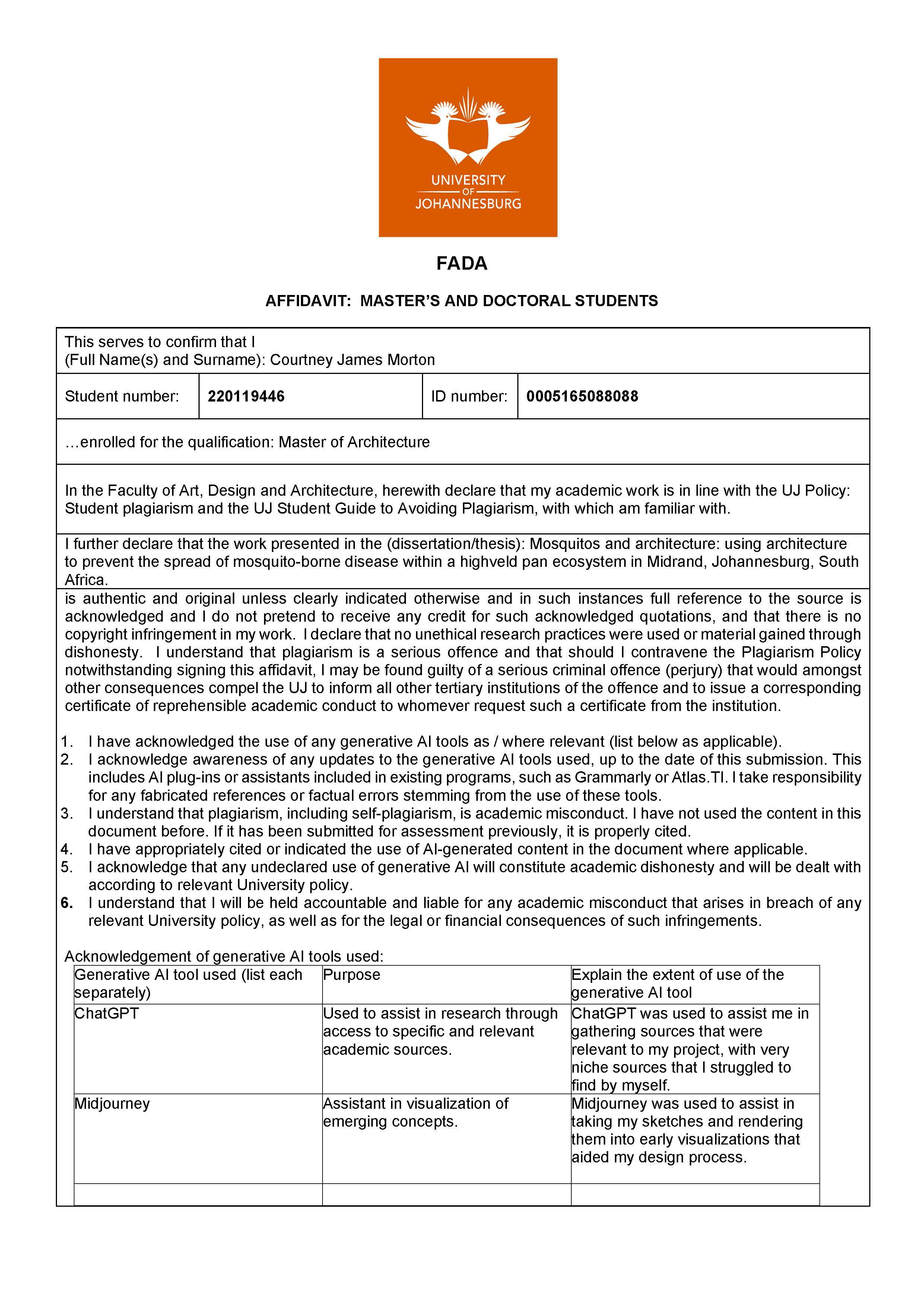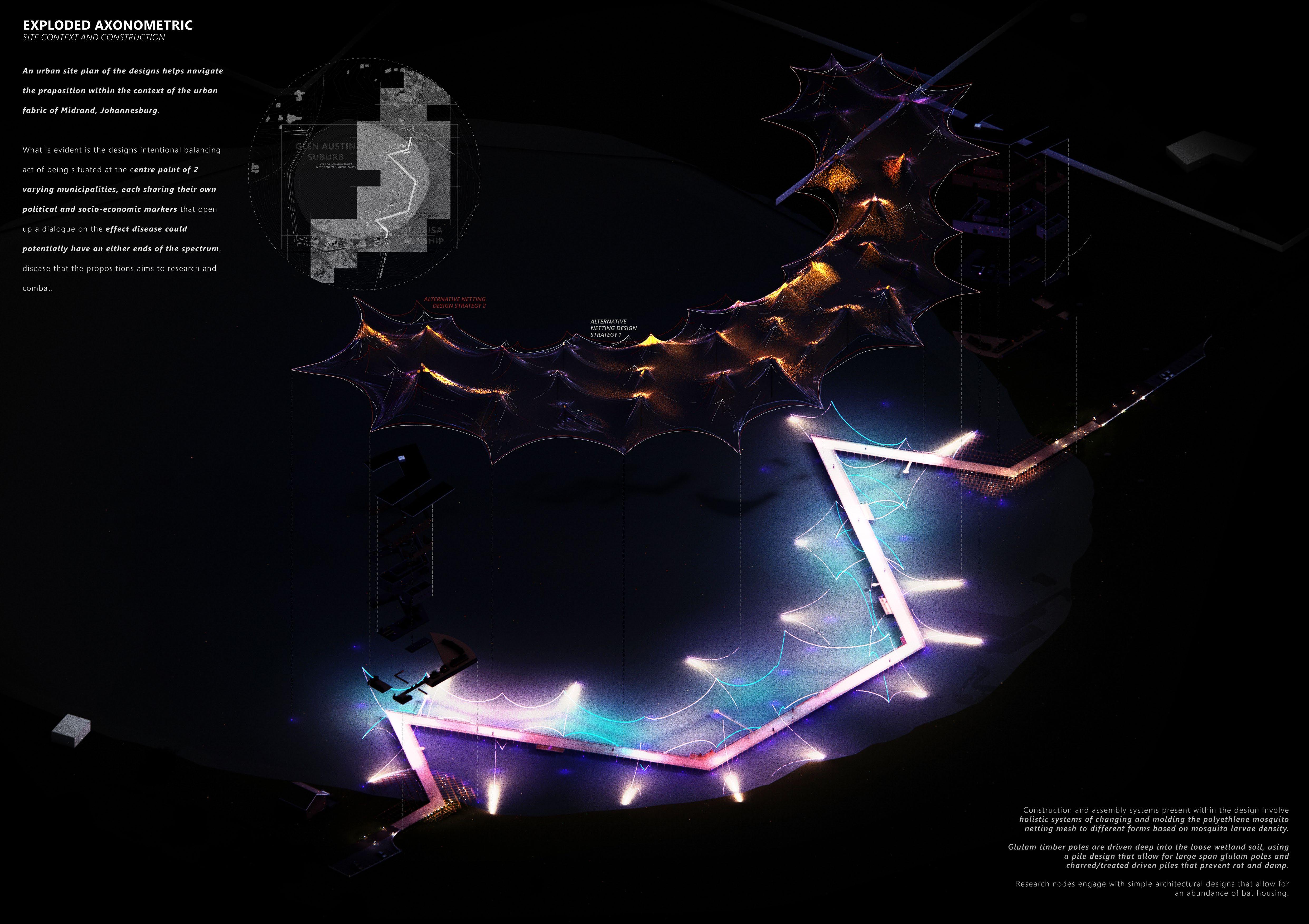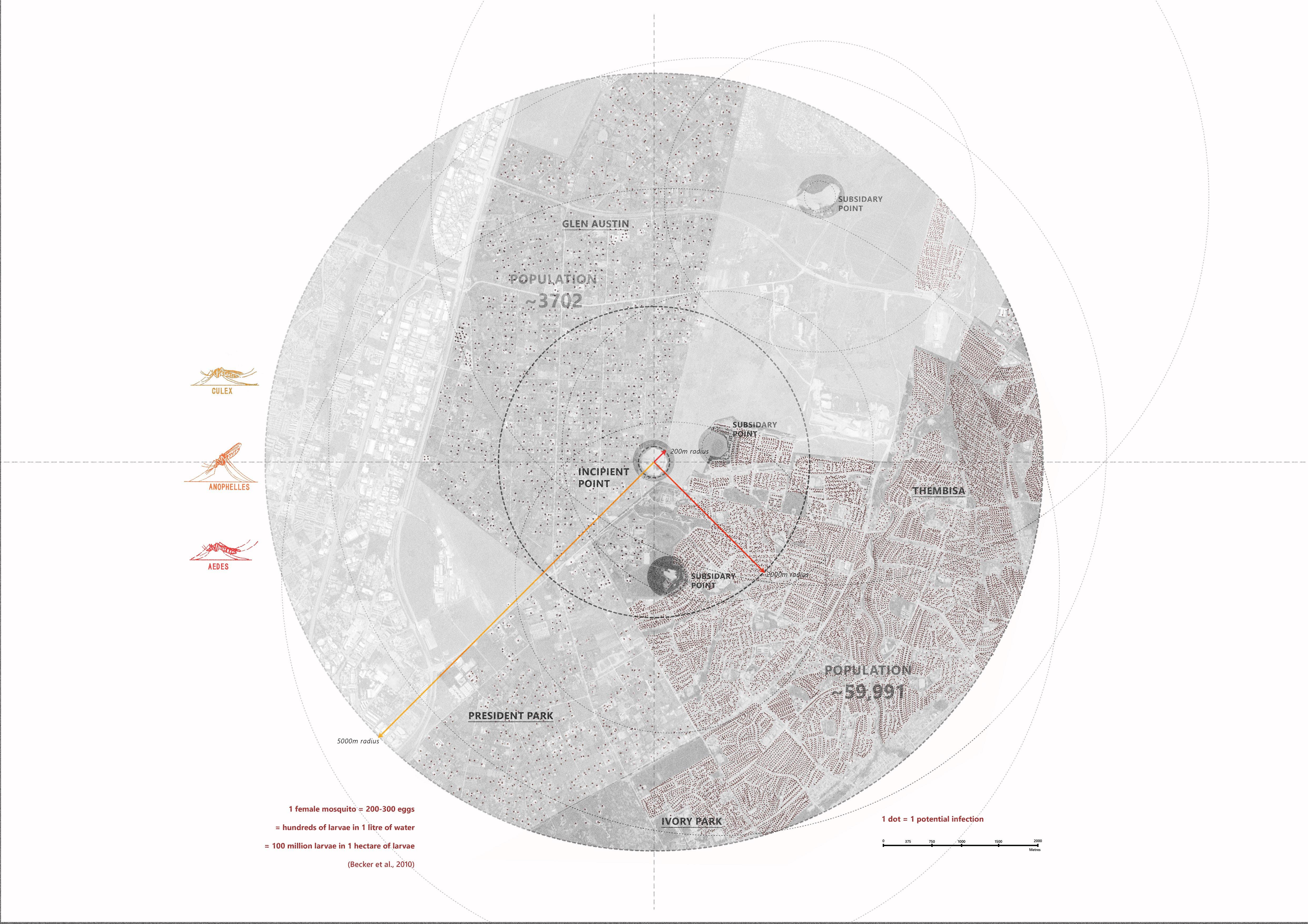 By the year 2030, the world climate is expected to warm by >1.5-degrees. This change is set to be succeeded by a drastic increase in climate related disasters, and the extinction of numerous species, permanently affecting and disrupting ecosystems around the planet. This change in climate not only effects the natural systems of the planet but will also affect the people living within it, presenting problems such as food and water insecurity, overpopulation, destructive weather conditions, and an increase of vector-borne diseases. With rising temperatures and shifting climates, a dramatic rise in disease-infected species reproduction in stagnant water bodies, such as pans, lakes, swamps etc. is increasing in likeliness. Africa has historically been significantly affected by multiple vector-borne diseases. This research project is anticipating this future climatic shift and using it as a lens to engage with how architecture could be implemented to combat or dissipate the potential ecosystem disservices that Johannesburg is set to face due to climate change.