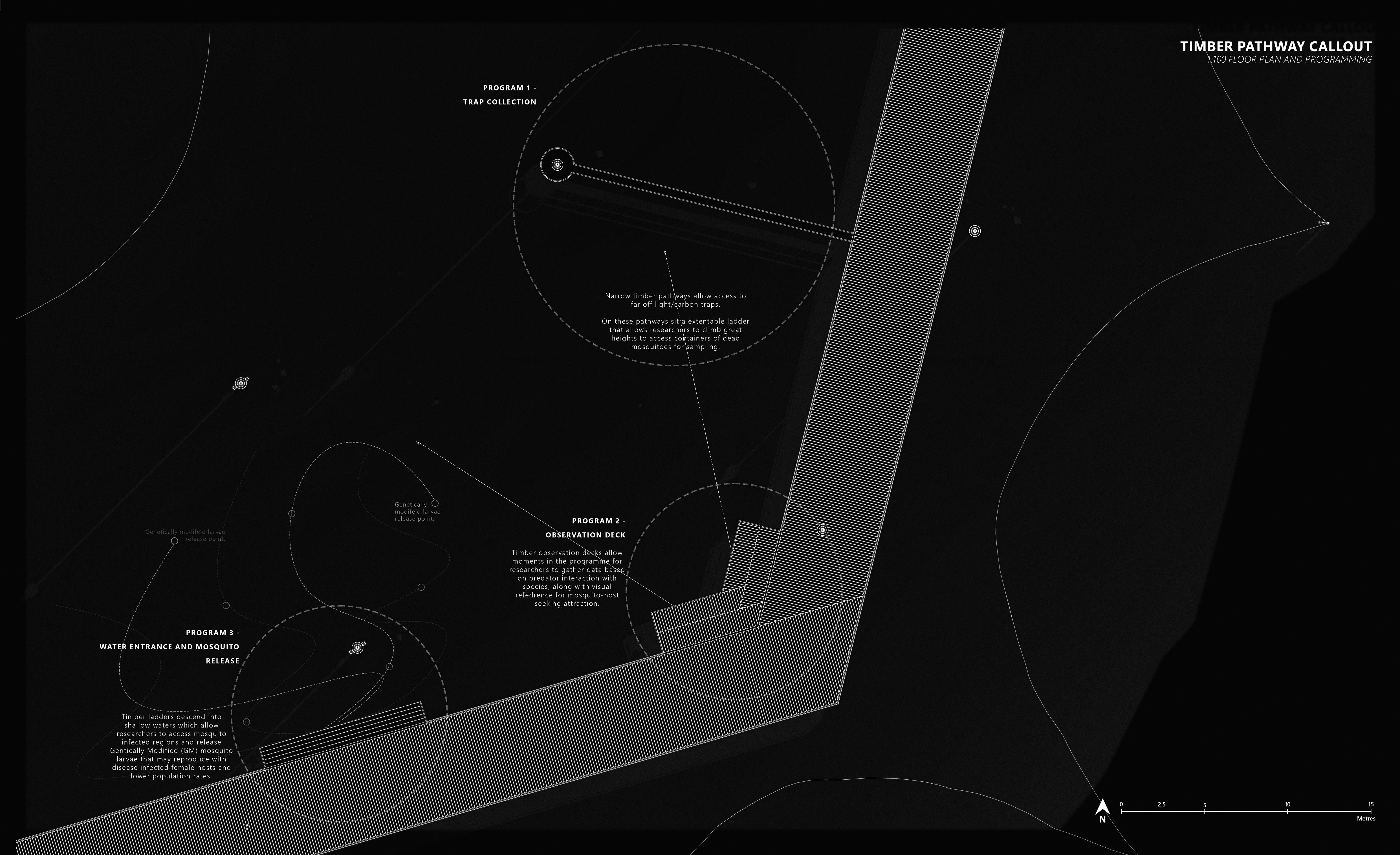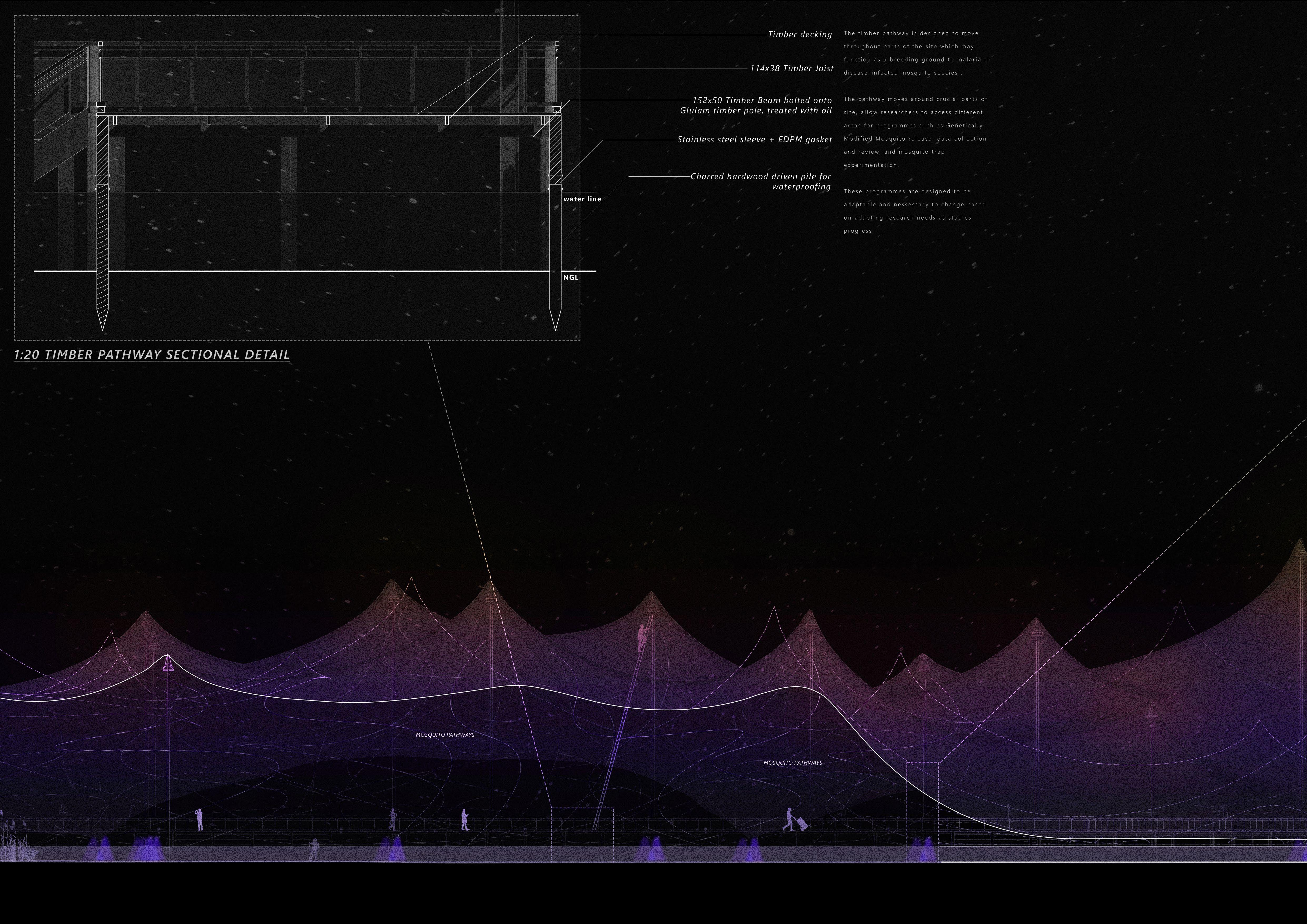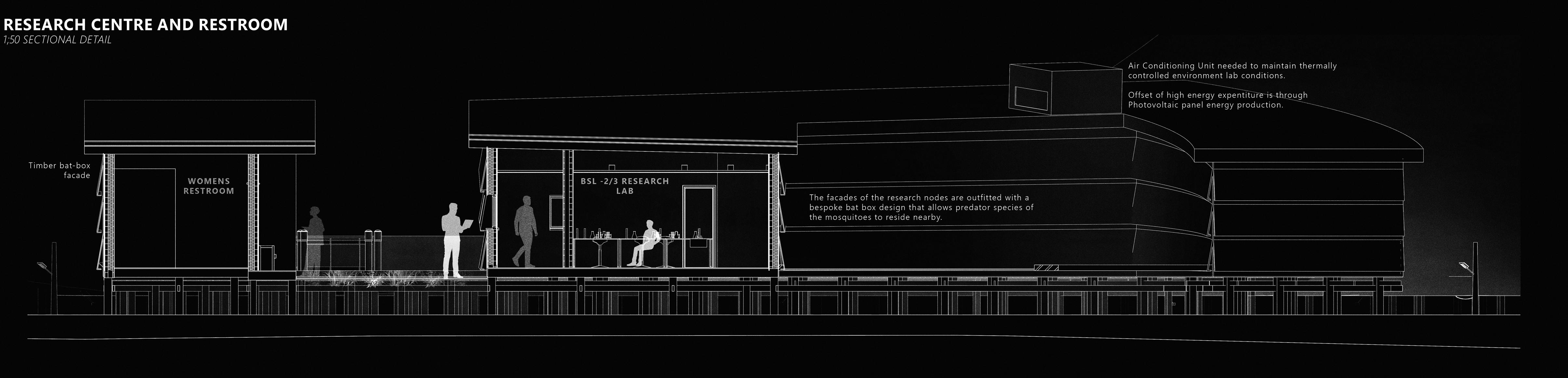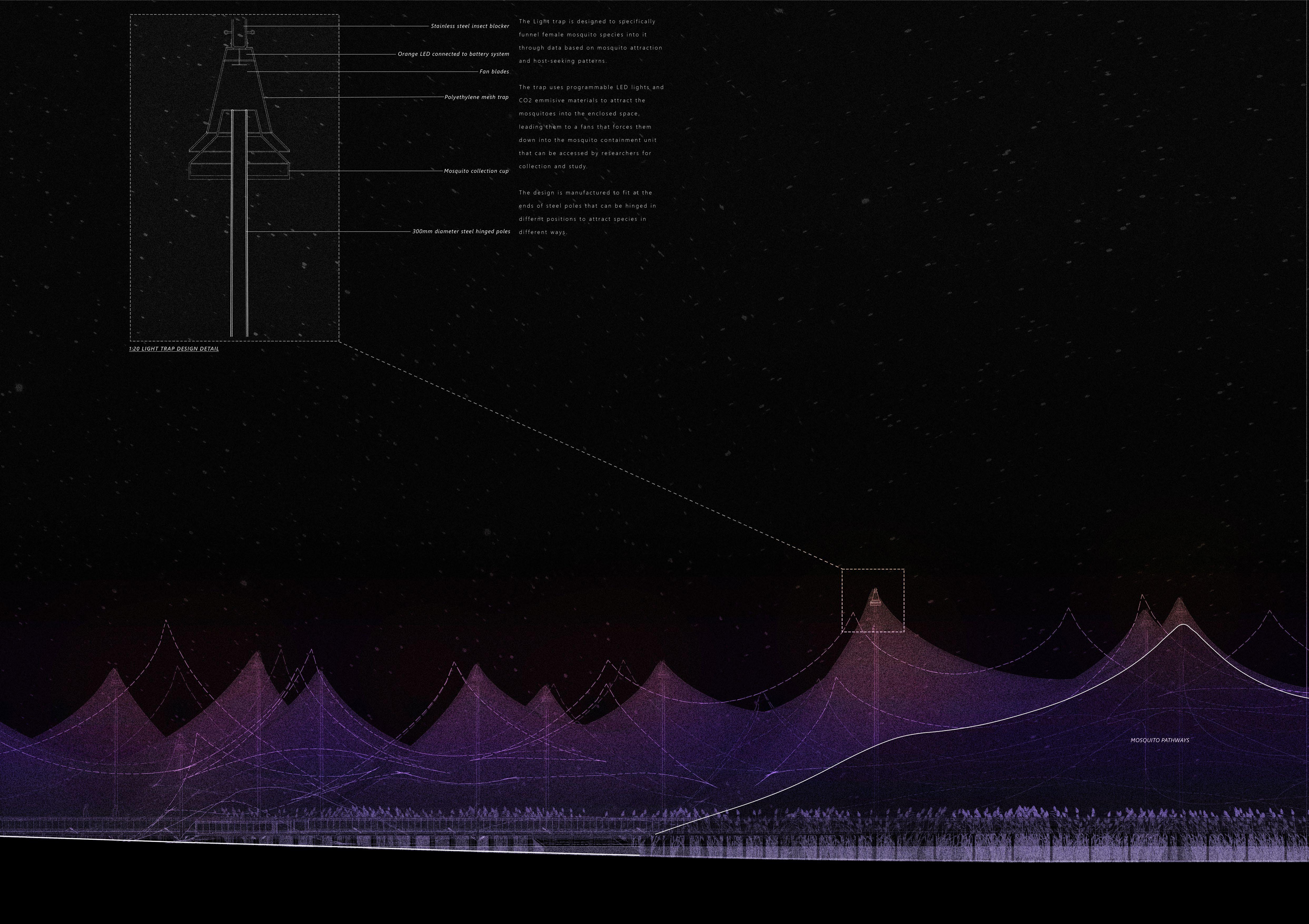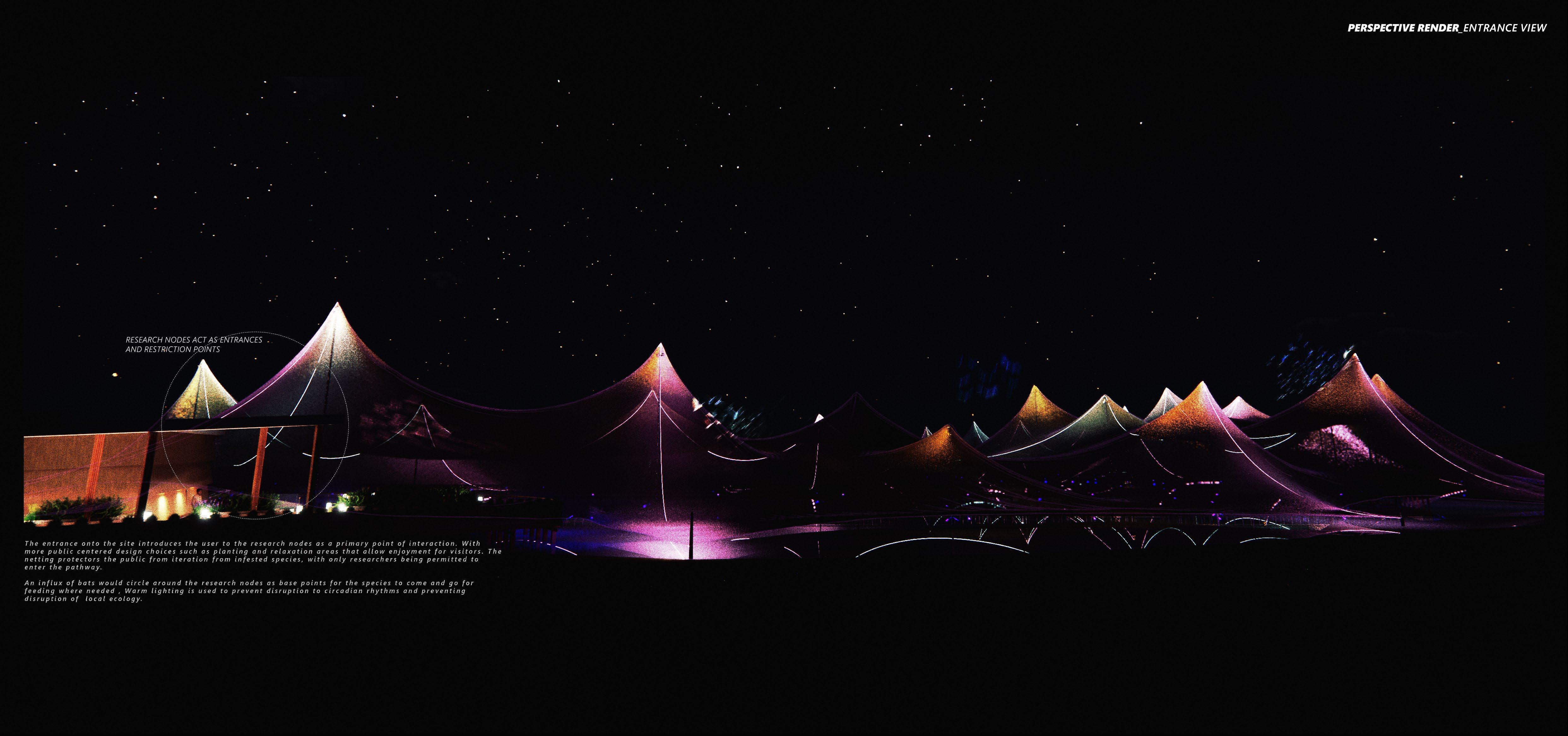 For the rest of the 4th Quarter, I continued to focus on my architectural proposition, consolidating the years’ worth of research into a carefully considered and implemented design. Using the data gathered from my site analysis, my design became much lighter and smaller in scale, growing and shrinking in different places depending on where the population of mosquitoes increased. I engaged with several different typologies that functioned differently based on how I wanted the mosquitoes to be controlled, managed or extracted. This includes spaces that allowed for bat movement, spaces where human interaction is most important, and spaces that are used to collect and remove masses of mosquitoes from specific regions. I found this process to be especially challenging in both technical and conceptual aspects, as I feel the design needs to be carefully considered due to the highrisk environment. Moreover, it was recommended that I think of my project in ways that could be implemented at varied scale in different parts of the world as an effective combatant to the spread of vector-borne disease, which I would still like to potentially consider.