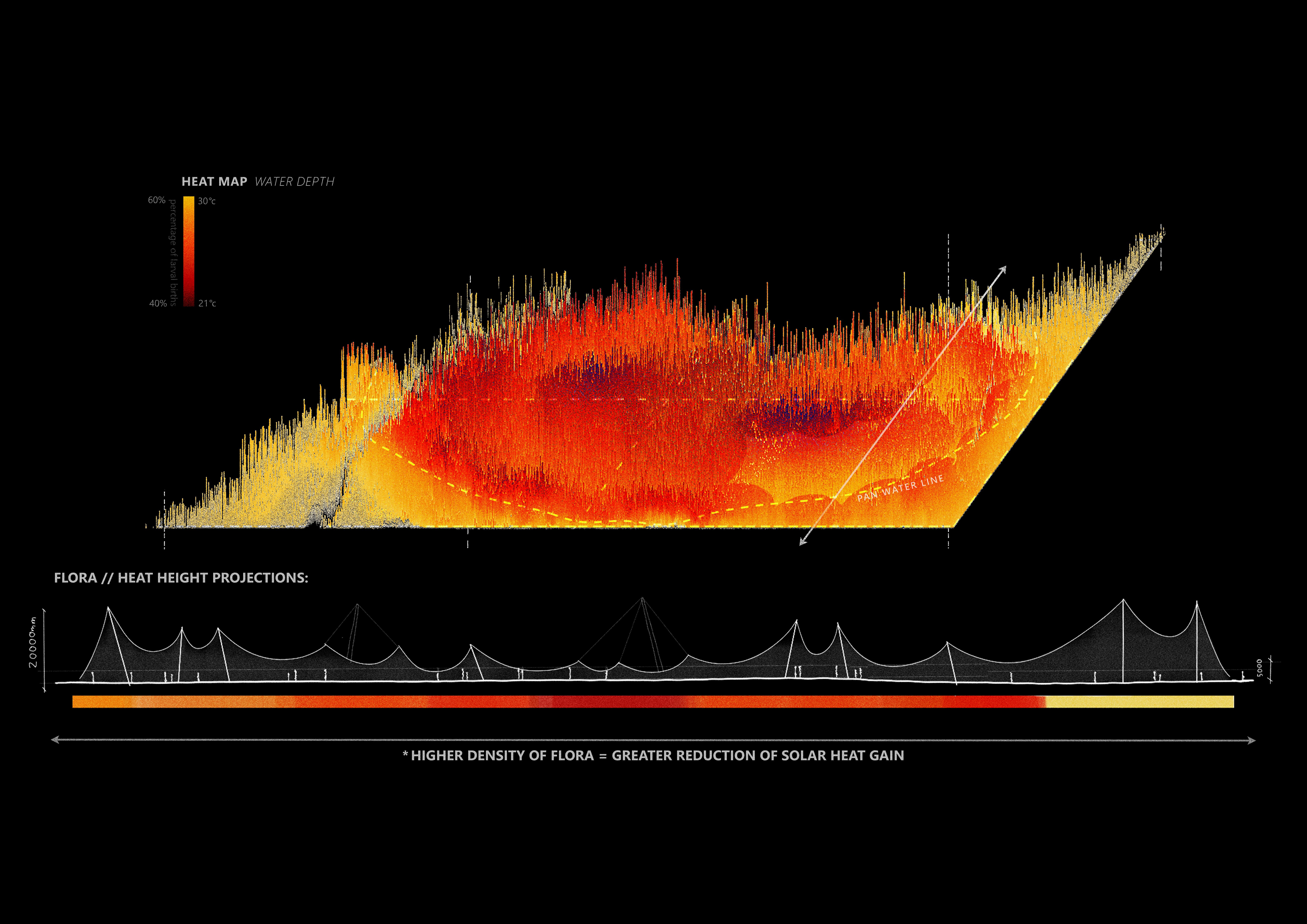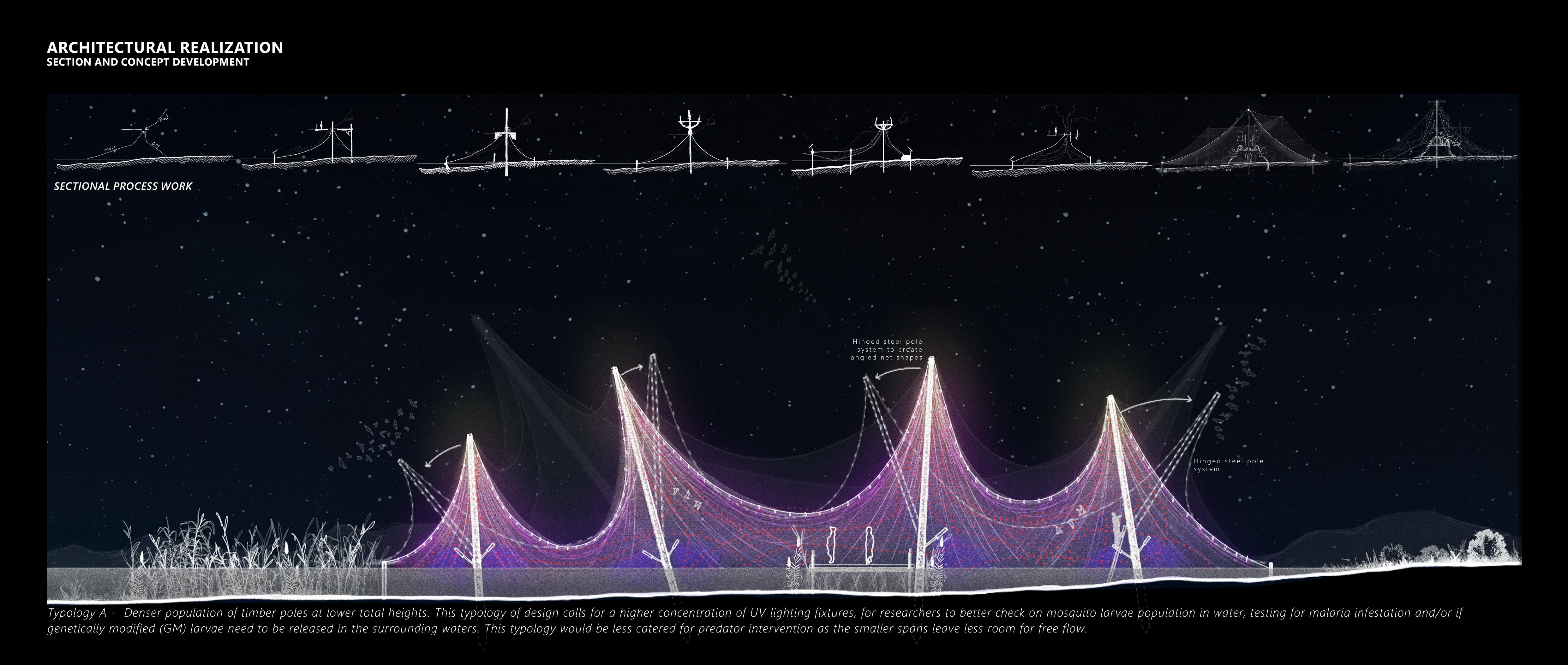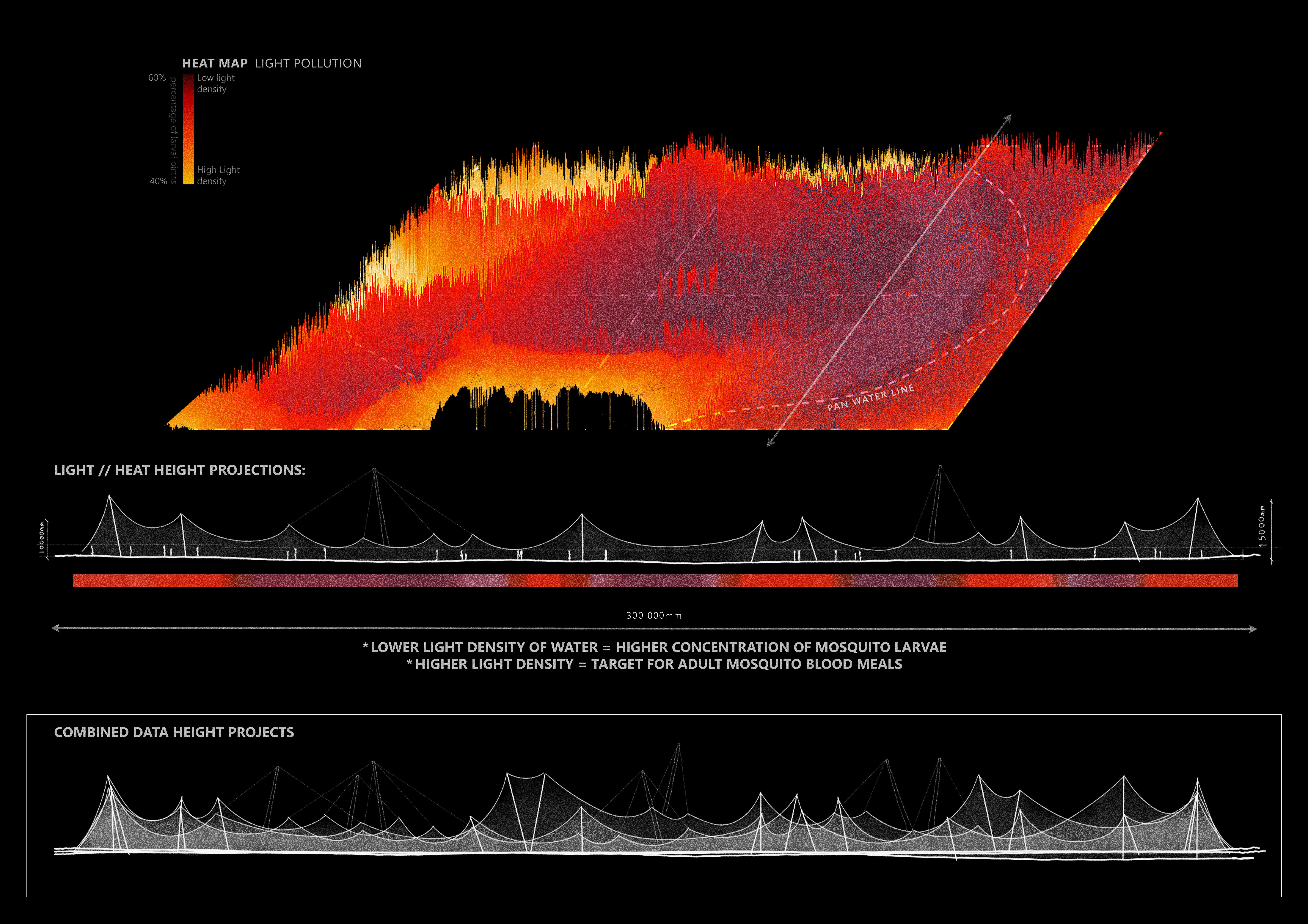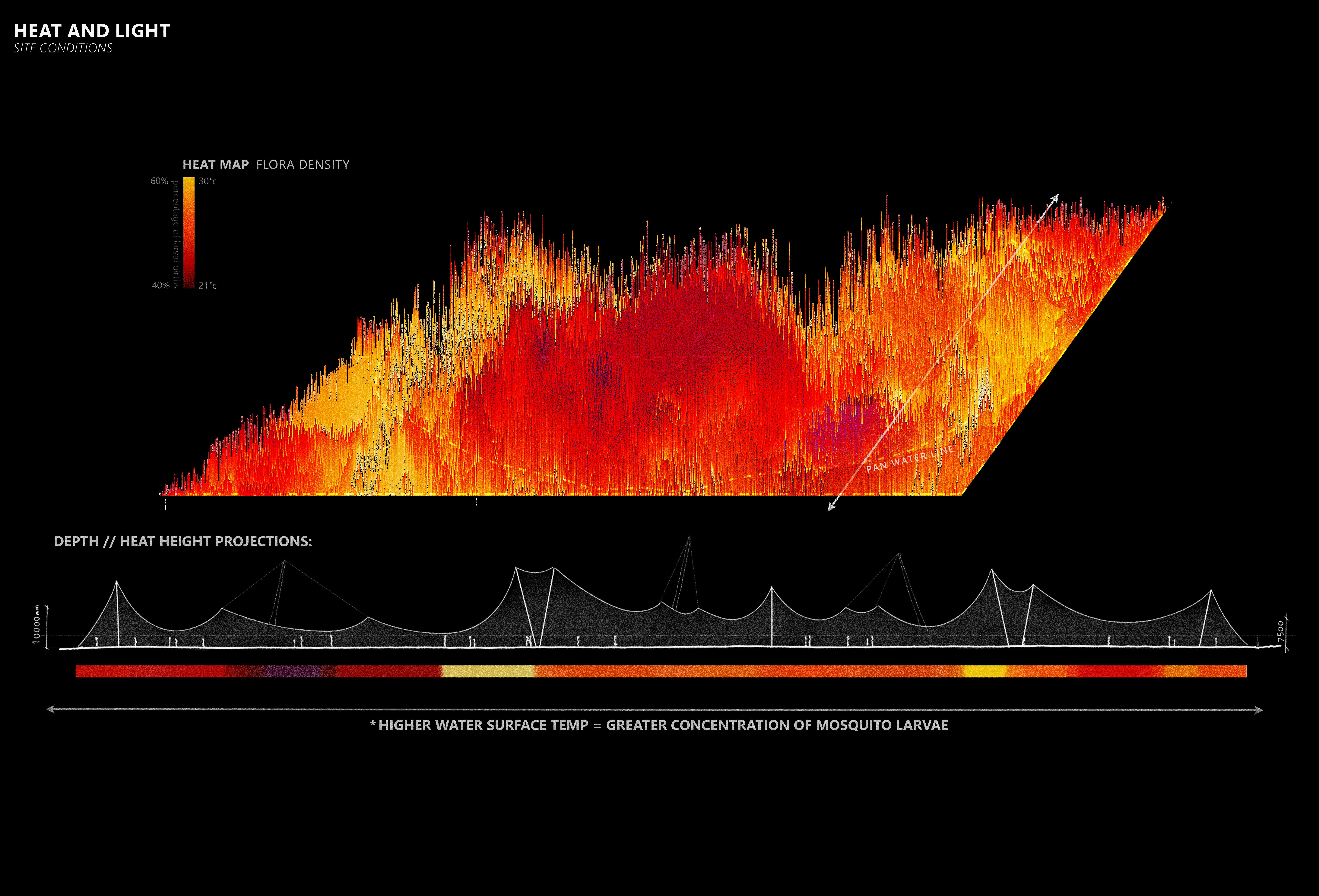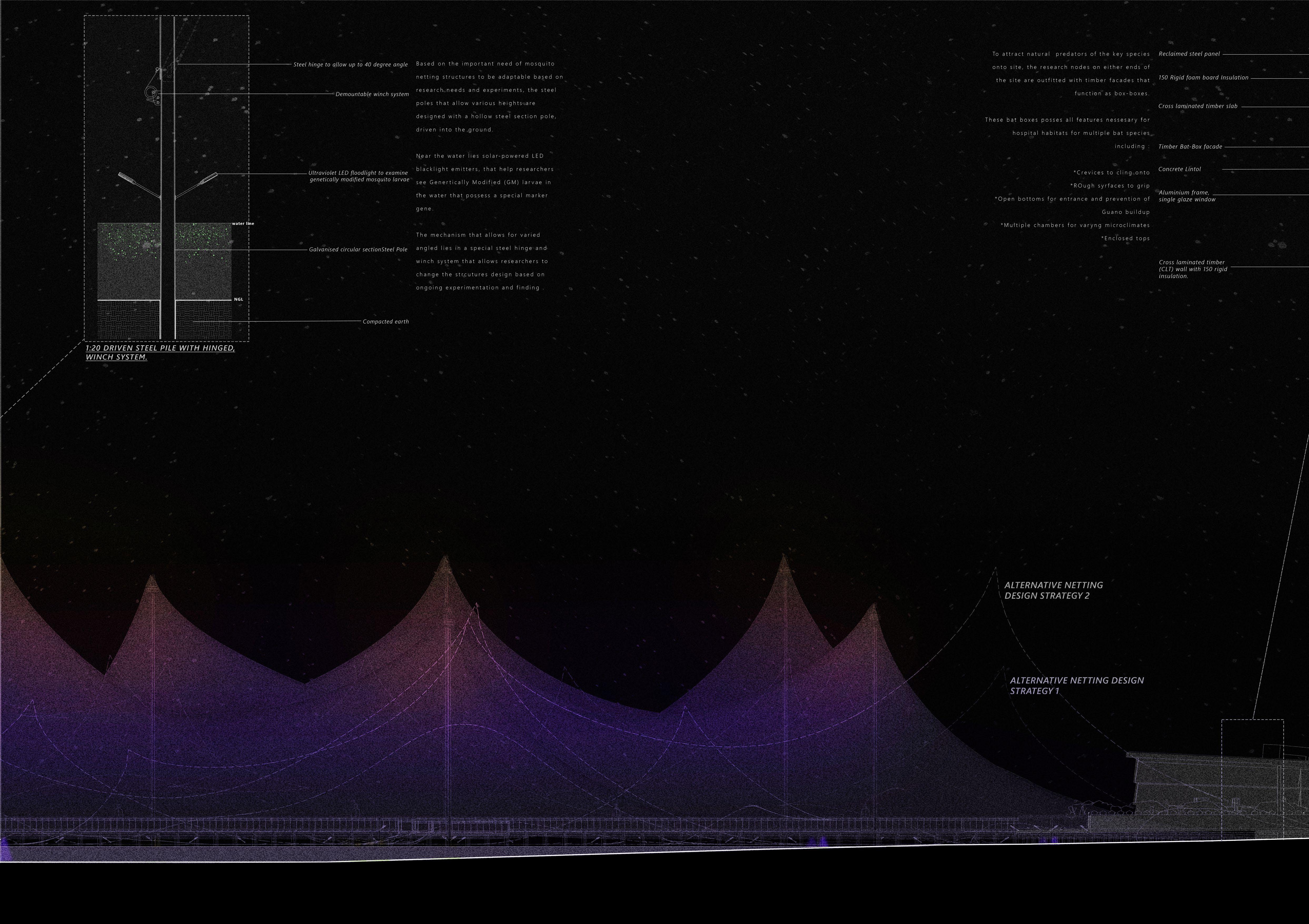 In Quarter 3 I began to use more plan and section scale drawings to engage with the site differently and explore how I could experiment with space and form to better control and guide mosquitoes born within the water to designated spots. The form of my design needed to be carefully designed to cover areas at which were most likely to house disease-bore mosquitoes. Through a series of 3-dimensional heat maps that analyzed the site through the lens of water depth, flora and artificial light, I began to understand how an architectural design could better adapt to the surrounding context. Through taking sections of the heat maps, and understanding the density of heat at certain points, I was further able to extract height data from the diagrams that provided a strong reference point for my potential intervention for the tensile structure. Throughout the rest of Quarter 3 I continued to refine my design, understanding what architectural routes I could take to most effectively control mosquitoes born within ‘heat zones’, along with this, I used my analysis of the sites existing ecological systems to help adapt designs that could promote the use of natural predators into my design, most prevalently birds and bats. Along with the design of my research centers to be used by students/researchers, I used these nodes as an opportunity to design bat housing units that could fit onto the walls of the structure, functioning as a façade that could invite the species into the area.