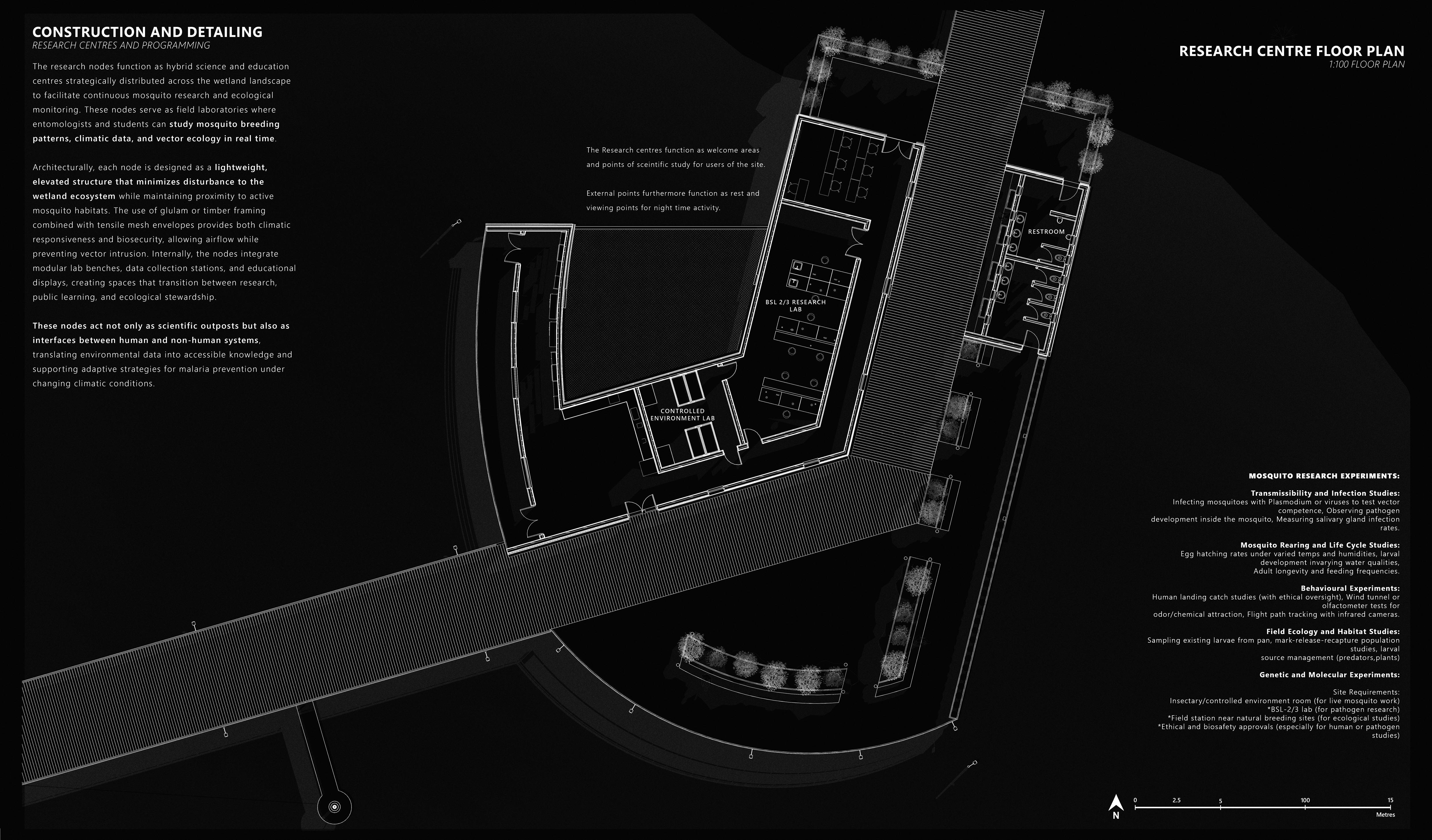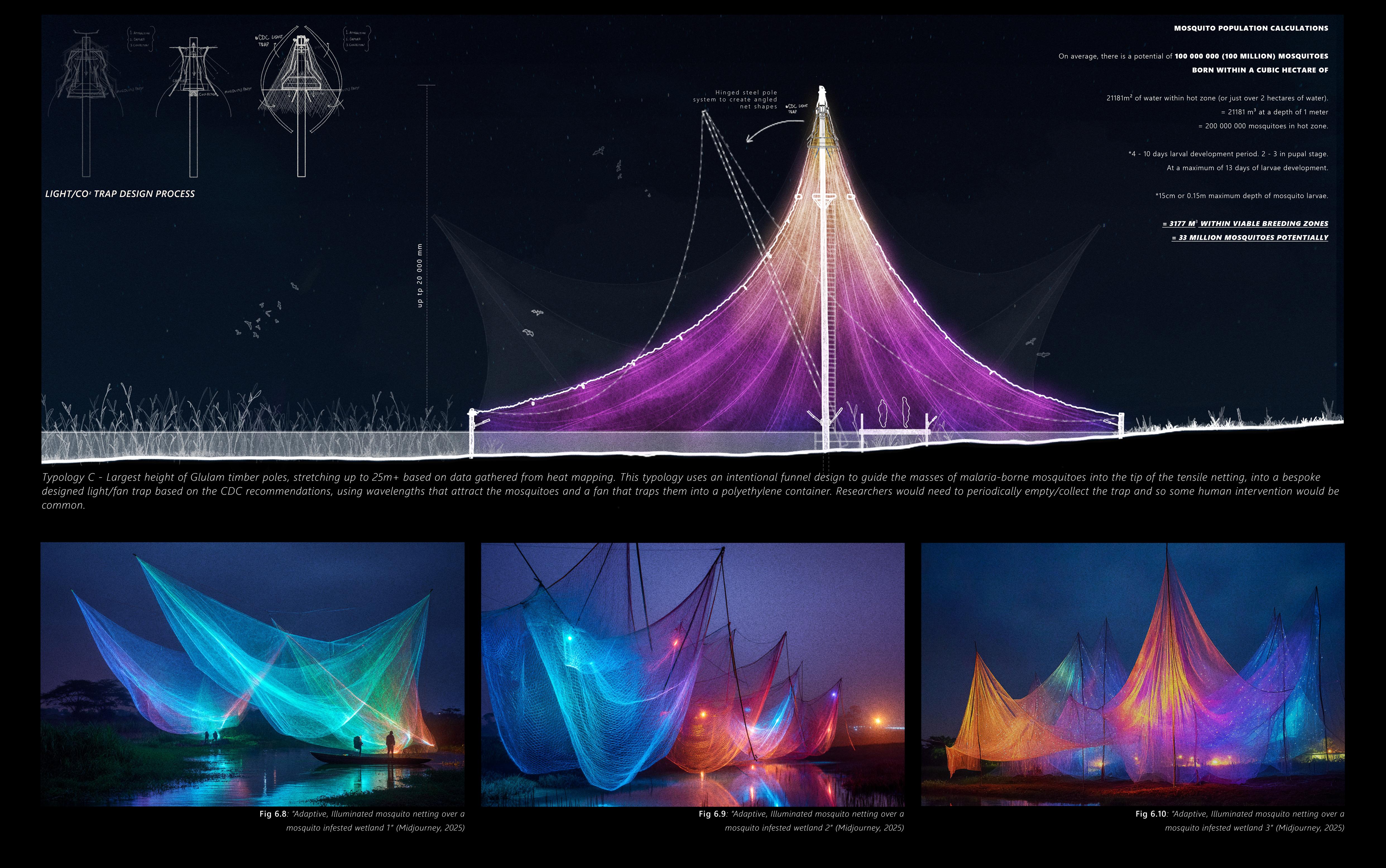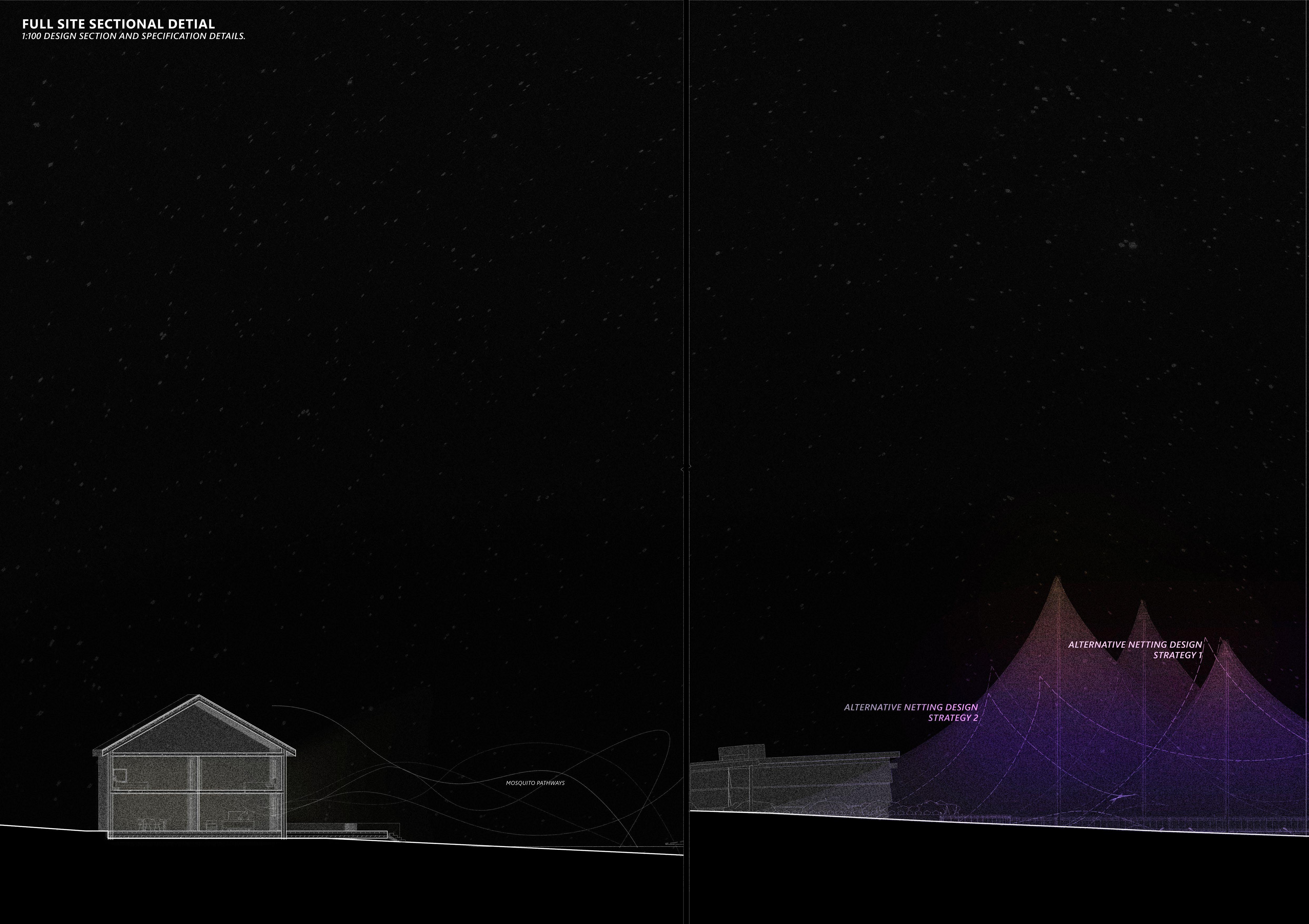 The final quarter required consolidation: synthesizing a year’s worth of research, experimentation, and feedback into a coherent architectural proposition. Entering Q4, I had a strong conceptual foundation but needed to refine clarity, scale, and technical resolution. I went into Quarter 4 with a good idea of the outcomes I would like to achieve by the end of the year. Comments made after my reviews explained that I needed to work on the clarity of my posters to help examiners better understand the thought/design process of my work and the reasoning for my design choices. It was also explained how I needed to experiment more with my tensile roofing structure, as the moderators found it to be too static, obtrusive and great in scale; with an emphasis on my drawings not displaying the materiality and experiential elements of my design being properly conveyed. Making feedback for my presentation explained how I needed to position the proposition in such a way that the structure advocates for awareness and more exploration of materials that can provide such advocacy and lean towards a more tailored specification of details that talk to the awareness aspect. It was also suggested that I could use a white bedding sheet that could be overlayed on top of coloured lighting at night, as a physical test that could represent and experiment with which light wave spectrum’s could influence movement of mosquitoes most effectively. I found these comments to be helpful, particularly with how I try to convey information and how to improve clarity of my drawings to help others better understand my process.