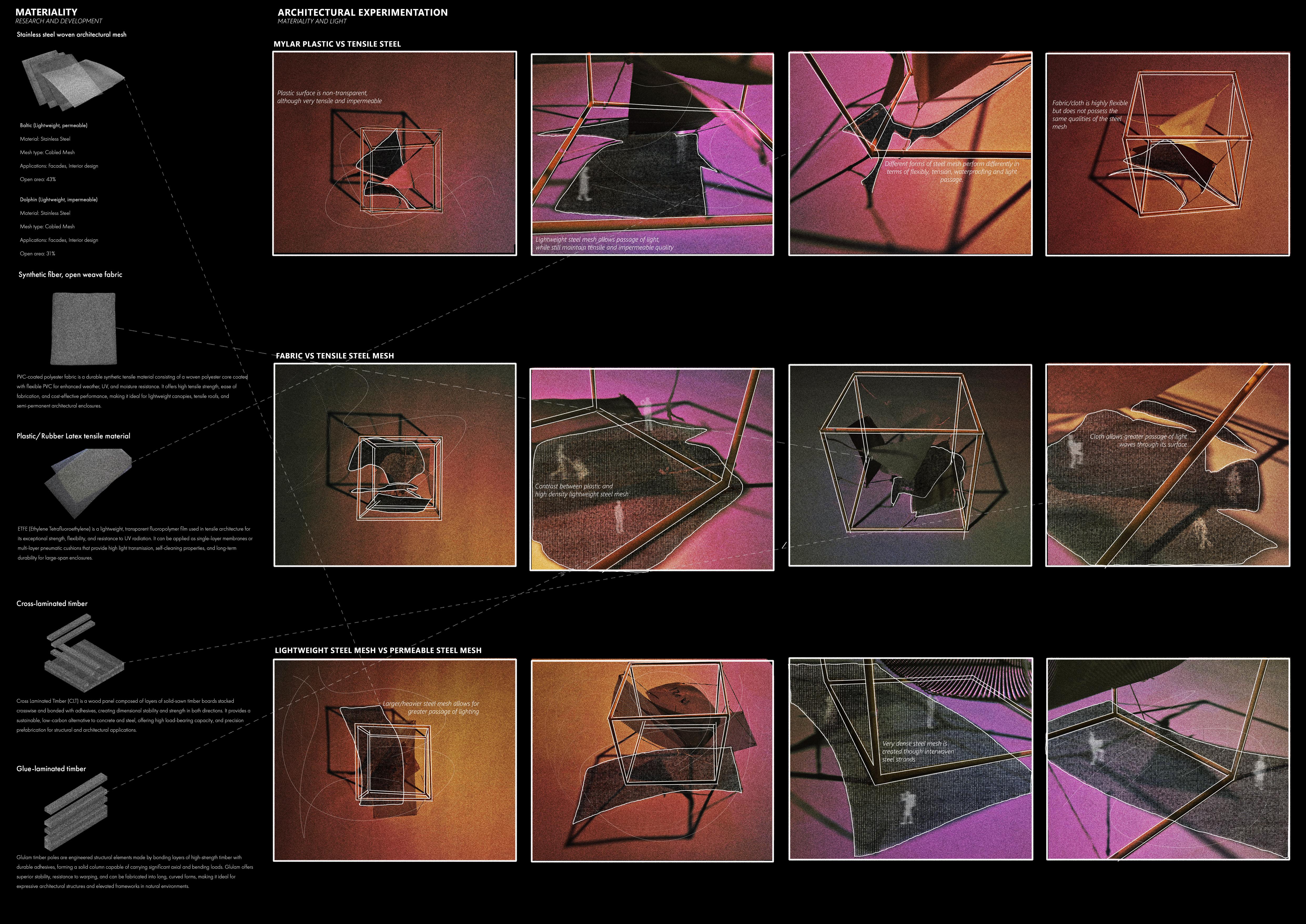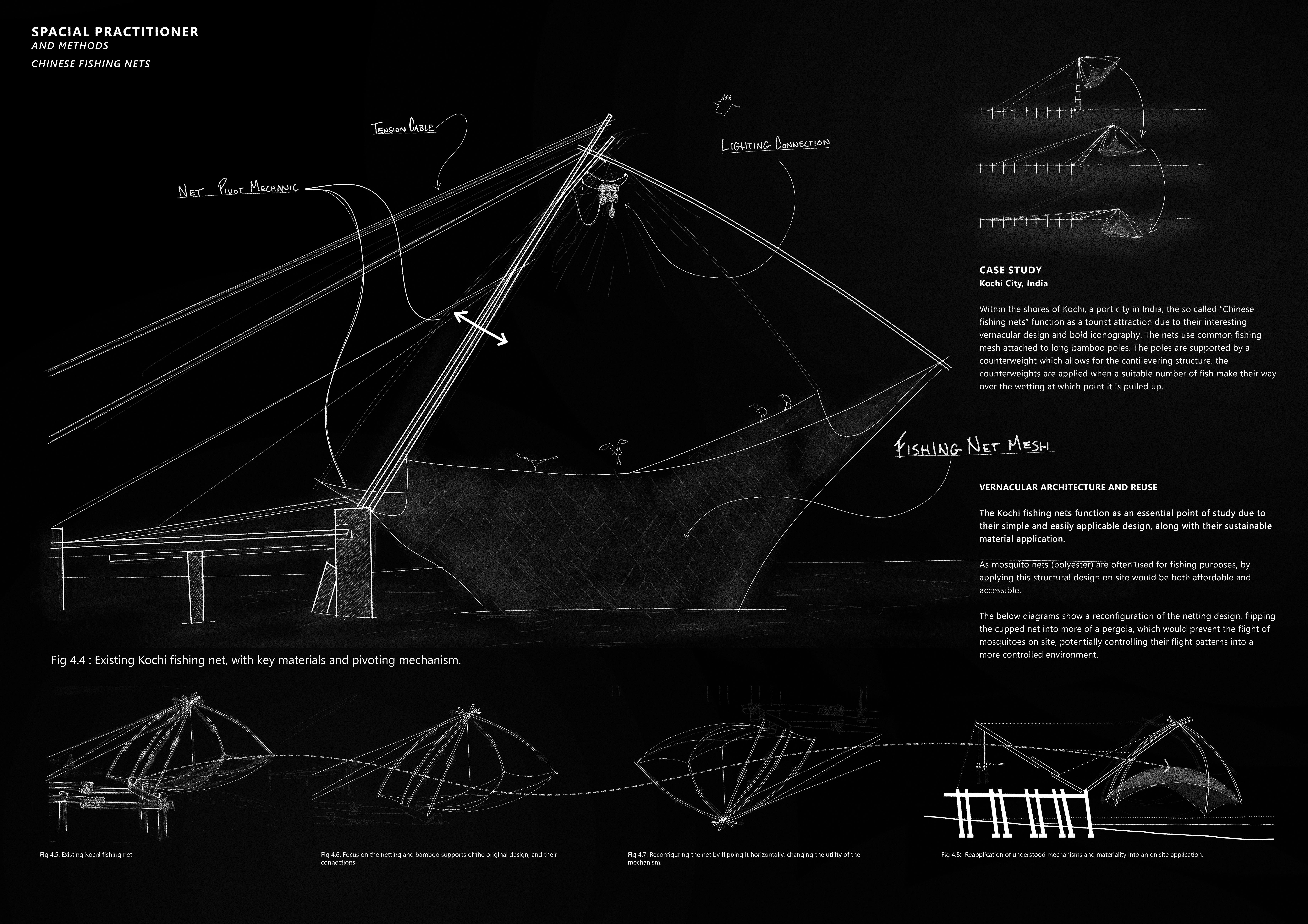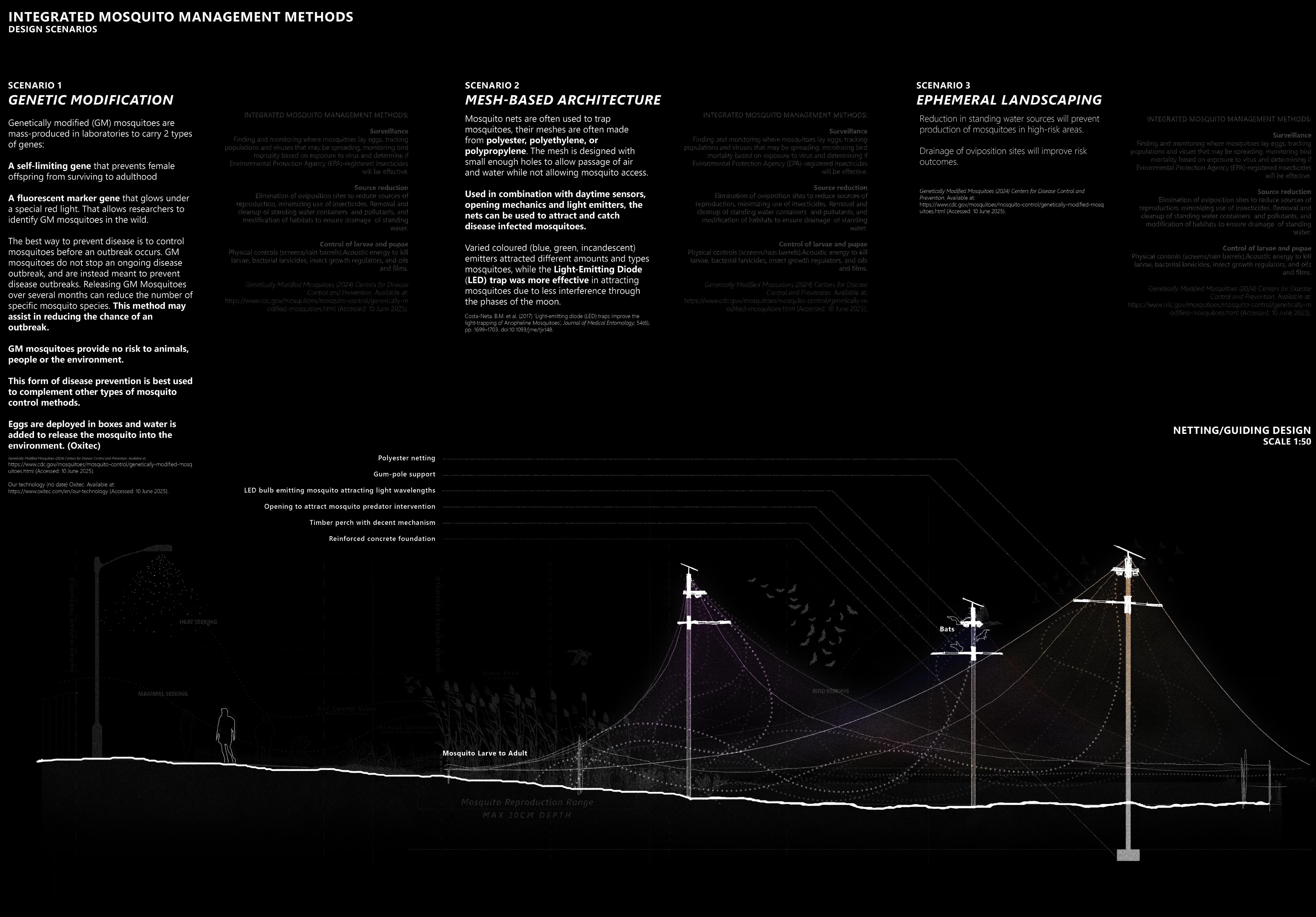 The final quarter required consolidation: synthesizing a year’s worth of research, experimentation, and feedback into a coherent architectural proposition. Entering Q4, I had a strong conceptual foundation but needed to refine clarity, scale, and technical resolution. I went into Quarter 4 with a good idea of the outcomes I would like to achieve by the end of the year. Comments made after my reviews explained that I needed to work on the clarity of my posters to help examiners better understand the thought/design process of my work and the reasoning for my design choices. It was also explained how I needed to experiment more with my tensile roofing structure, as the moderators found it to be too static, obtrusive and great in scale; with an emphasis on my drawings not displaying the materiality and experiential elements of my design being properly conveyed. Making feedback for my presentation explained how I needed to position the proposition in such a way that the structure advocates for awareness and more exploration of materials that can provide such advocacy and lean towards a more tailored specification of details that talk to the awareness aspect. It was also suggested that I could use a white bedding sheet that could be overlayed on top of coloured lighting at night, as a physical test that could represent and experiment with which light wave spectrum’s could influence movement of mosquitoes most effectively. I found these comments to be helpful, particularly with how I try to convey information and how to improve clarity of my drawings to help others better understand my process.