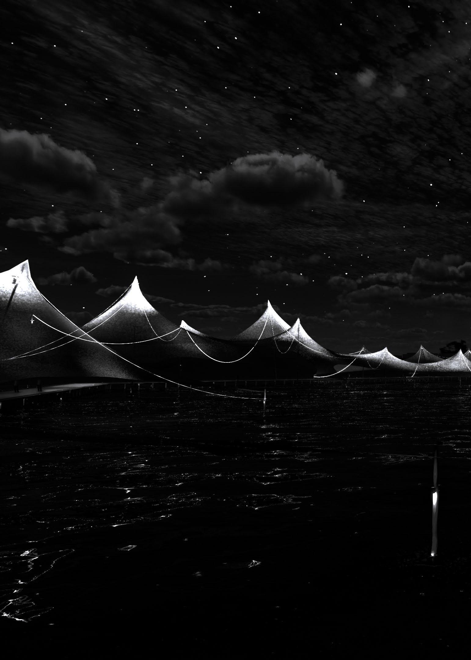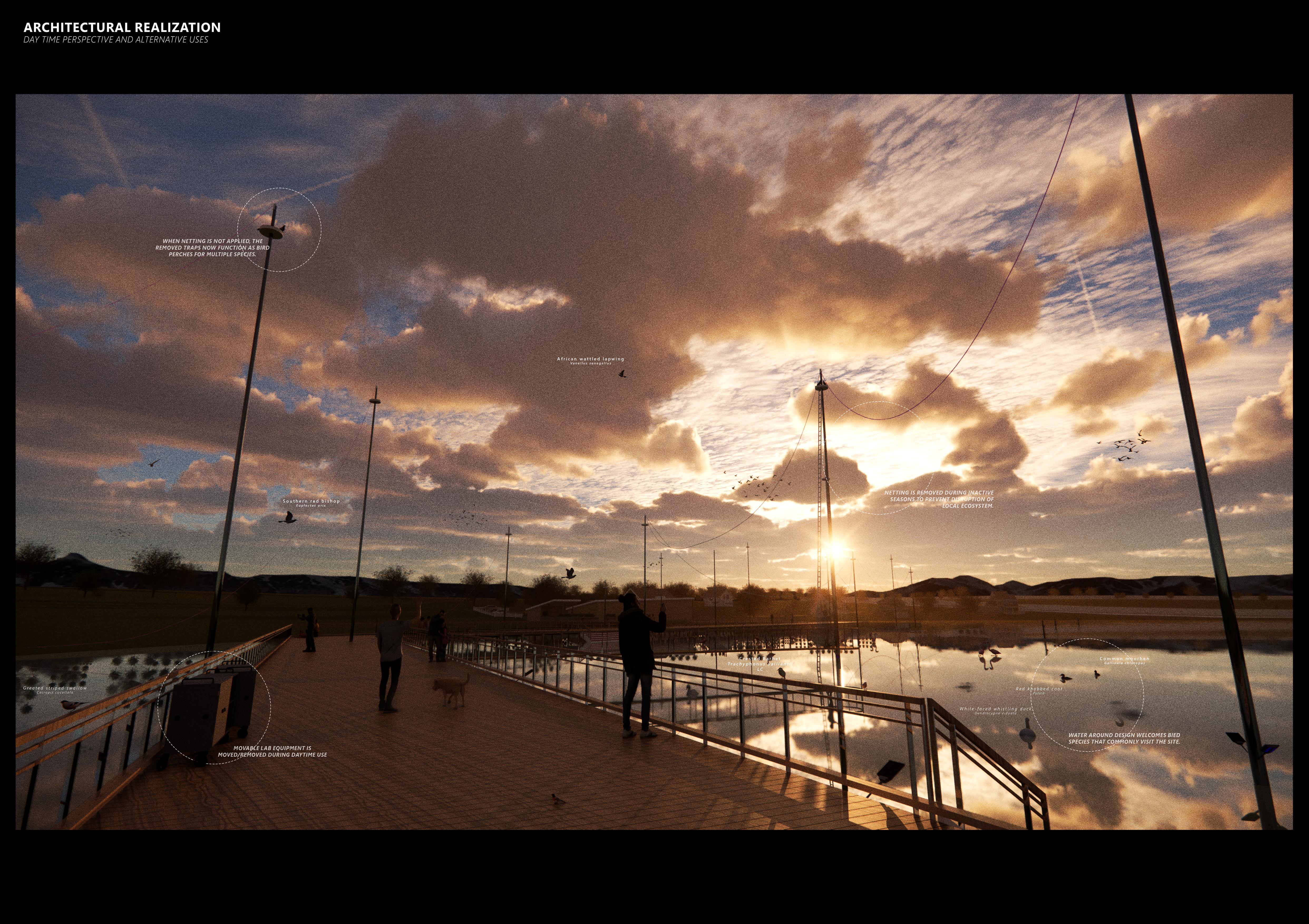 A day-time perspective of the design shows how the net and poles can be manipulated to allow public access to both endemic species and humans. Opening up a plethora of new programmes that could take place within the site. The existing poles are kept to act as perches for the multiple bird species in the pan, while the pathway itself allows for viewing of the pan, birdwatching, exercise etc.